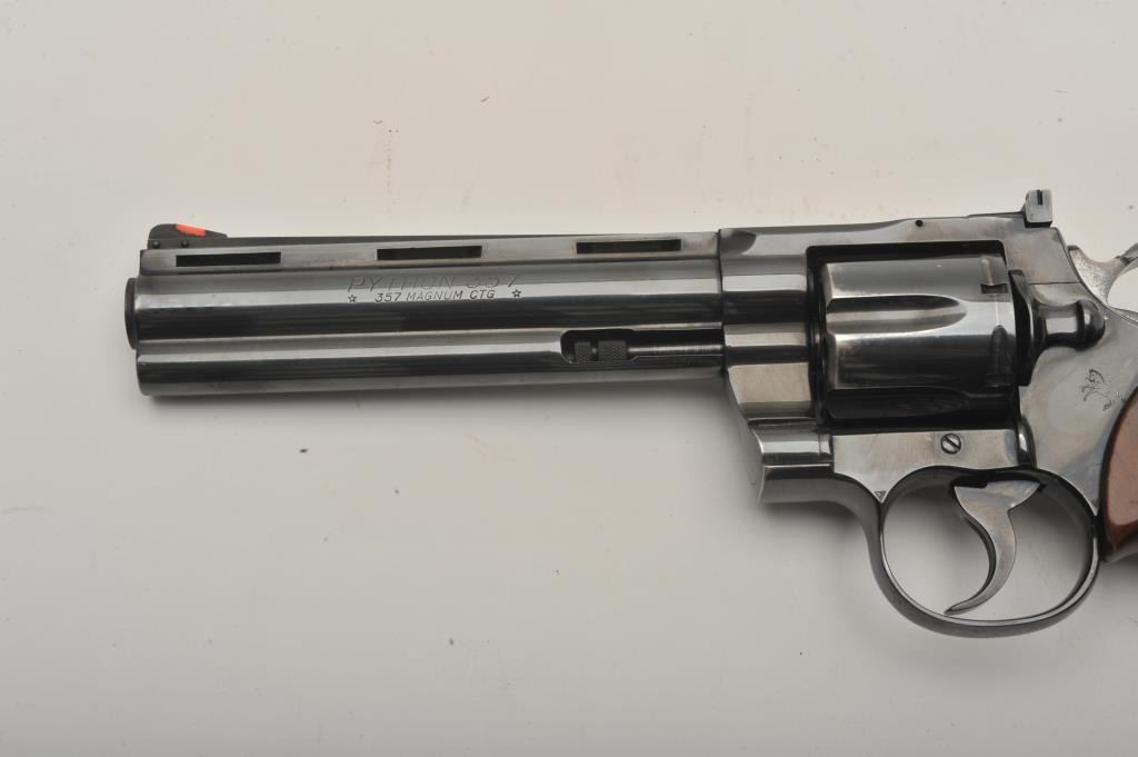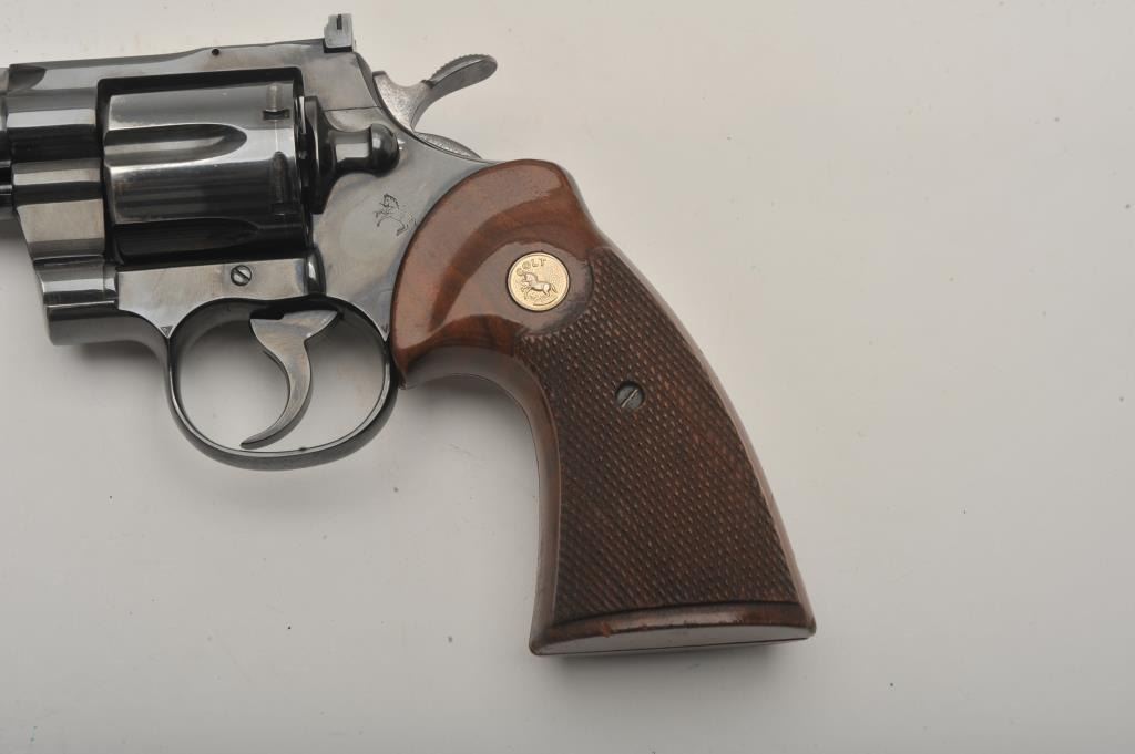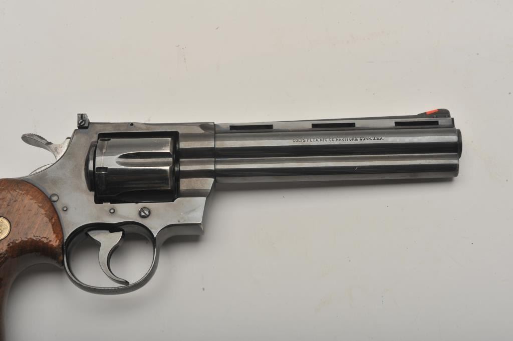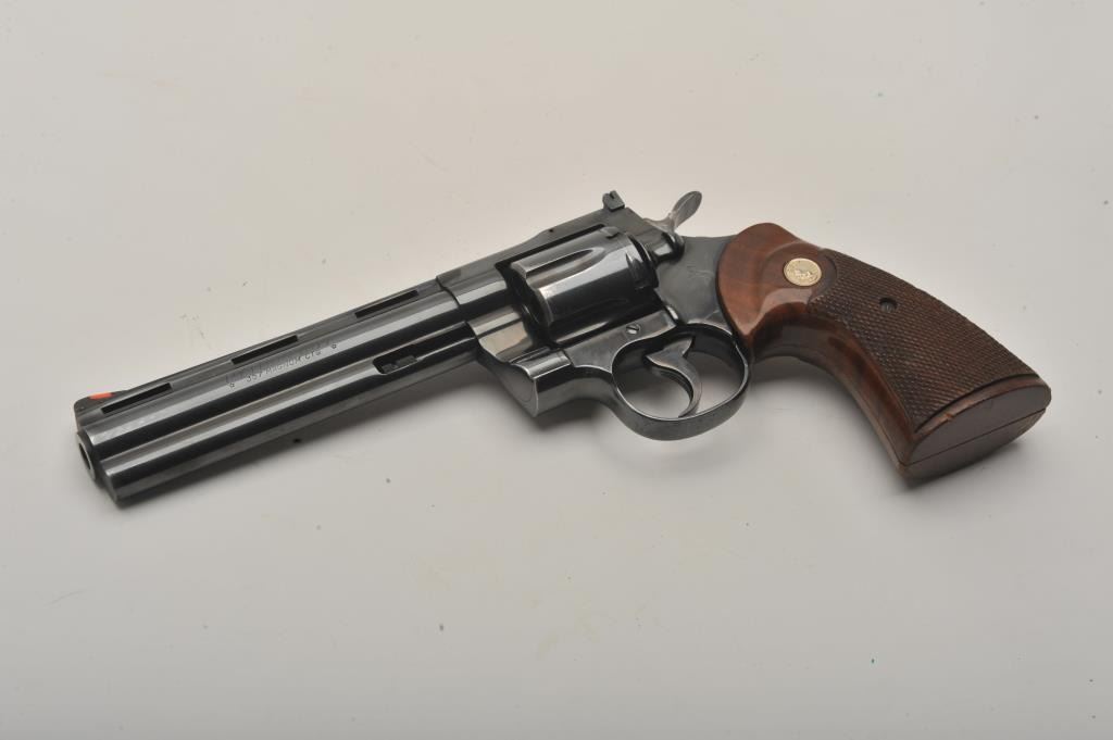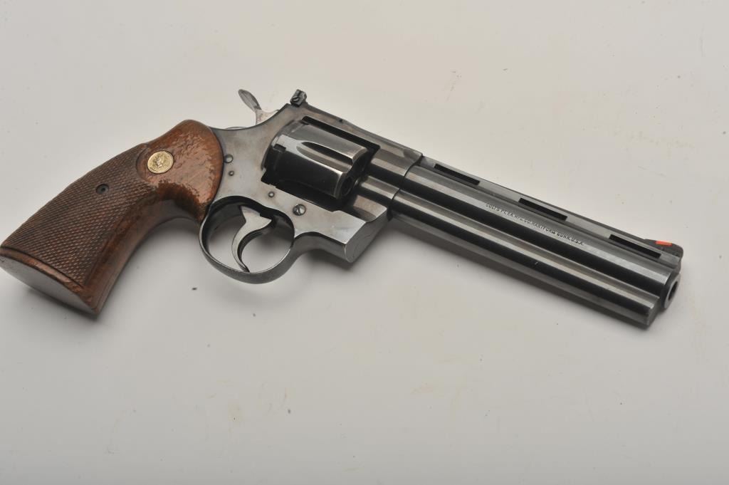 Early Colt Python DA revolver, .357 Magnum caliber, 6” ventilated rib barrel, blued finish, checkered wood medallion combat grips, S/N E5315, in overall very good + condition; 90-95% original finish to metalsurfaces, slight loss and index line on cylinder, very good to near fine bore, good grips with wear primarily to right side grip. (Modern/PPT). Est.: $1,400-$2,800.