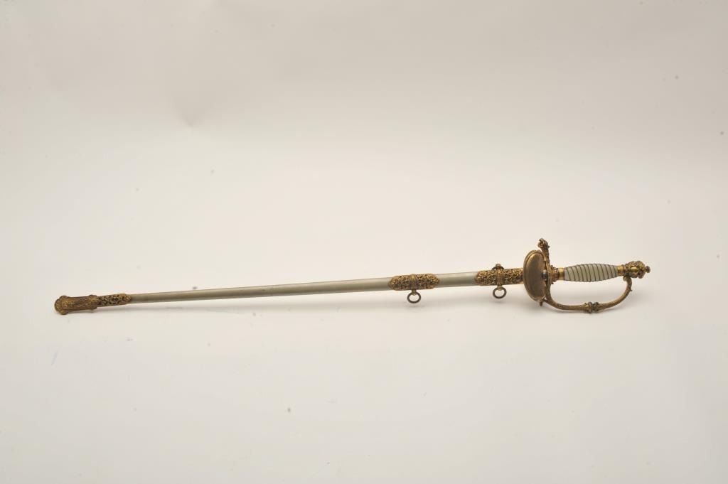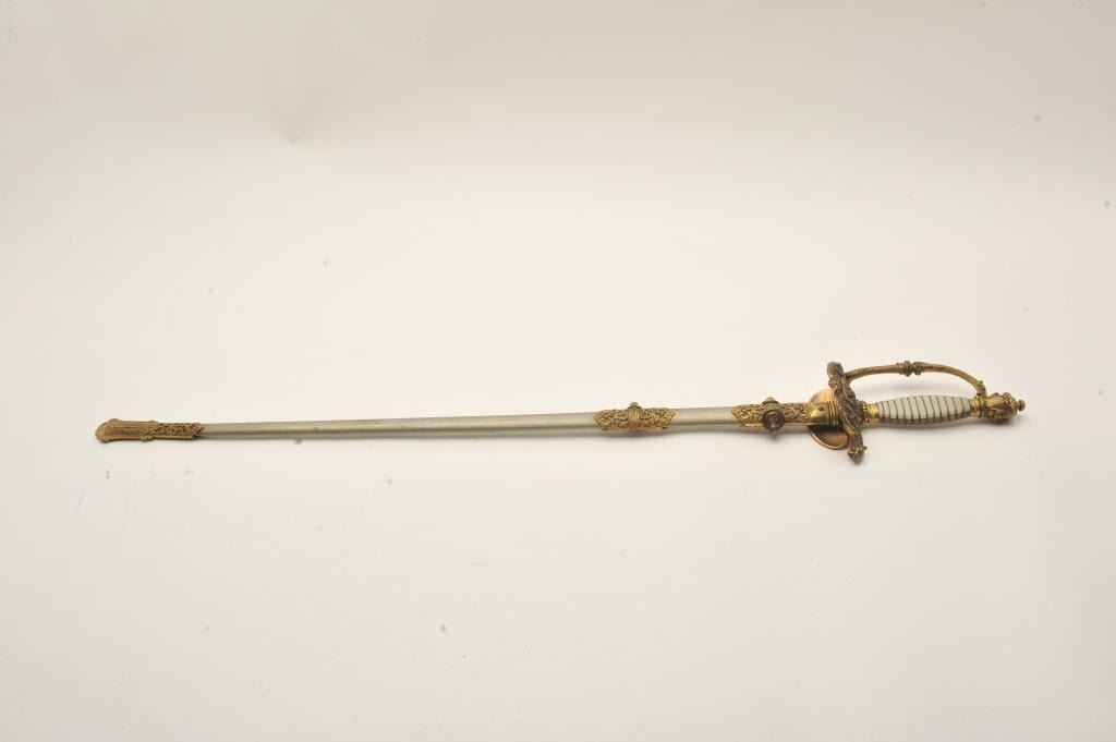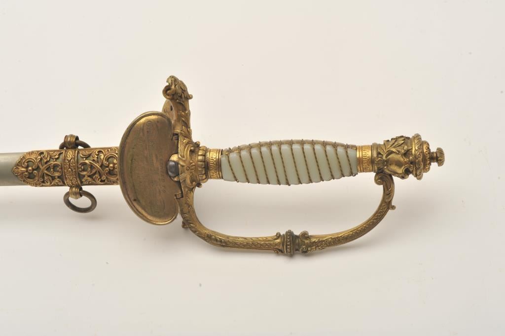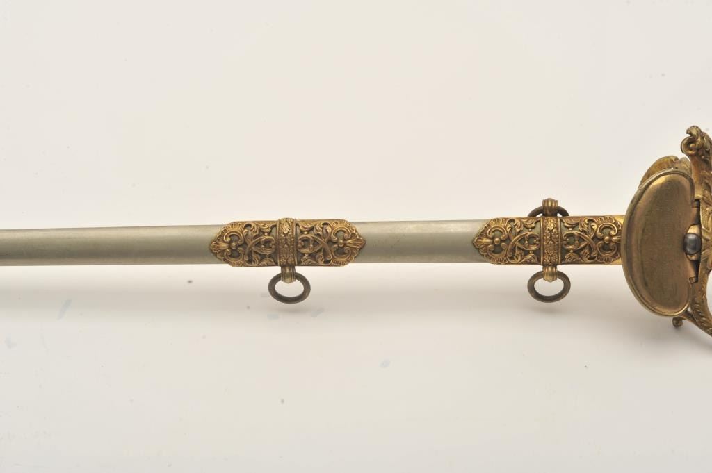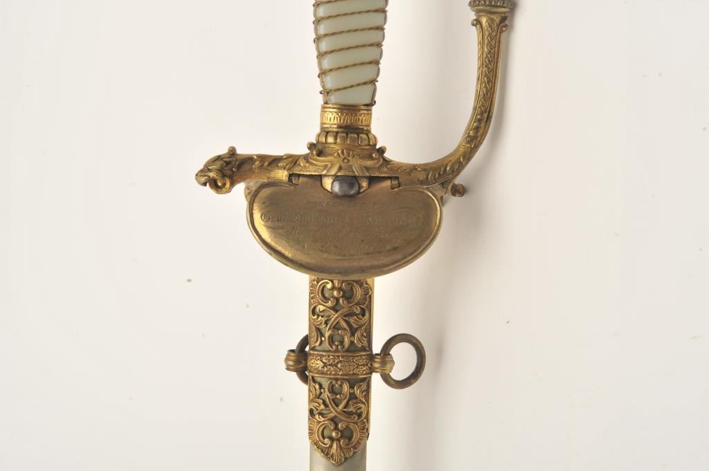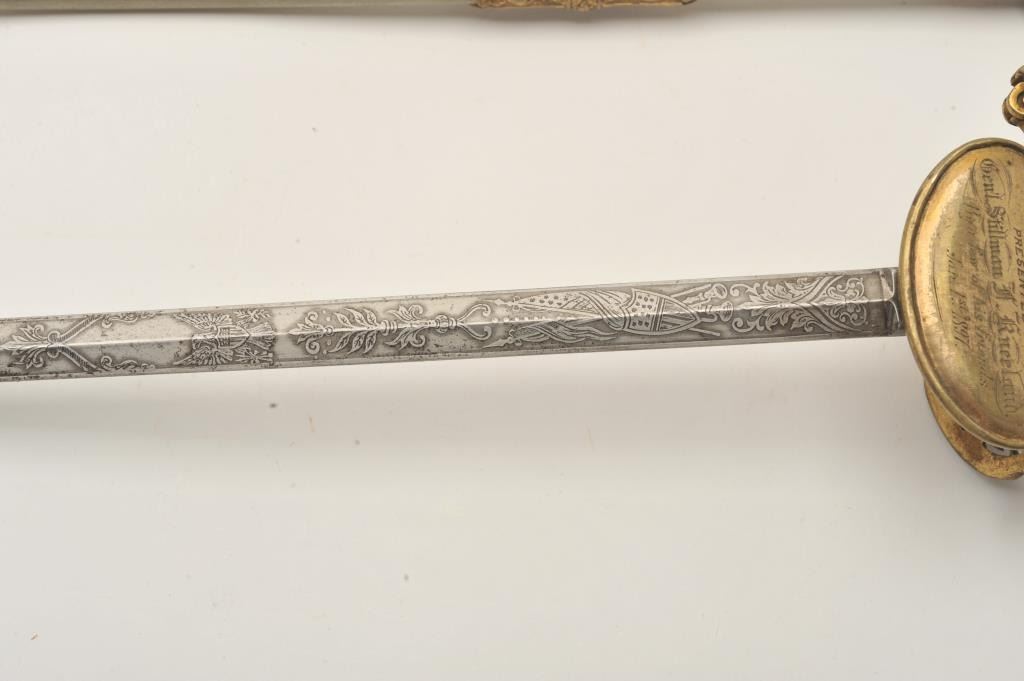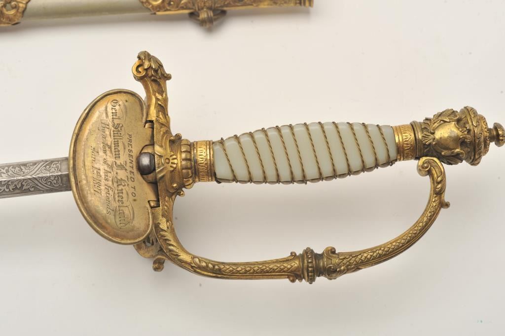 High grade Model 1860 staff and field officer’s sword and scabbard with fancy embossed and gilded gold mountings, pearl grip and inscribed “Presented to Gen’l Stillman F. Kneeland, By a few of hisFriends, Jan. 1st, 1897”. Sword is signed “Ridabock & Co., New York” and marked “Made in France”. General Kneeland’s career began in 1863 when he enlisted in the 1st Vermont Heavy Artillery; he saw action atSpottsylvania and Cold Harbor and was wounded at battle near Petersburg. He served in the New York National Guard and rose through the ranks where he retired as Judge Advocate-General for the state of New York,Jan. 1st, 1897. The sword is in very good to fine condition with approximately 75-85% of its un-cleaned and toned gold gilding, nickel scabbard gone frosty but still retains most of its nickel, pearl scales are in goodcondition, hilt a little loose, blade very good with good sharp etching and some pitting. Accompanied by copies of information from the National Archives and State of New York Executive Dept./Division of