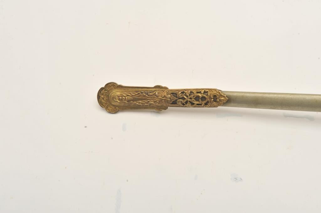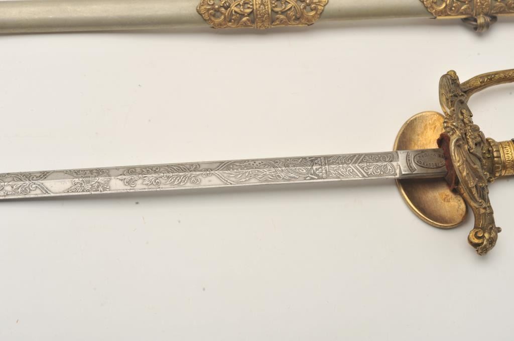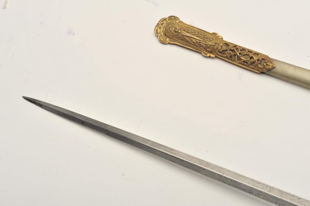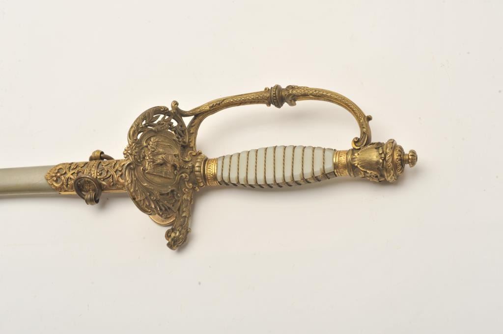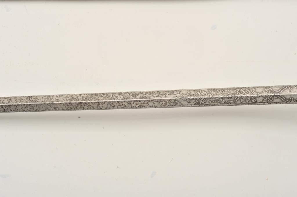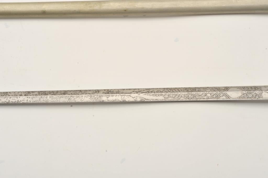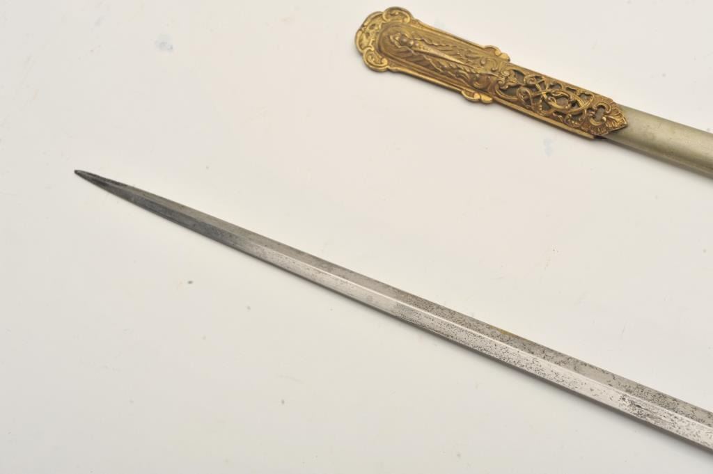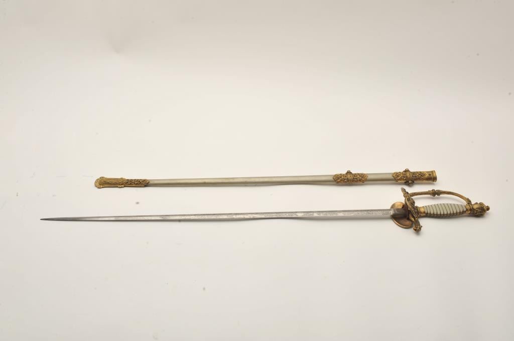High grade Model 1860 staff and field officer’s sword and scabbard with fancy embossed and gilded gold mountings, pearl grip and inscribed “Presented to Gen’l Stillman F. Kneeland, By a few of hisFriends, Jan. 1st, 1897”. Sword is signed “Ridabock & Co., New York” and marked “Made in France”. General Kneeland’s career began in 1863 when he enlisted in the 1st Vermont Heavy Artillery; he saw action atSpottsylvania and Cold Harbor and was wounded at battle near Petersburg. He served in the New York National Guard and rose through the ranks where he retired as Judge Advocate-General for the state of New York,Jan. 1st, 1897. The sword is in very good to fine condition with approximately 75-85% of its un-cleaned and toned gold gilding, nickel scabbard gone frosty but still retains most of its nickel, pearl scales are in goodcondition, hilt a little loose, blade very good with good sharp etching and some pitting. Accompanied by copies of information from the National Archives and State of New York Executive Dept./Division of