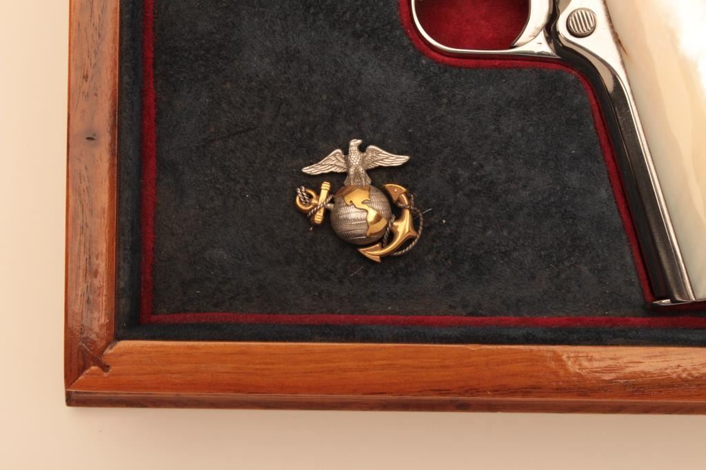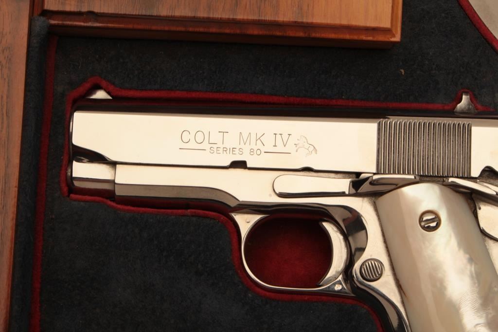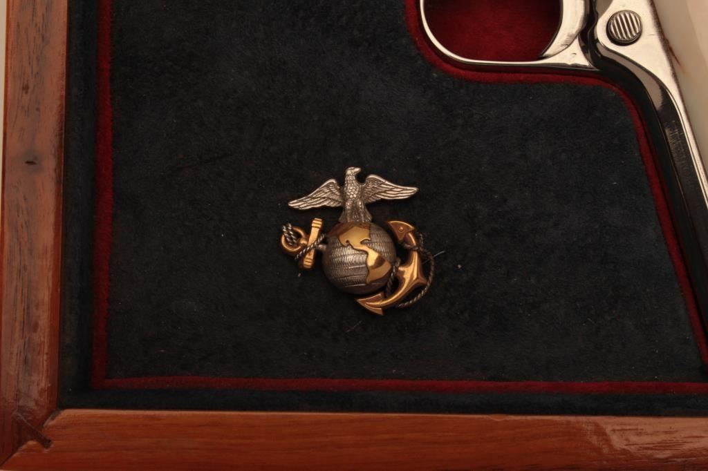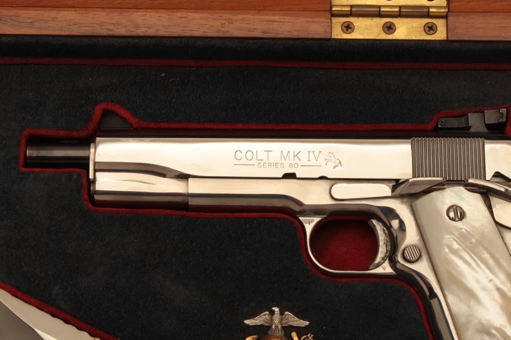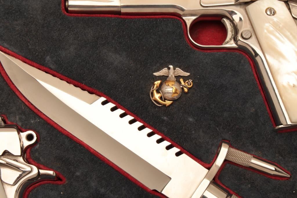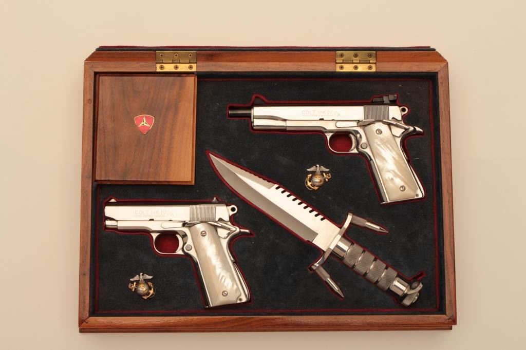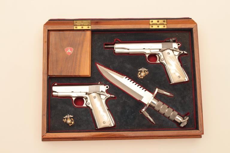 1 of a kind custom commemoration of the United States Marine Corps made by Jack Kalajian noted gunsmith in 1990s. The set consists of the following:1. Colt Series 80 Government Model .45 ACP Semi-Auto pistol, S/N SS12011. Custom high polished stainless steel, extended and compensated replacement barrel, with outline rear and red ramp adjustable sights. Honedand polished action. Pearl grips. Engine turned hammer and trigger. Upgraded springs and small parts. Fine to excellent used condition. 97%-99% overall 2. Colt MKIV Series 80 commanding officer’smodel, S/N SS15662. Custom high polish finished with pearl grips. Fine to excellent condition showing minor use and firing. 97%-99% overall. 3. Buck 184 limited edition knife showingfull nickel plate. Designed to be utilized for a grappling device on which a rope is attached or as fighting knife. Excellent condition as plated. The above 3 items are in a presentation