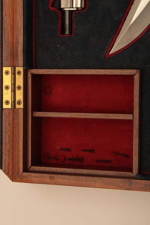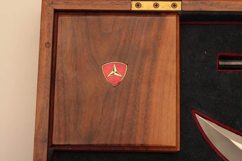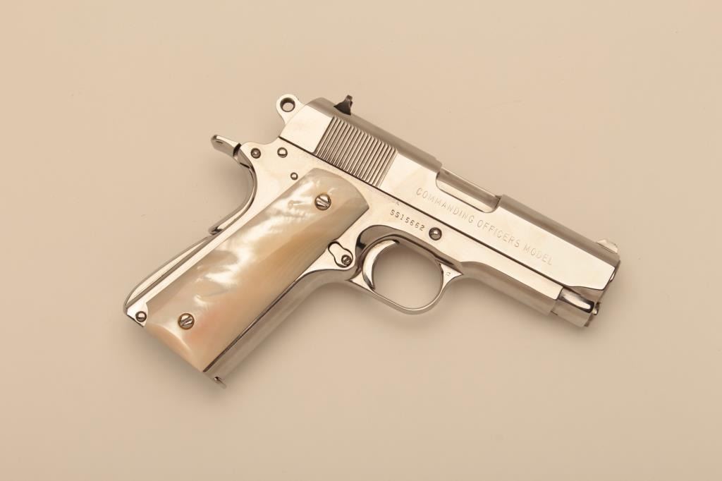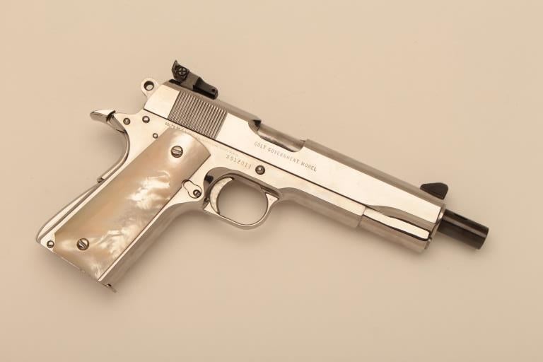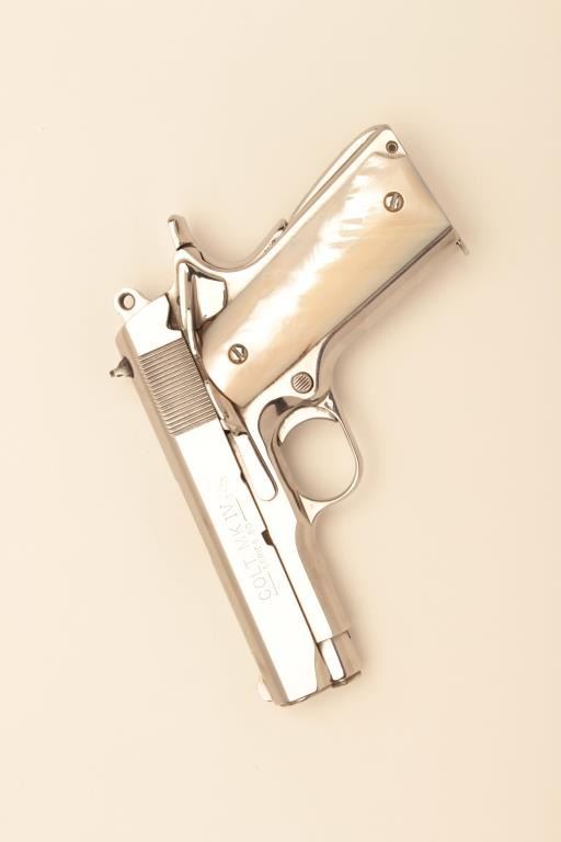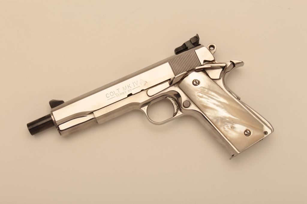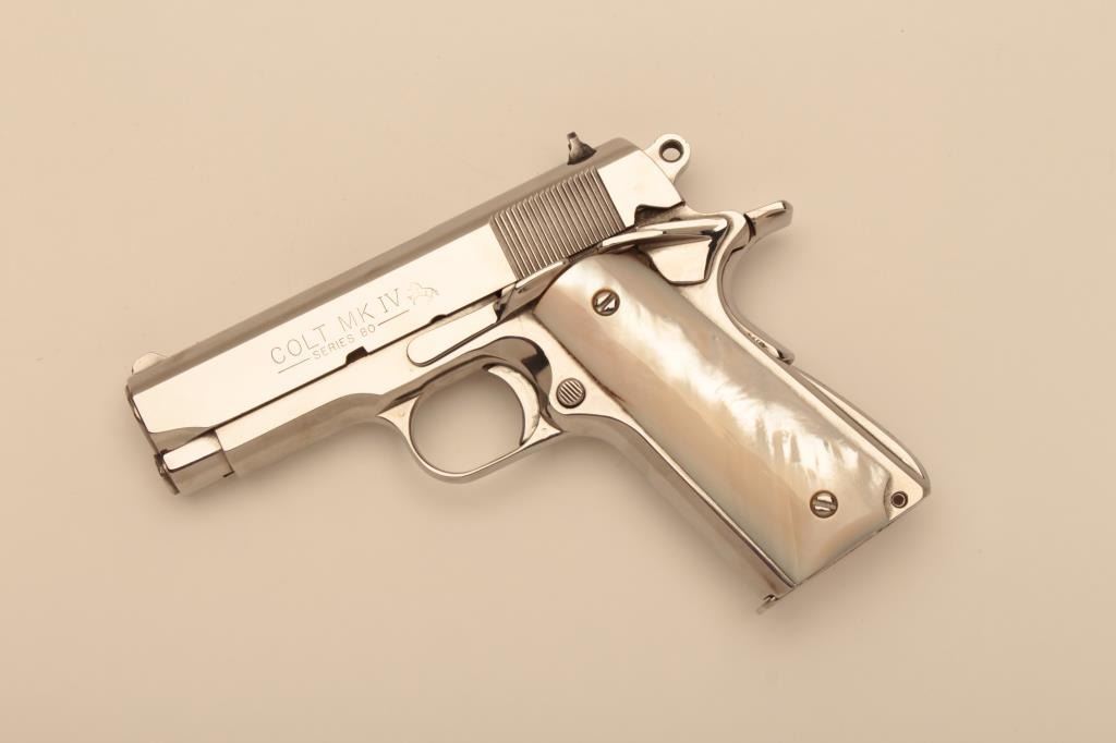 1 of a kind custom commemoration of the United States Marine Corps made by Jack Kalajian noted gunsmith in 1990s. The set consists of the following:1. Colt Series 80 Government Model .45 ACP Semi-Auto pistol, S/N SS12011. Custom high polished stainless steel, extended and compensated replacement barrel, with outline rear and red ramp adjustable sights. Honedand polished action. Pearl grips. Engine turned hammer and trigger. Upgraded springs and small parts. Fine to excellent used condition. 97%-99% overall 2. Colt MKIV Series 80 commanding officer’smodel, S/N SS15662. Custom high polish finished with pearl grips. Fine to excellent condition showing minor use and firing. 97%-99% overall. 3. Buck 184 limited edition knife showingfull nickel plate. Designed to be utilized for a grappling device on which a rope is attached or as fighting knife. Excellent condition as plated. The above 3 items are in a presentation