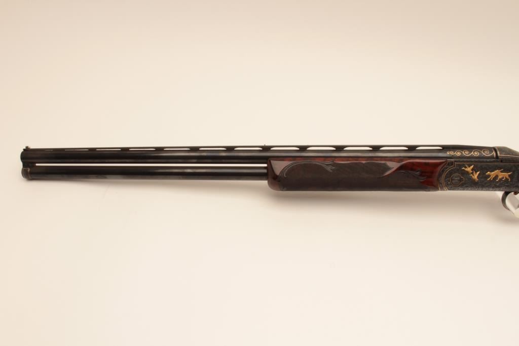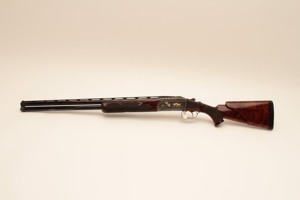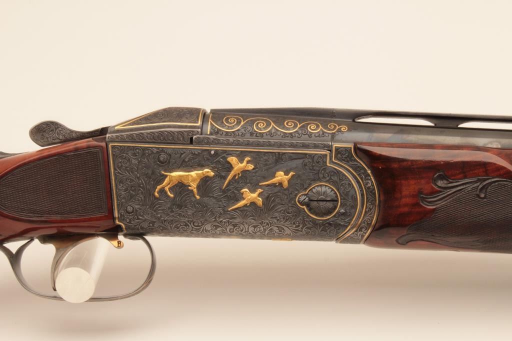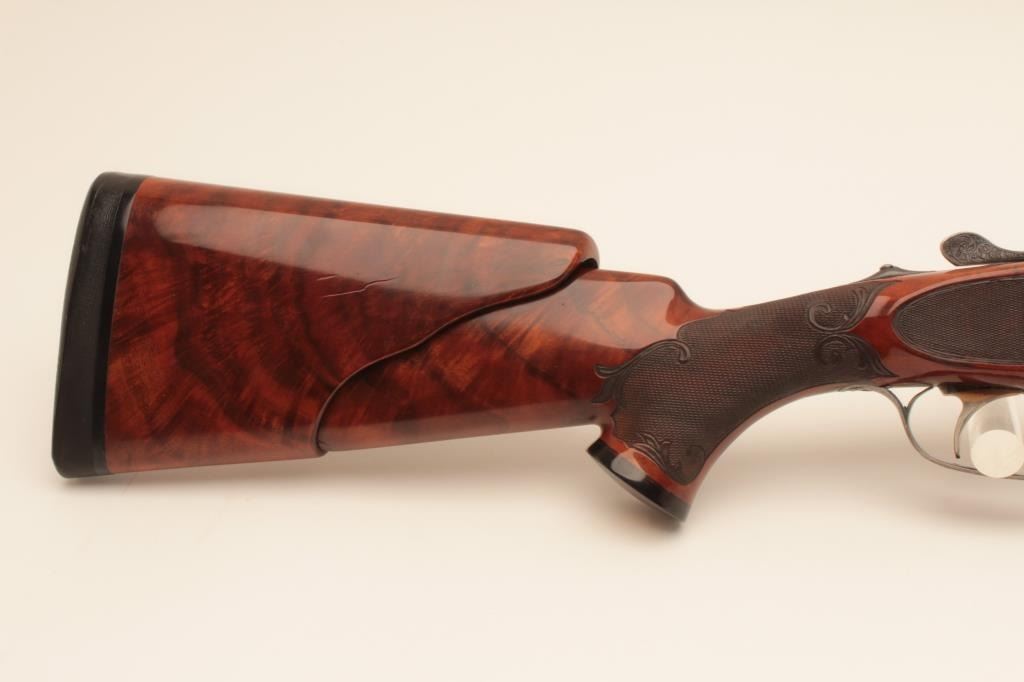 Krieghoff Crown Grade four barrel set with custom pneumatic recoil reducing stock and carry case, S/N 8596 in 12GA, 20GA, 28GA and 410GA. All 4 barrels are Krieghoff marked and matching numbers measuring 28” in length.The 12GA barrel is fitted for Briley chokes with wrench and 5 chokes. The other 3 barrels are skeet or improved. Super engraving and gold inlaid game scene with crown marking on the bottom of the frame and lever. The stocks are custom made burl walnut with select grain and fancy checkered with incised scroll carved borders. Measure 14 ¼” to the end of the thick pad. Includes vintage luggage case. (Modern) Est.: $6000-$12,000