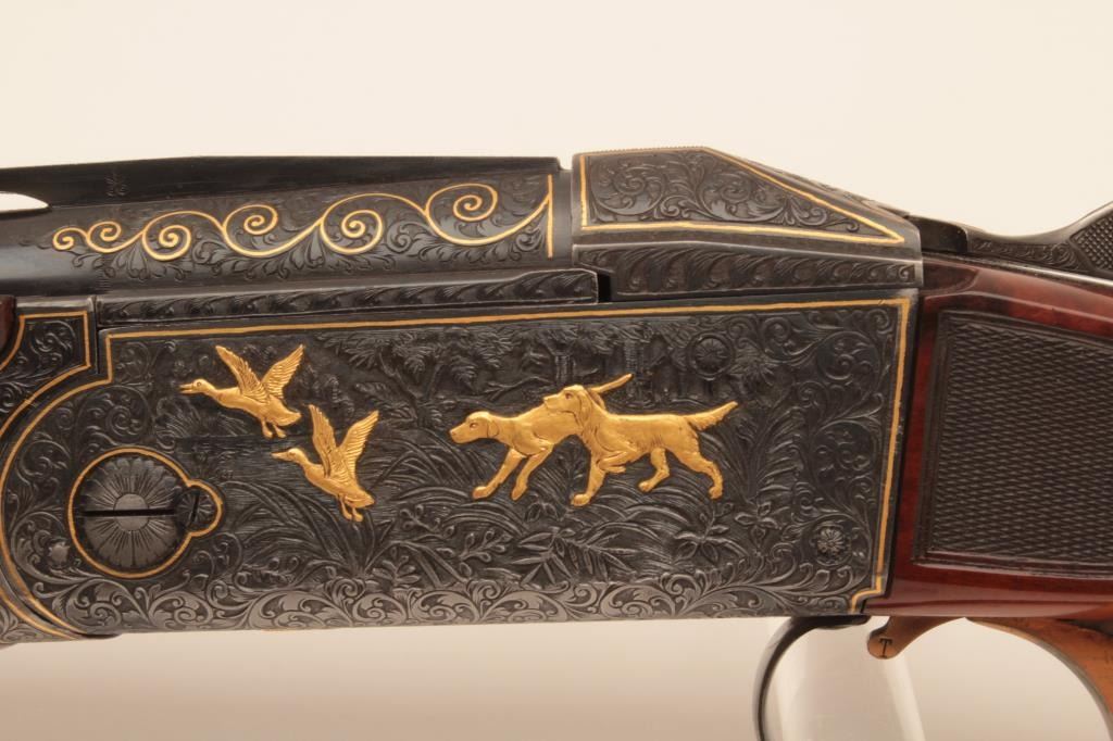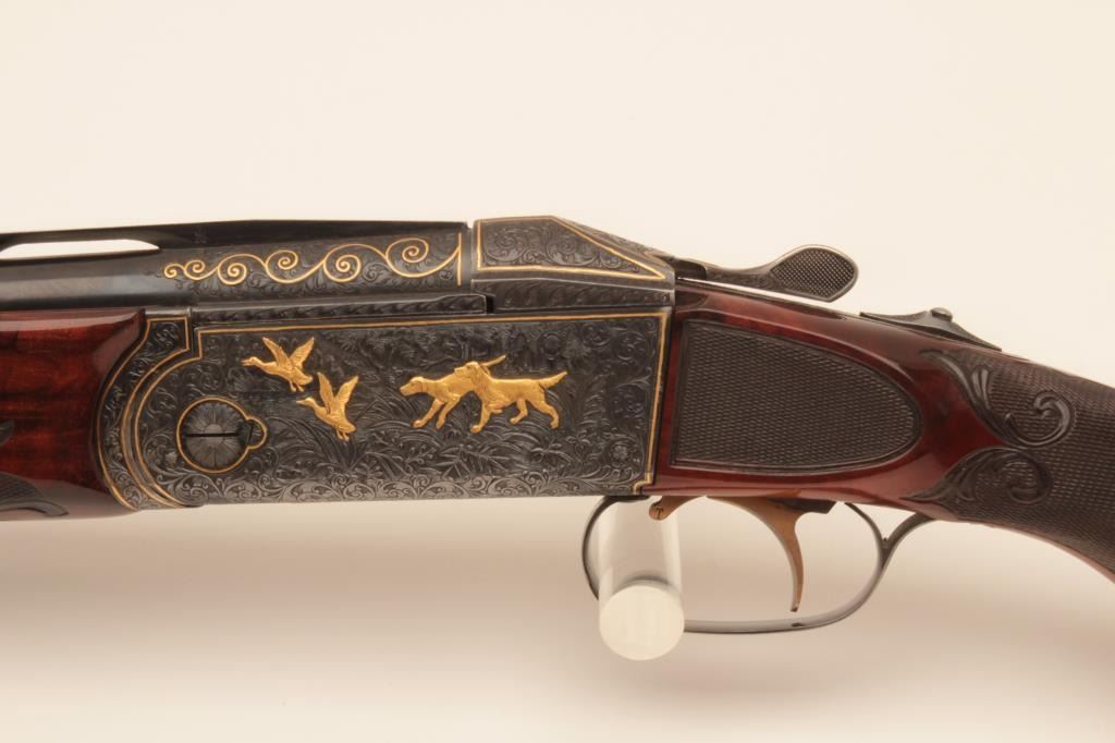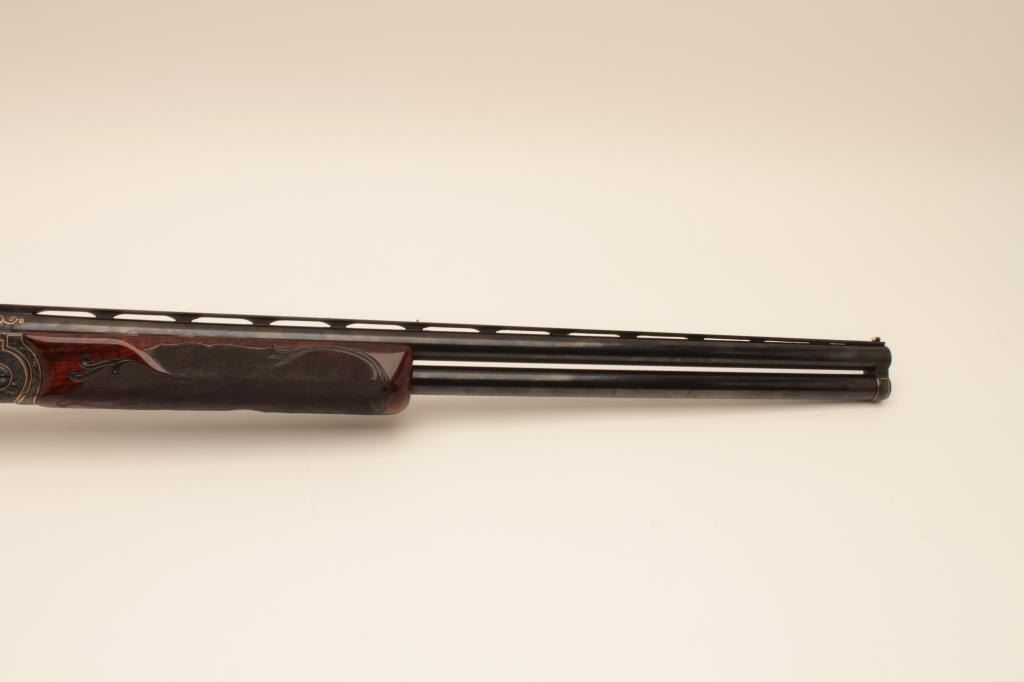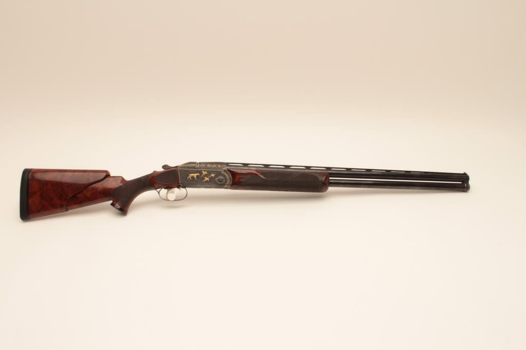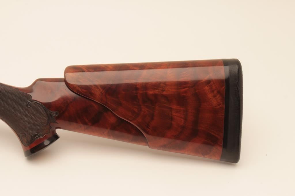 Krieghoff Crown Grade four barrel set with custom pneumatic recoil reducing stock and carry case, S/N 8596 in 12GA, 20GA, 28GA and 410GA. All 4 barrels are Krieghoff marked and matching numbers measuring 28” in length.The 12GA barrel is fitted for Briley chokes with wrench and 5 chokes. The other 3 barrels are skeet or improved. Super engraving and gold inlaid game scene with crown marking on the bottom of the frame and lever. The stocks are custom made burl walnut with select grain and fancy checkered with incised scroll carved borders. Measure 14 ¼” to the end of the thick pad. Includes vintage luggage case. (Modern) Est.: $6000-$12,000