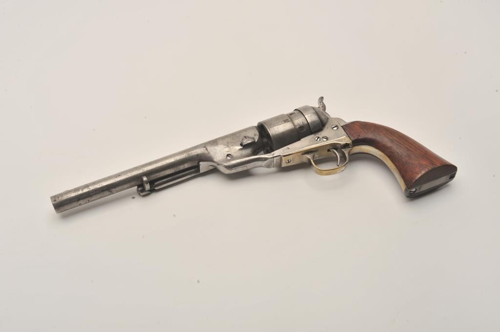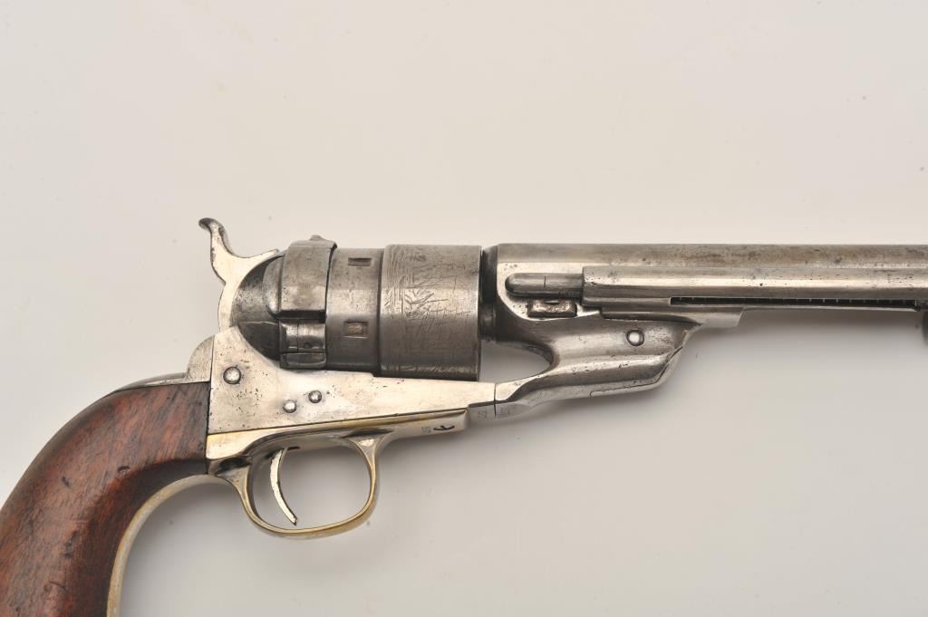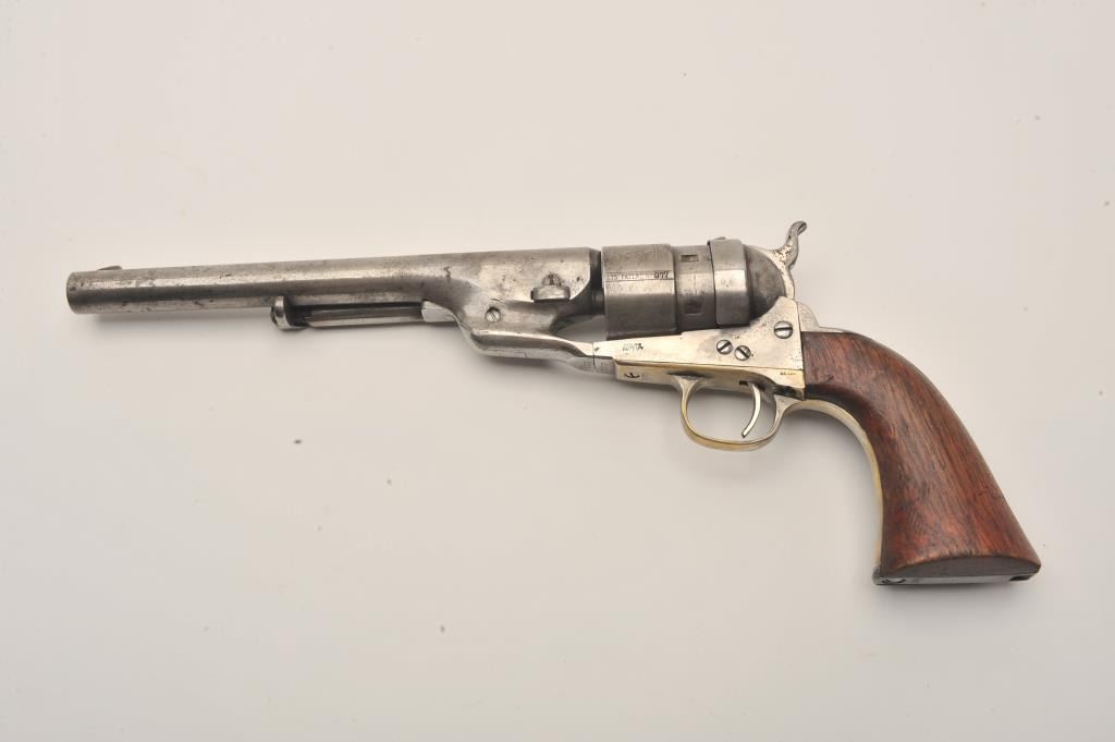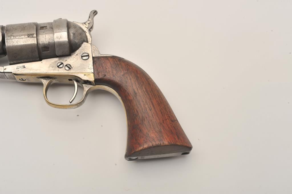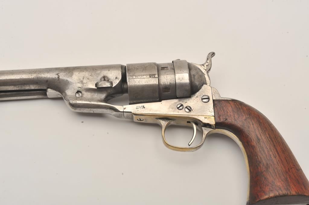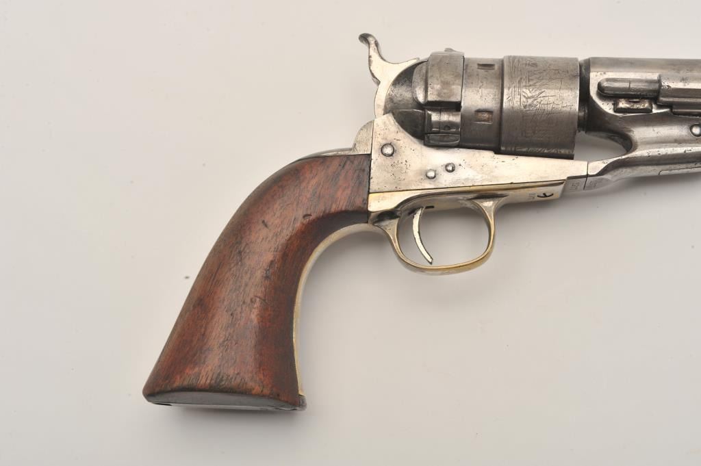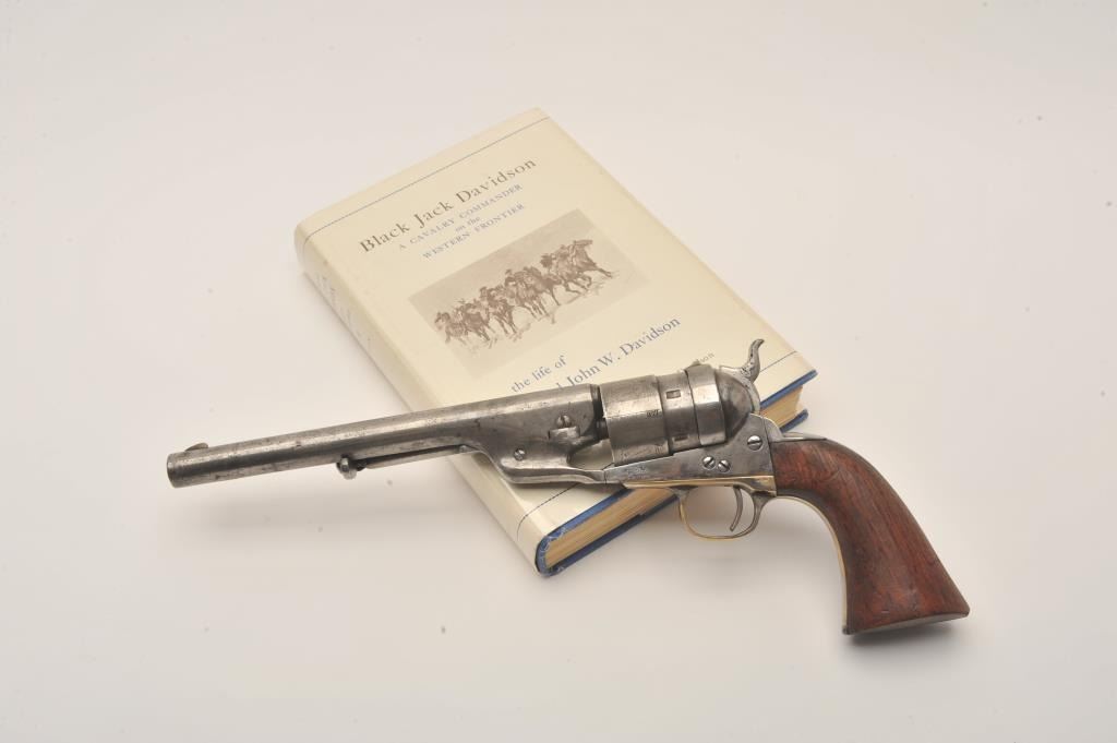 Colt Model 1860 Army Richards conversion to .44 Colt center-fire cartridge, S/N 2977 (all visible numbers matching); period inscribed on back strap “J.W. Davidson U.S.A.”. The metal surfaces show light cleaning to grayand scattered light to moderate pitting and erosion. The barrel address is good and legible and the cylinder shows about 30%-50%light scene. The grips have been cleaned or sanded and are slightlyundersized. The front sight has been slimmed slightly. The inscription is genuine to the 19th-century in our opinion and is hand engraved in script letters of the proper antique style. John Wynn Davidson was a West Point graduate, served in the 2nd U.S. Dragoons in the Mexican-American War, served on the Western frontier in many Indian battles and commanded the troops at Fort Tejon, California when the Civil War began.He was a brigadier General in the United States Army during the Civil War, commanding the 3rd Brigade during the Peninsula campaign and fought at Yorktown and Williamsburg. He briefly commanded the district of Southeast