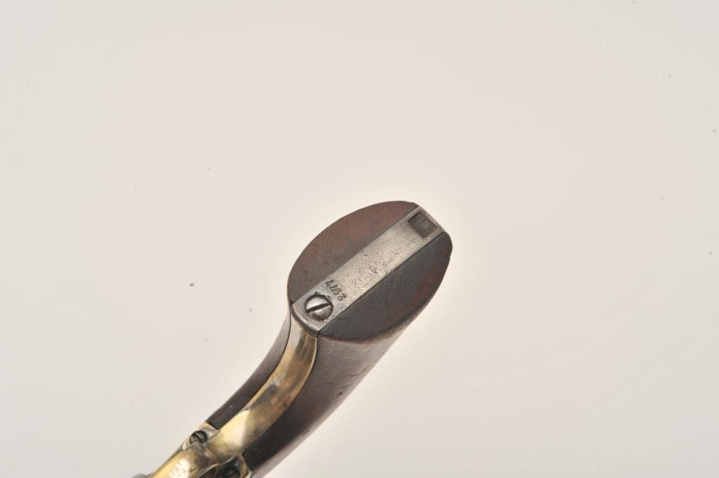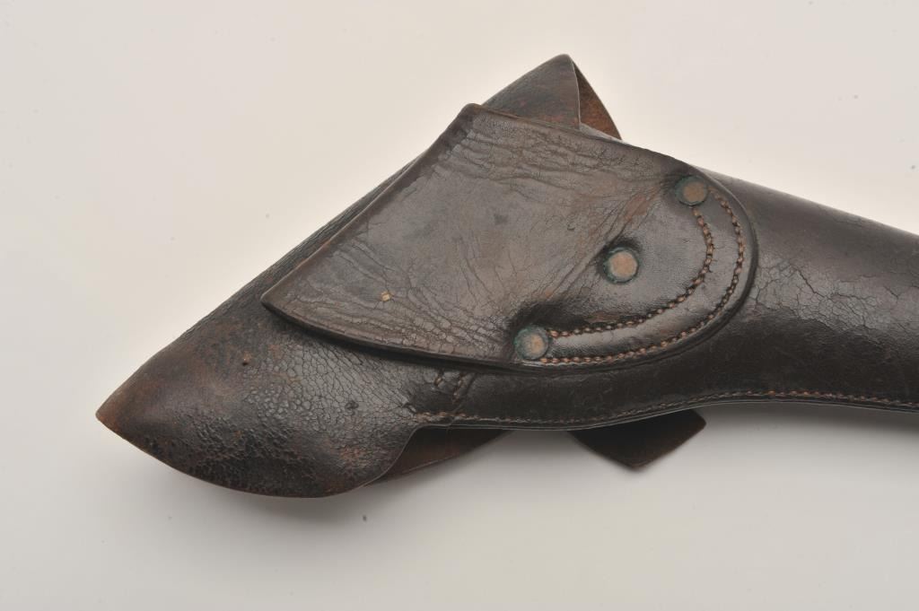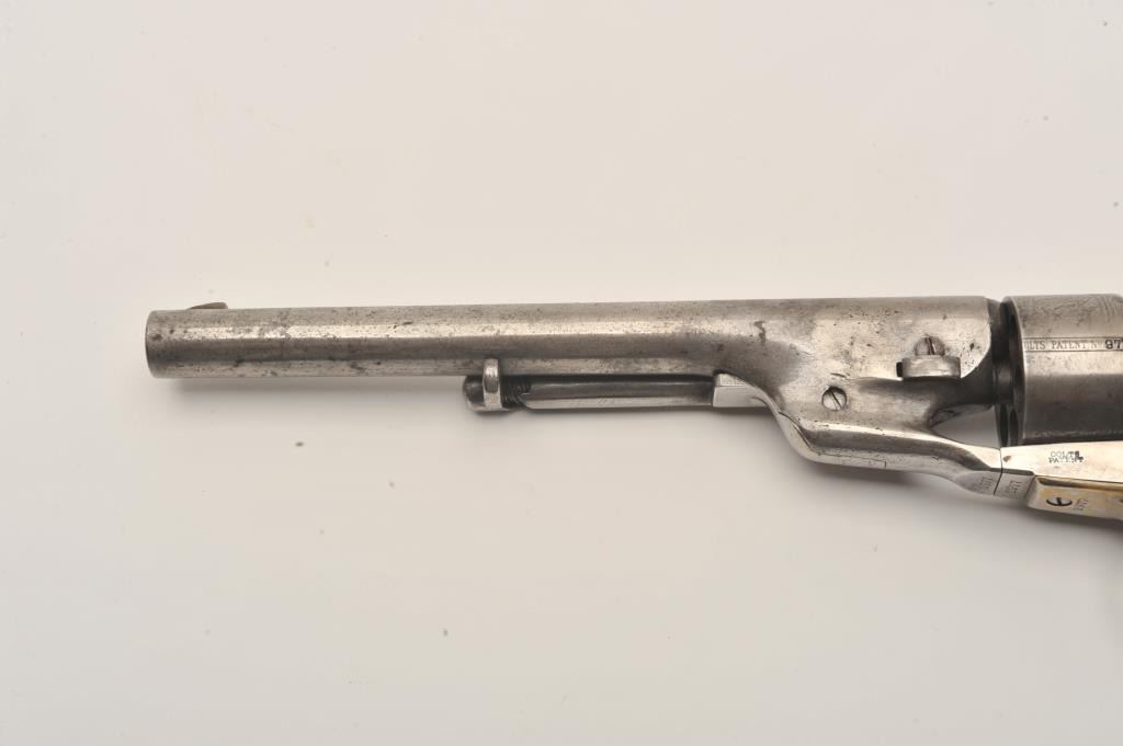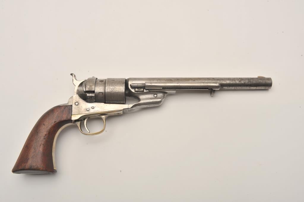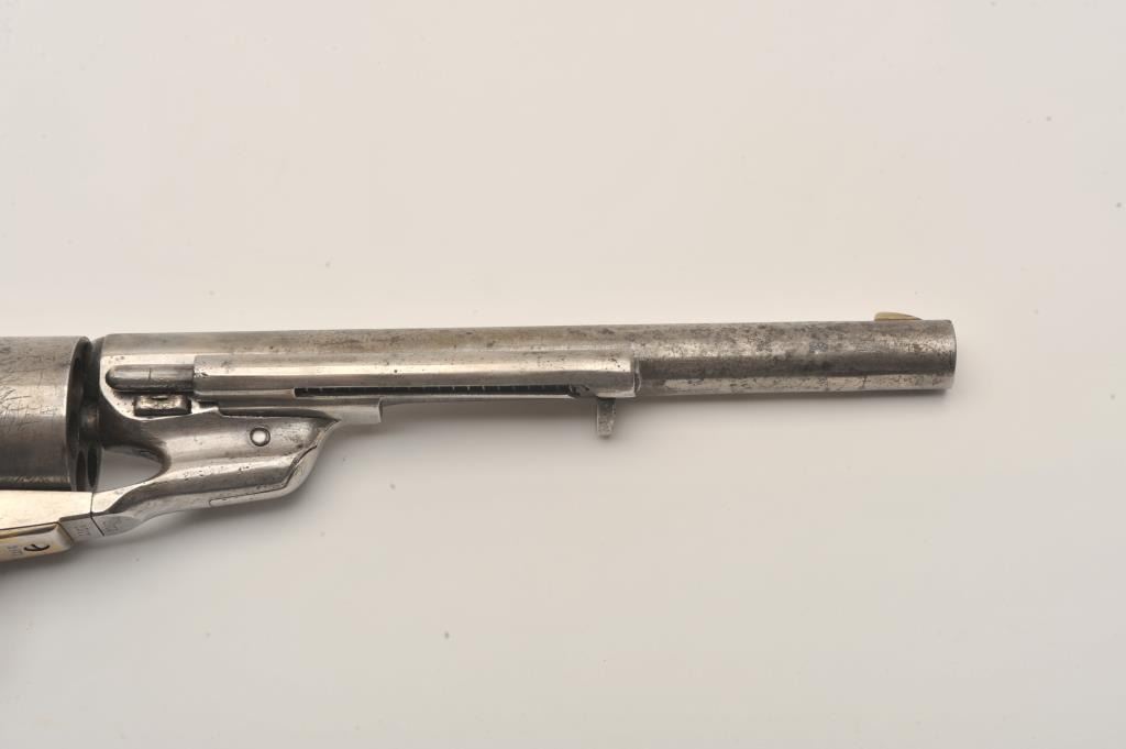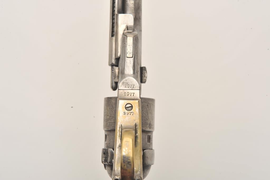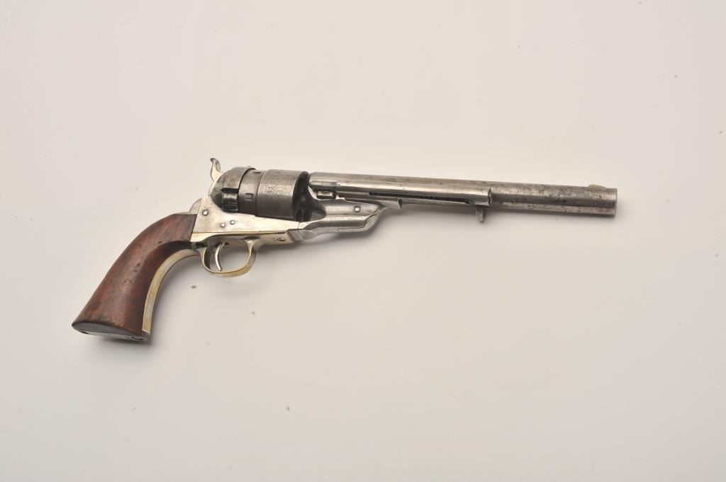 Colt Model 1860 Army Richards conversion to .44 Colt center-fire cartridge, S/N 2977 (all visible numbers matching); period inscribed on back strap “J.W. Davidson U.S.A.”. The metal surfaces show light cleaning to grayand scattered light to moderate pitting and erosion. The barrel address is good and legible and the cylinder shows about 30%-50%light scene. The grips have been cleaned or sanded and are slightlyundersized. The front sight has been slimmed slightly. The inscription is genuine to the 19th-century in our opinion and is hand engraved in script letters of the proper antique style. John Wynn Davidson was a West Point graduate, served in the 2nd U.S. Dragoons in the Mexican-American War, served on the Western frontier in many Indian battles and commanded the troops at Fort Tejon, California when the Civil War began.He was a brigadier General in the United States Army during the Civil War, commanding the 3rd Brigade during the Peninsula campaign and fought at Yorktown and Williamsburg. He briefly commanded the district of Southeast