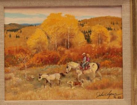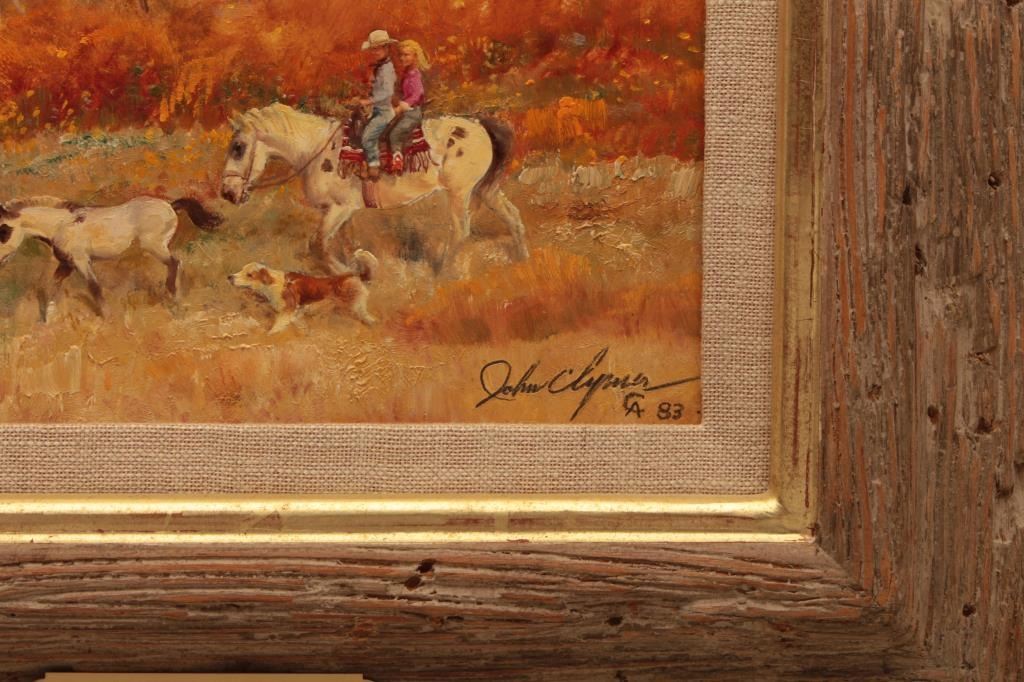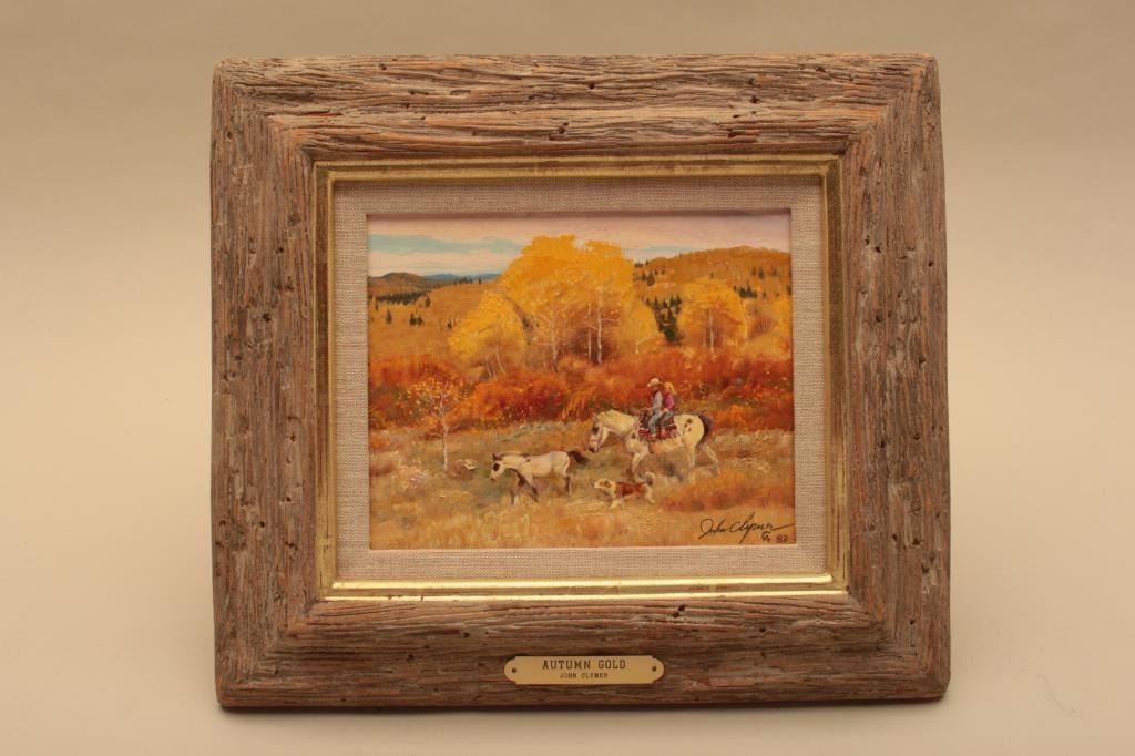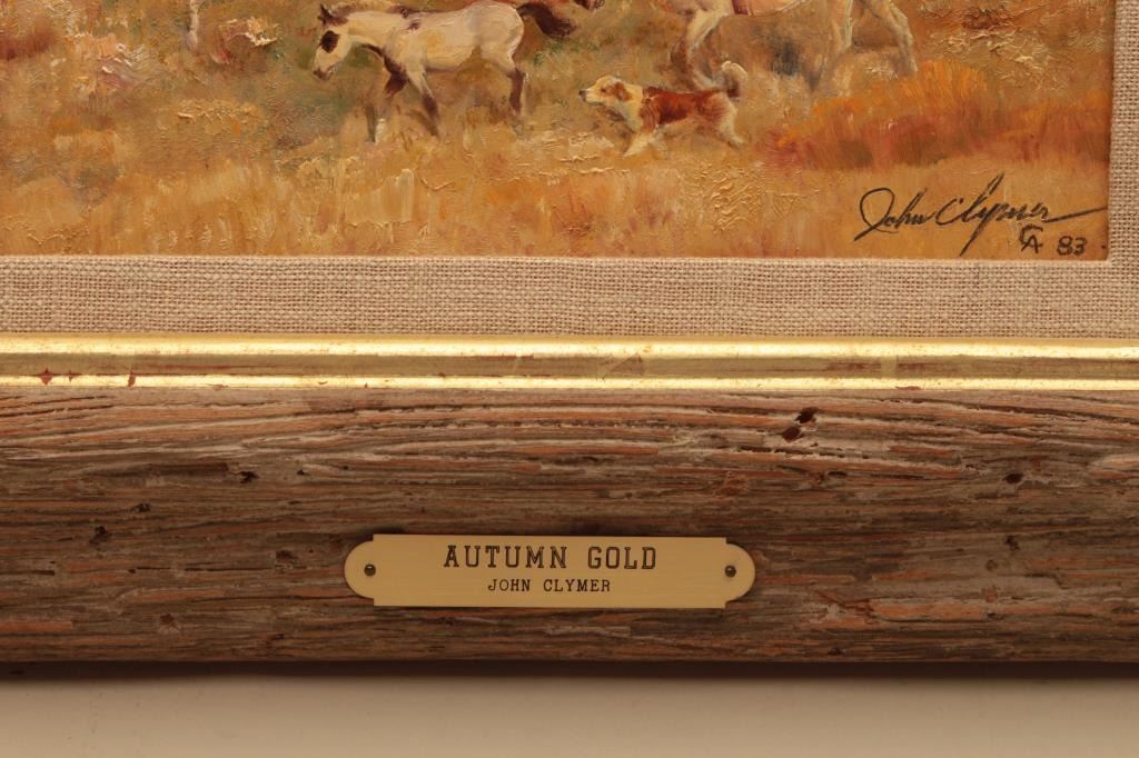 Original oil paint on board signed lower right “John Clymer, CA” and dated “1983”. Titled on back “Autumn Gold”. Measures 8” x 10”. The sticker on back indicates 1983 sale at Cowboy Artists of America sale at PhoenixArt Museum. John Clymer was a top artist in his life time now deceased. He was located in Jackson Hole, Wyoming and well represented by Prominent Galleries and museums. His works are desirable among collectors. Excellentcondition. Est.: $3000-$6000