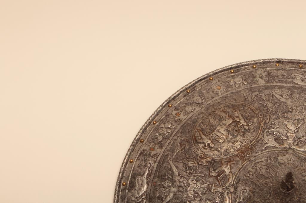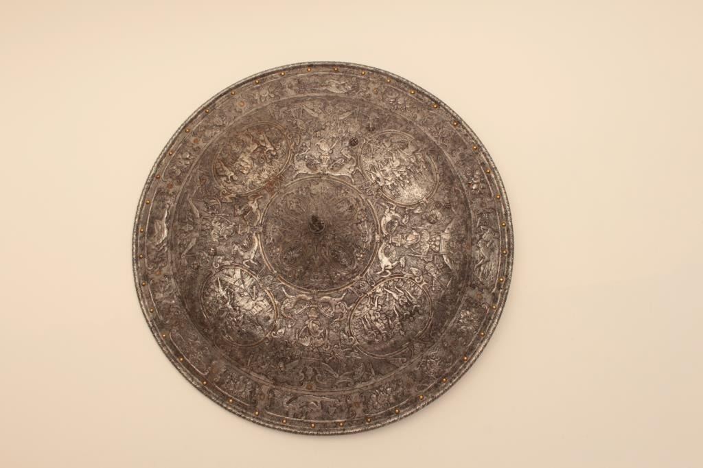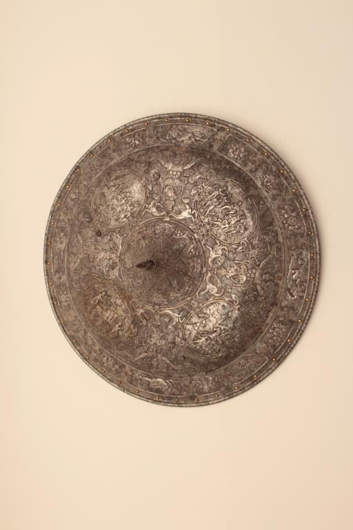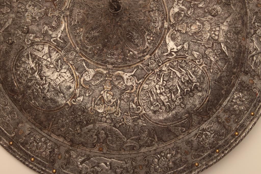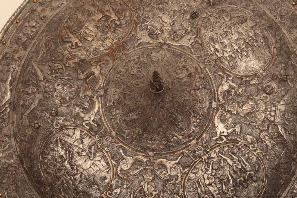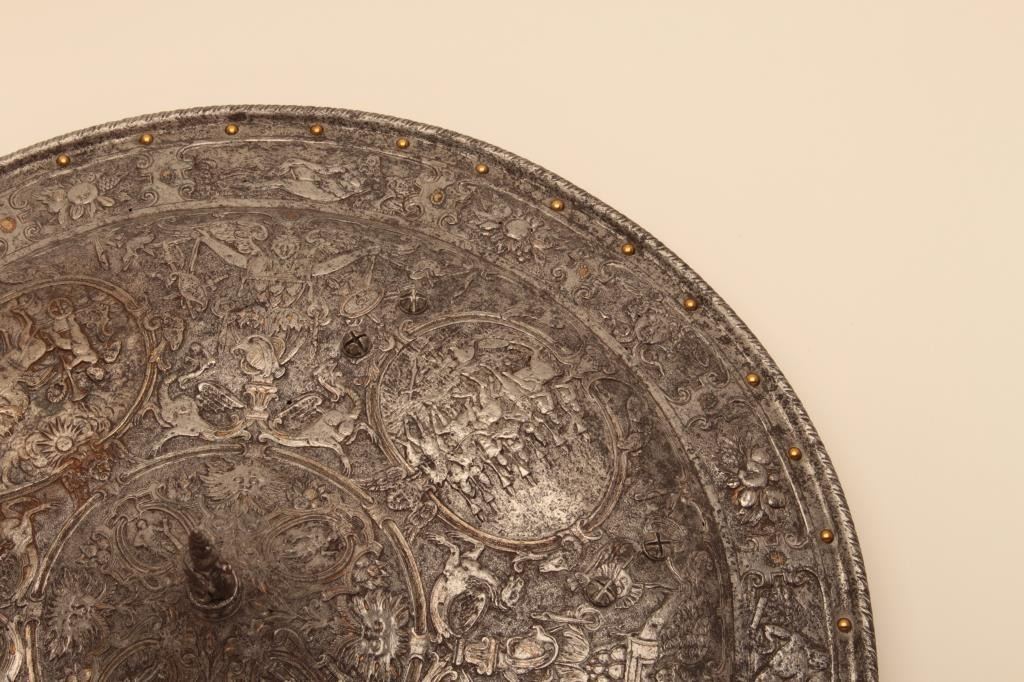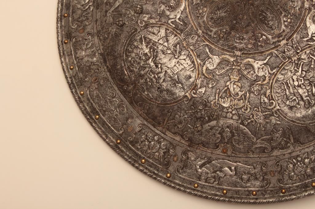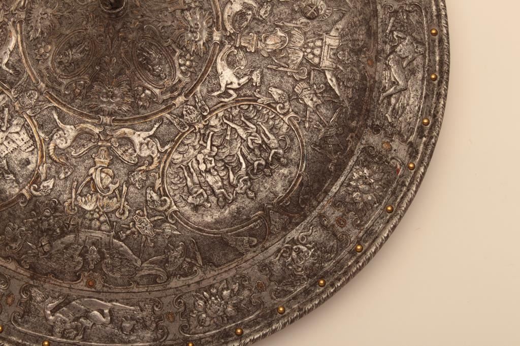 Ornately chiseled heroic shield in renaissance style. Extremely fine detail and terrific metal work that is forged and not cast. This shield has been the subject of argument between collectors as to whetherperiod or Victorian. This cataloger could argue the point on either side. However the craftsmanship metal work is excellent and definitely over 100 years old in the Italian style. The estate of Eric Vaule. Est.:$7500-$15,000