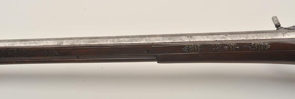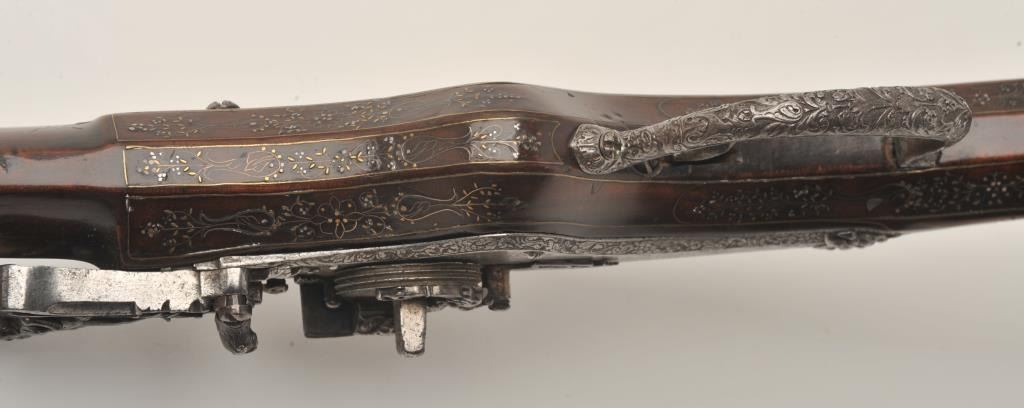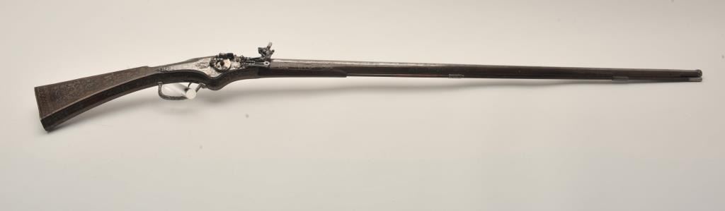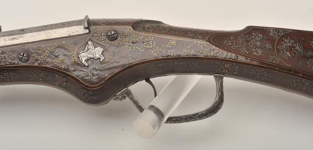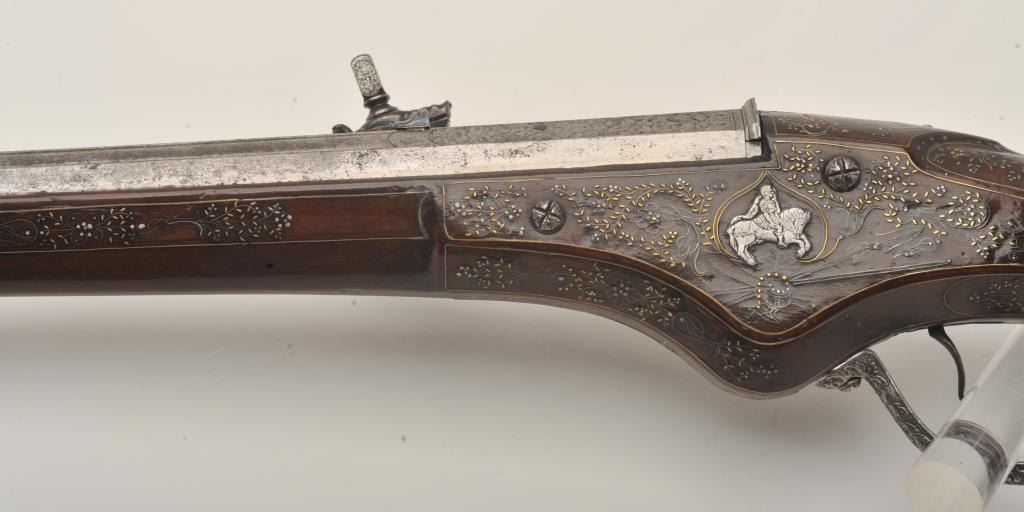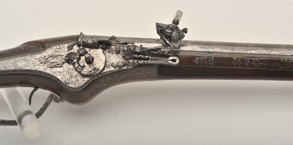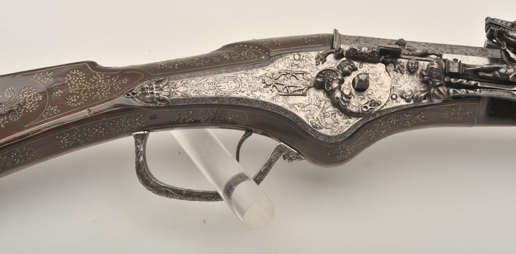 Rare and ornate French Wheelock long gun attributed to Hennequin of Metz. French Wheelock long arms are so rare this cataloger cannot find a half of dozen offered for sale in a library of references since 1950. Thisexact gun was used in 1892 in the collection of Spitzer, Paris. Subsequent owners Hector Economos, William Randolph Hearst, John Kindig, and the estate of Eric Vaule. The gun is finely silver and brass wire inlaid inthe stock. The hammer is relief chiseled with mad holding horse head (The hammer) by rope. Figures of angels, demons, and face ornament the lock. Also engraving on the lock and breech of barrel. The trigger guard ischiseled in a foliate design. The barrel shows finely cut raised ribs terminating in a ring around the muzzle ornamented with chiseled leaf design. The overall design is high art with a thinness and grace found onFrench wheelocks in this period. Measures 54” overall with a 40 ½” barrel of .52 caliber smoothbore. The condition is near fine with 98% inlays intact and only a couple raising out in need of minor conservation. The