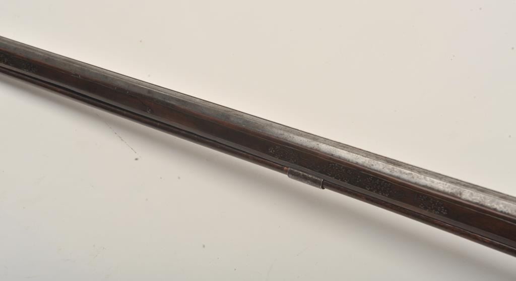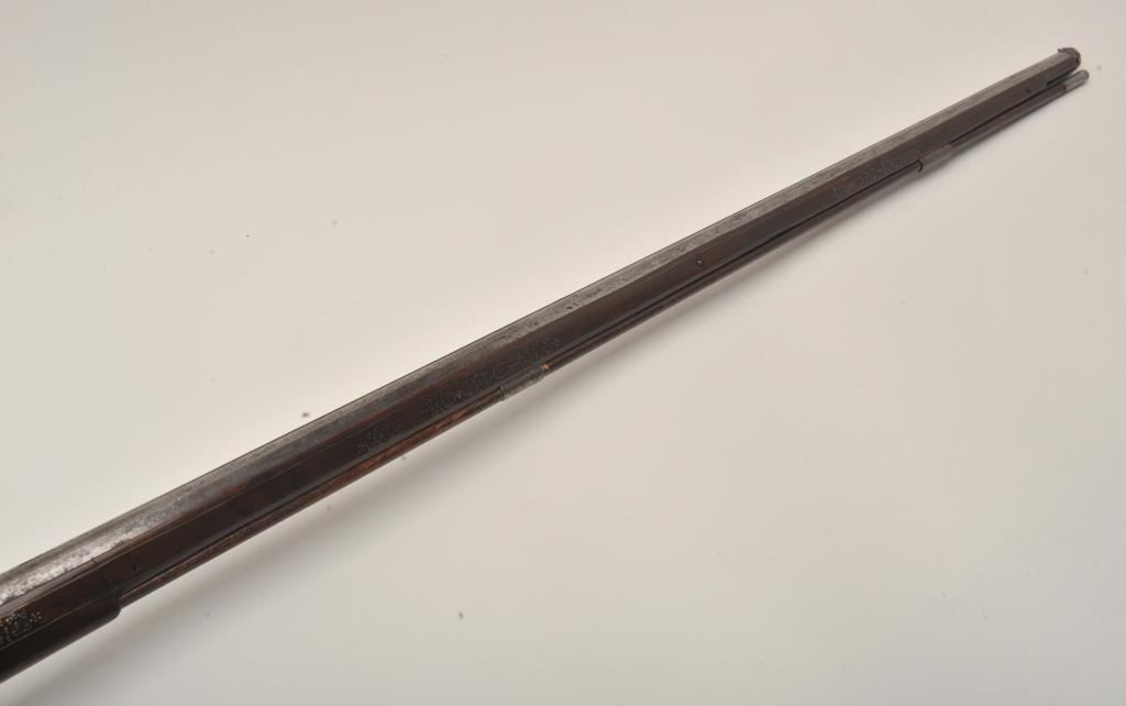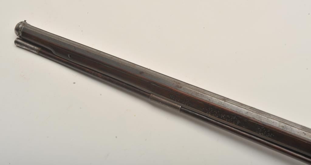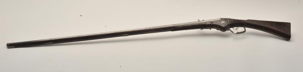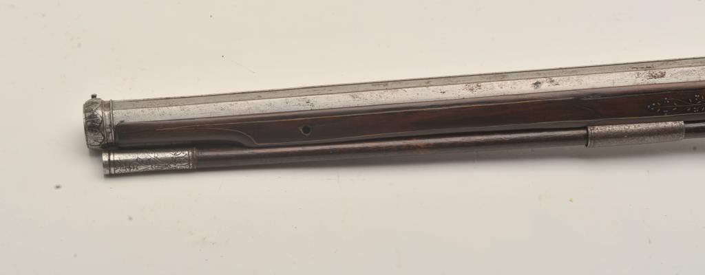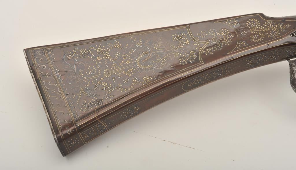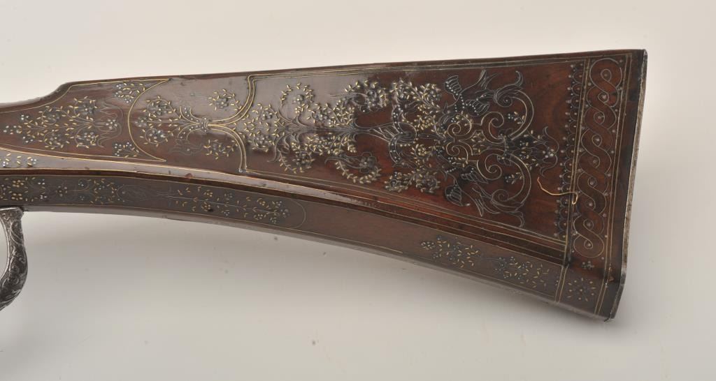 Rare and ornate French Wheelock long gun attributed to Hennequin of Metz. French Wheelock long arms are so rare this cataloger cannot find a half of dozen offered for sale in a library of references since 1950. Thisexact gun was used in 1892 in the collection of Spitzer, Paris. Subsequent owners Hector Economos, William Randolph Hearst, John Kindig, and the estate of Eric Vaule. The gun is finely silver and brass wire inlaid inthe stock. The hammer is relief chiseled with mad holding horse head (The hammer) by rope. Figures of angels, demons, and face ornament the lock. Also engraving on the lock and breech of barrel. The trigger guard ischiseled in a foliate design. The barrel shows finely cut raised ribs terminating in a ring around the muzzle ornamented with chiseled leaf design. The overall design is high art with a thinness and grace found onFrench wheelocks in this period. Measures 54” overall with a 40 ½” barrel of .52 caliber smoothbore. The condition is near fine with 98% inlays intact and only a couple raising out in need of minor conservation. The
