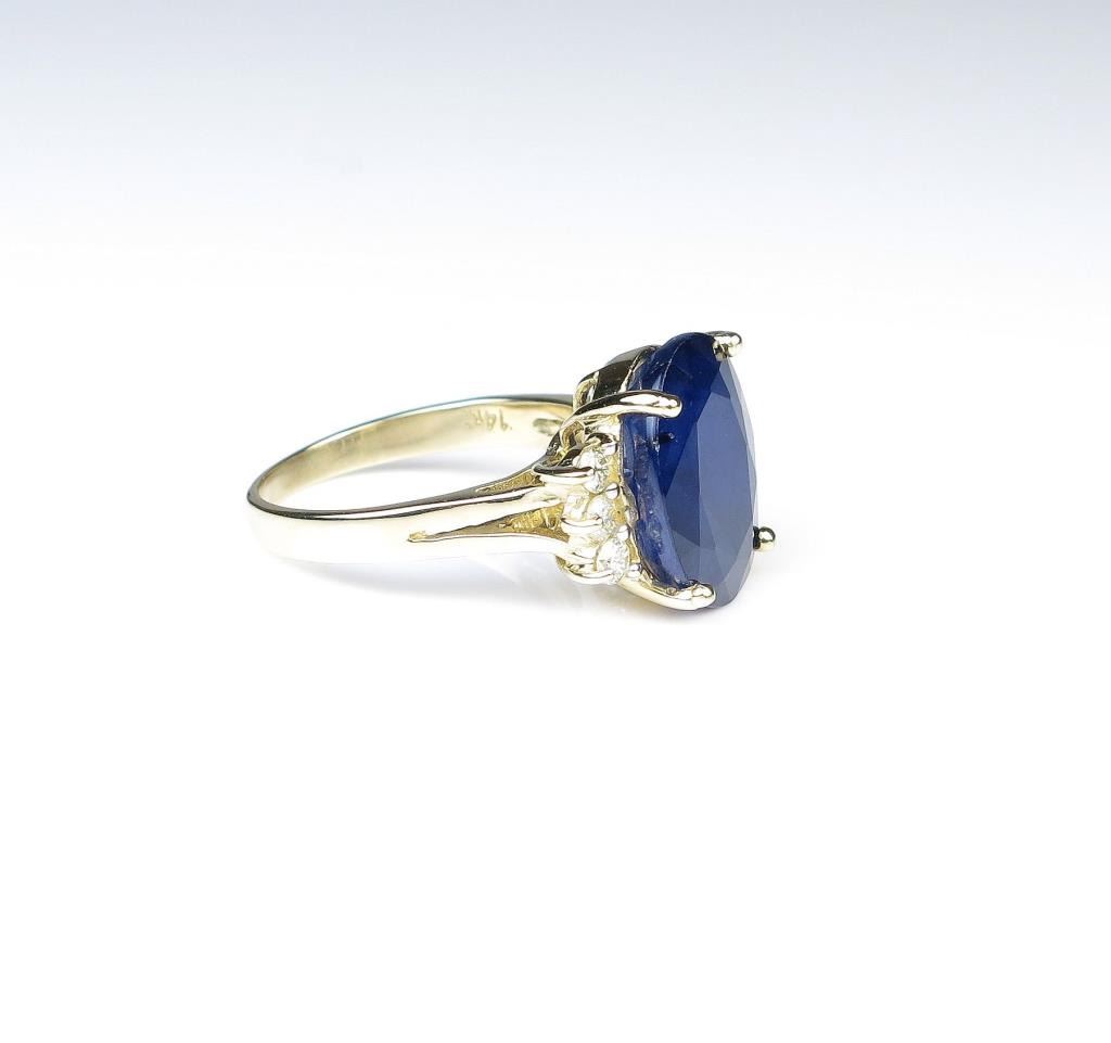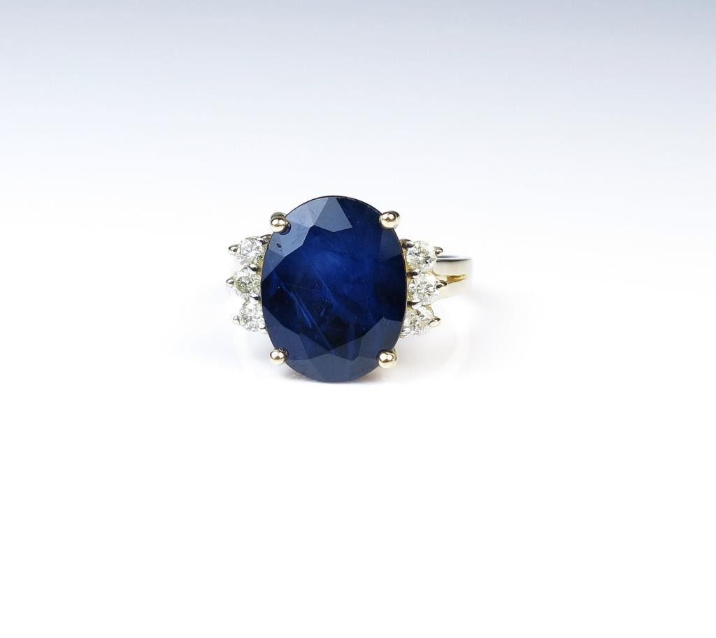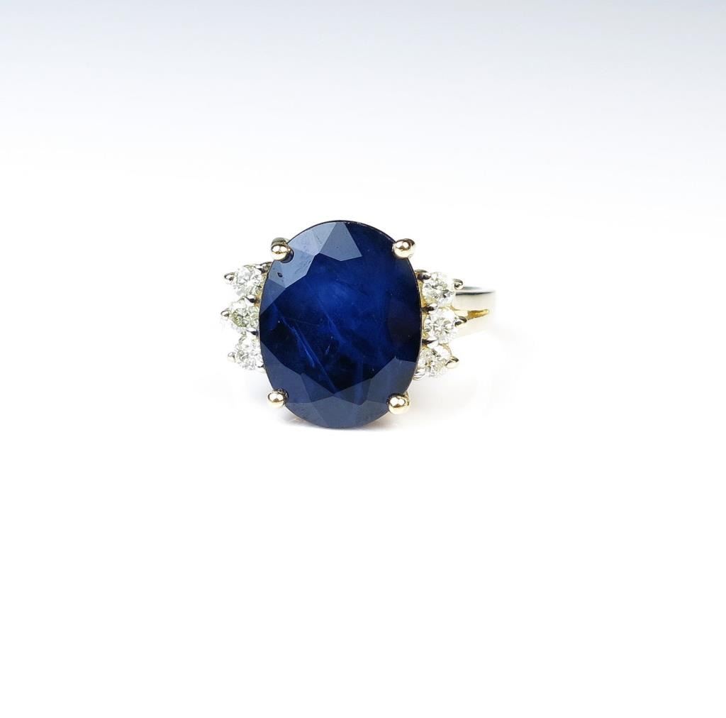 Stunning Blue Sapphire and Diamond ring featuring a large Natural Blue Sapphire weighing approx. 10.00- 12.00 carats accented with 6 side Diamonds with H-I colors and SI clarity set in 14 karat yellow gold setting. Retail $10,000- $15,000 Estimates $4,000-$6,000