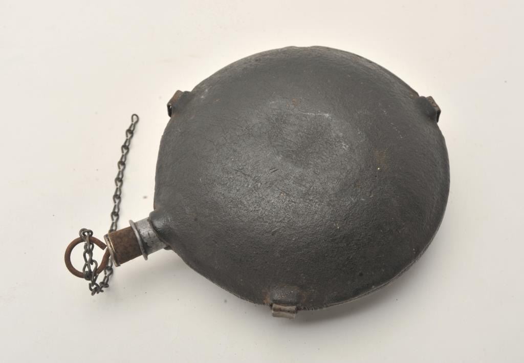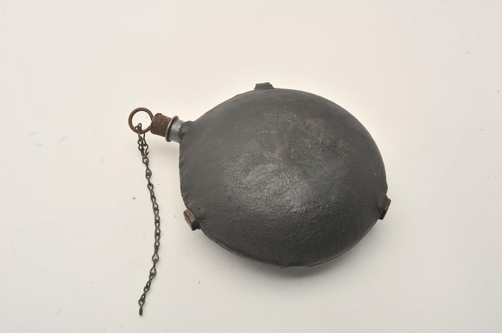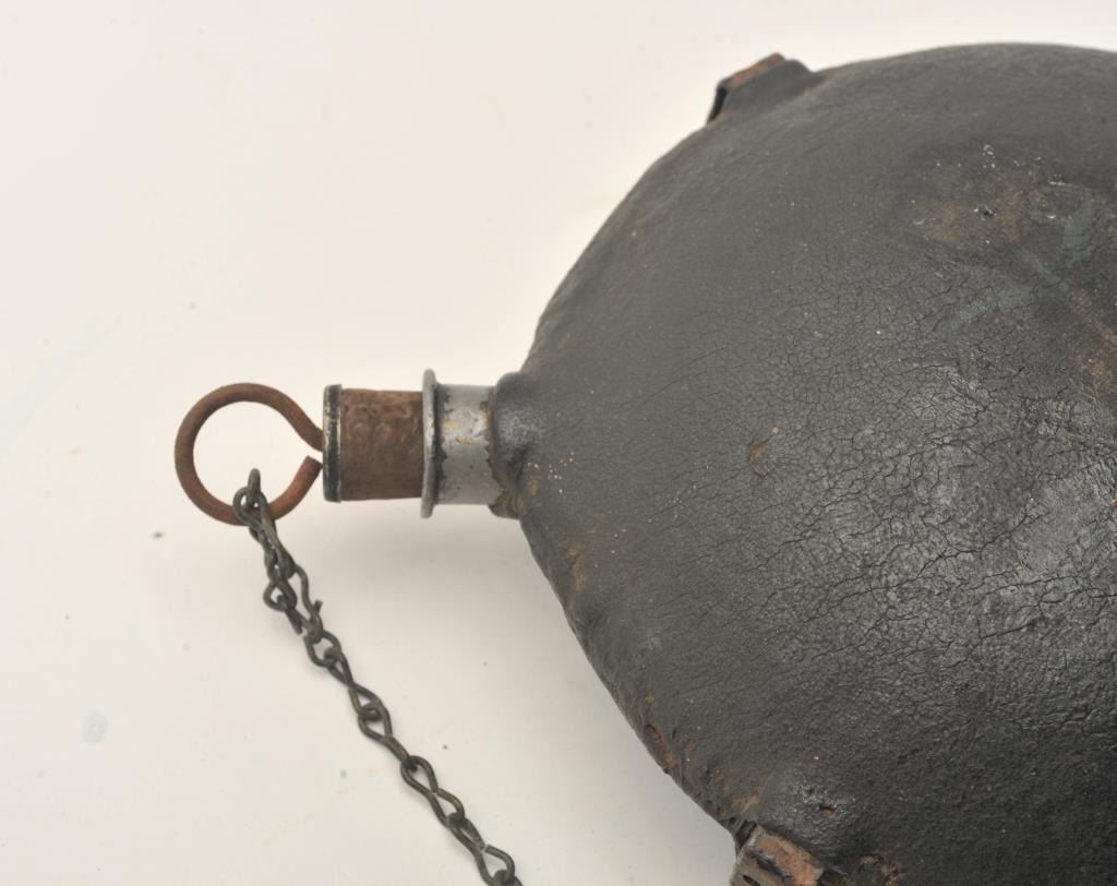 Civil War era tin circular canteen, approximately 8” in diameter with cork stopper and metal ring top with securing chain; appears to have a stitched period leather cover that is covered in what appears to be some type of tar pitch; overall good condition for age. Est.: $350-$700.