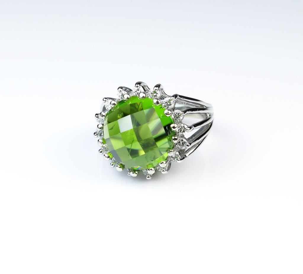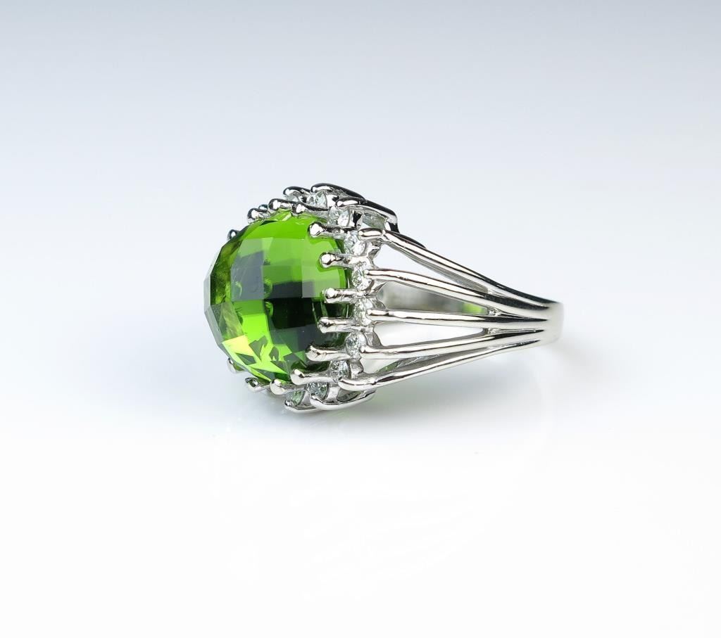 Vibrant checkerboard cut Peridot and Diamond ring featuring a fantasy cut 11.33 carat Peridot surrounded by 16 fine cut Diamonds weighing approx. 0.50 carats of F-G colors and VS clarity set in a 10 karat white goldsetting. Retail $3,000-$4,000 Estimates $2,000-$3,000