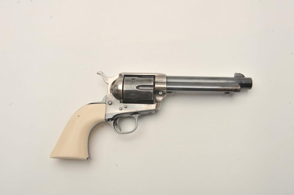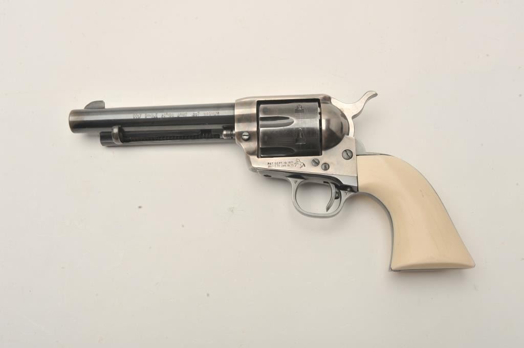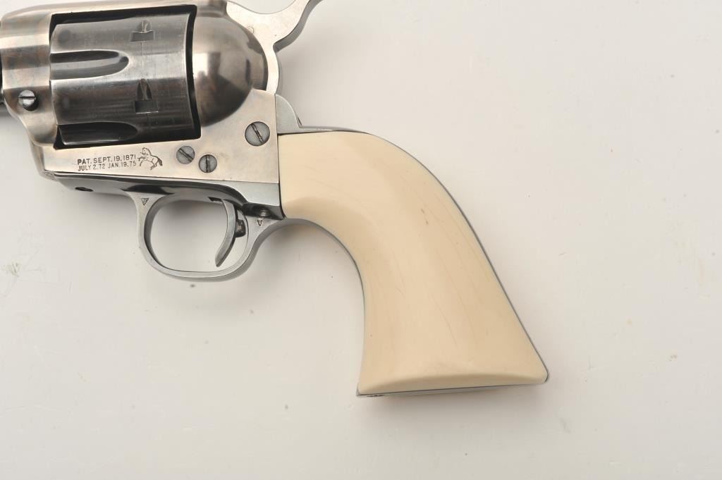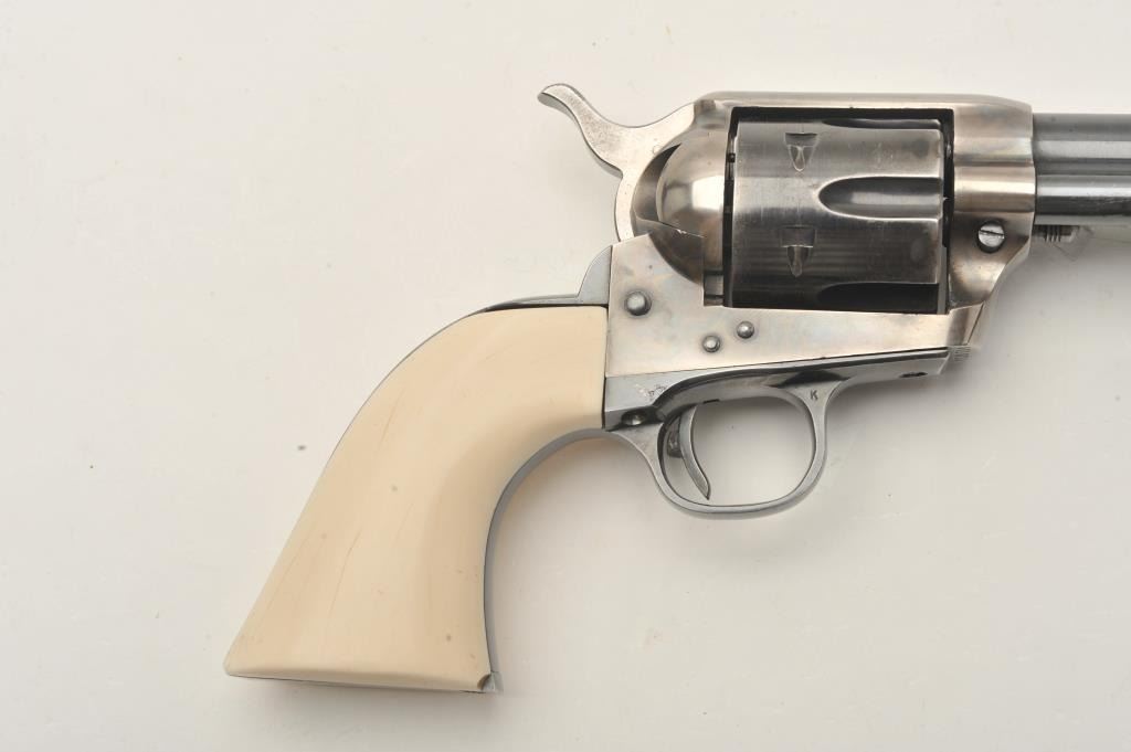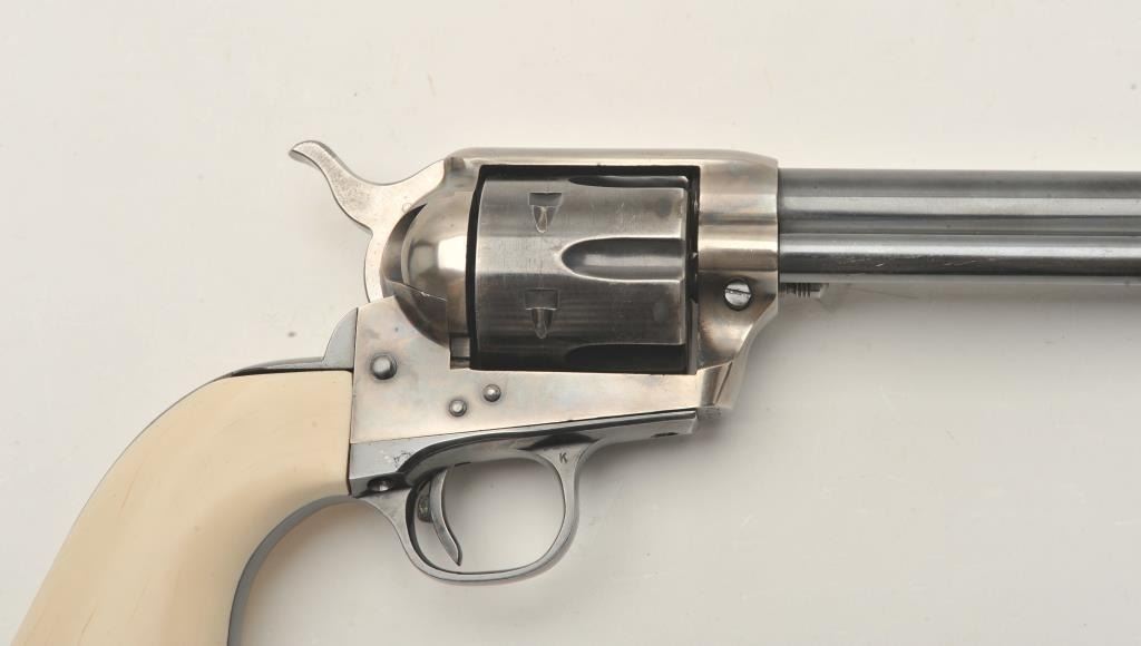 Colt SAA 2nd Generation revolver, .357 Magnum caliber, Serial #47107SA. The pistol is in very good overall condition with a 5 ½” barrel. The barrel and cylinder retain the majority of their blue finish with holsterwear at the muzzle and a drag line evident on the cylinder. The frame shows significant muted case hardening, while the hammer has been engine turned and an action job has been completed during the period of use. Thesmooth ivory grips are in good condition with a small flea bite chip at the front base of the right panel. The bore is good, the action functions and markings are sharp on this desirable 2nd Gen. manufactured in 1968. Est.: $1,250-$2,500. (C+R/PPT).
