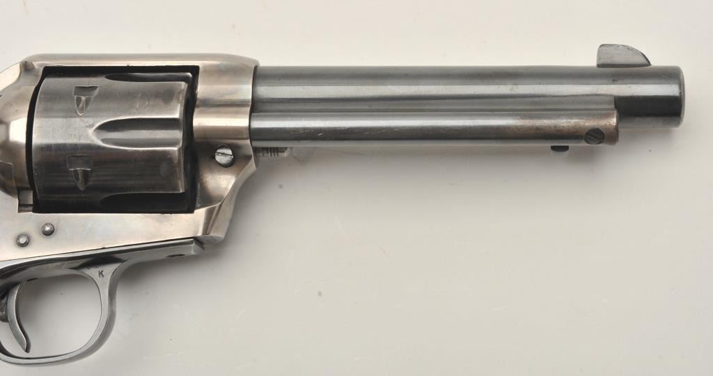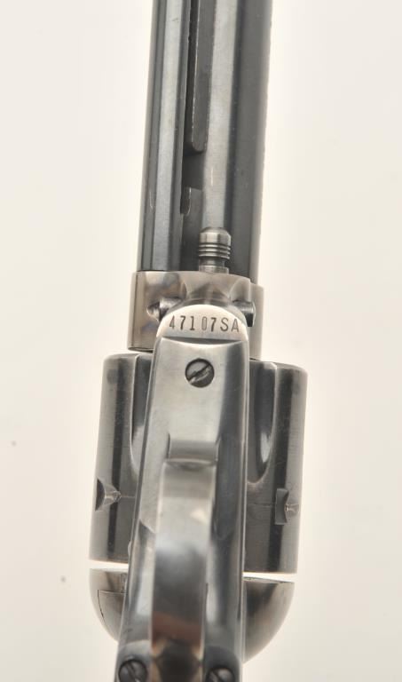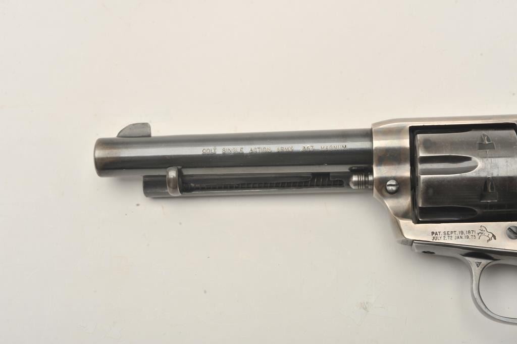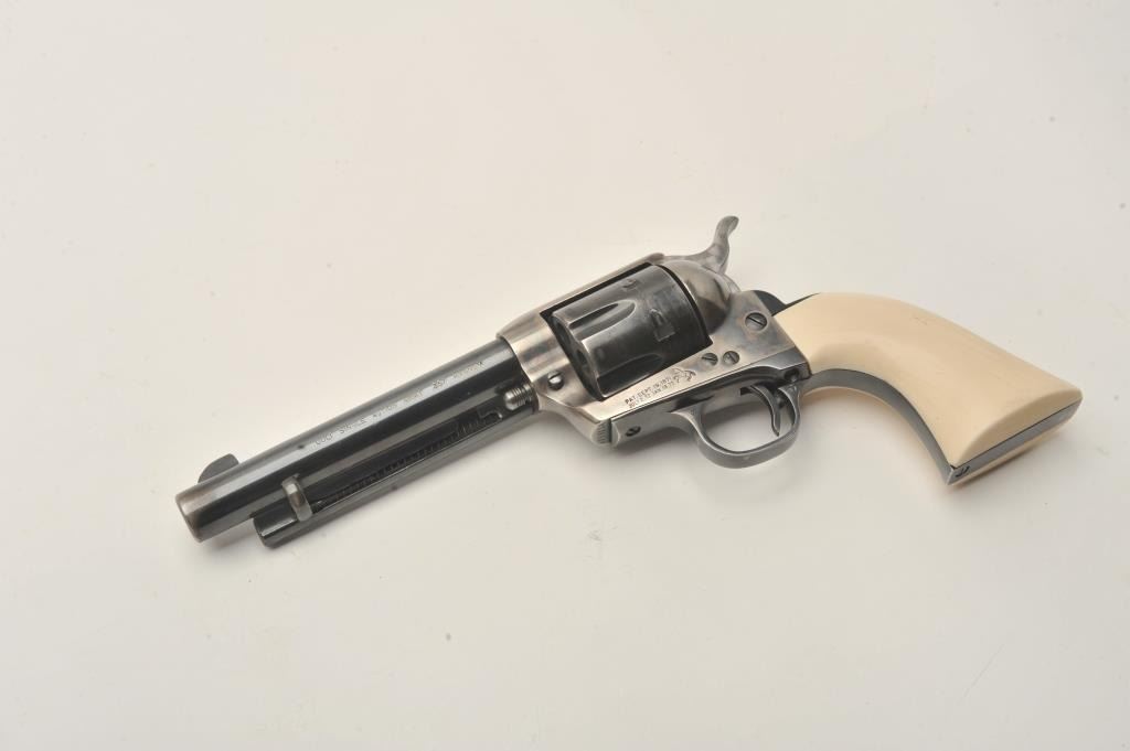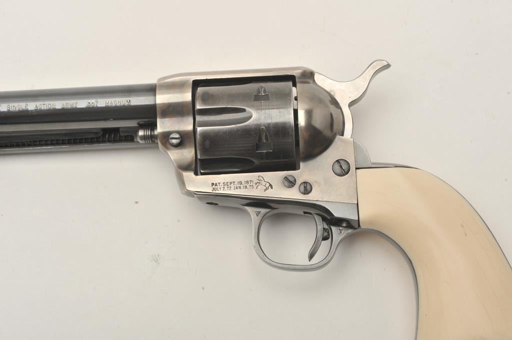 Colt SAA 2nd Generation revolver, .357 Magnum caliber, Serial #47107SA. The pistol is in very good overall condition with a 5 ½” barrel. The barrel and cylinder retain the majority of their blue finish with holsterwear at the muzzle and a drag line evident on the cylinder. The frame shows significant muted case hardening, while the hammer has been engine turned and an action job has been completed during the period of use. Thesmooth ivory grips are in good condition with a small flea bite chip at the front base of the right panel. The bore is good, the action functions and markings are sharp on this desirable 2nd Gen. manufactured in 1968. Est.: $1,250-$2,500. (C+R/PPT).