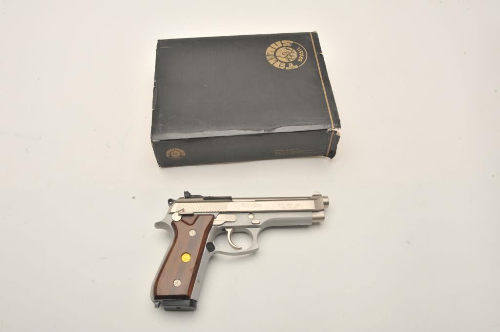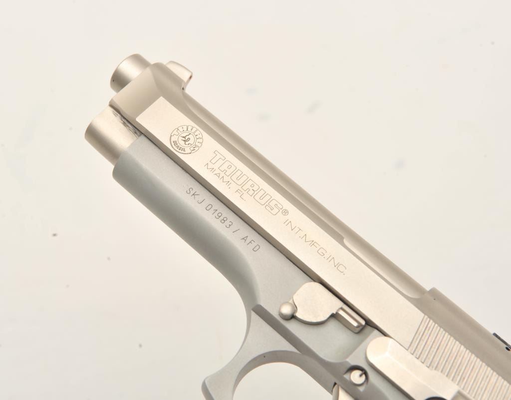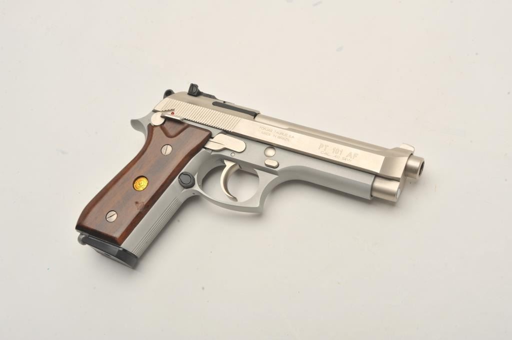 Taurus PT 101 AF semi-automatic pistol, .40 S& W caliber, Serial #SKJ01983/AFD. The pistol is in very good overall condition with a 4 ¾” barrel. The pistol retains nearly all of its matte stainless steel finish withonly light handling marks. The smooth wood medallion grips are in very good condition showing little use or wear. The lot includes one correct magazine. The lot includes the original factory cardboard sleeve withcleaning brush. The bore is good, the action is crisp and markings are sharp on this lightly used Taurus. Est.: $300-$600. (Modern/PPT).