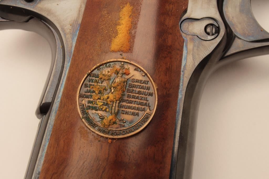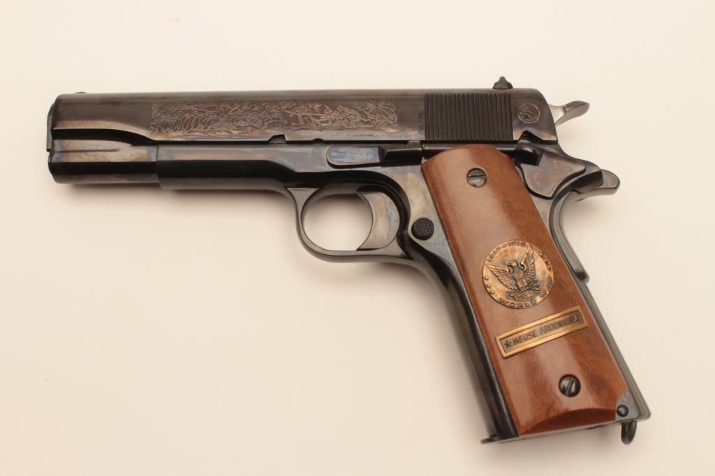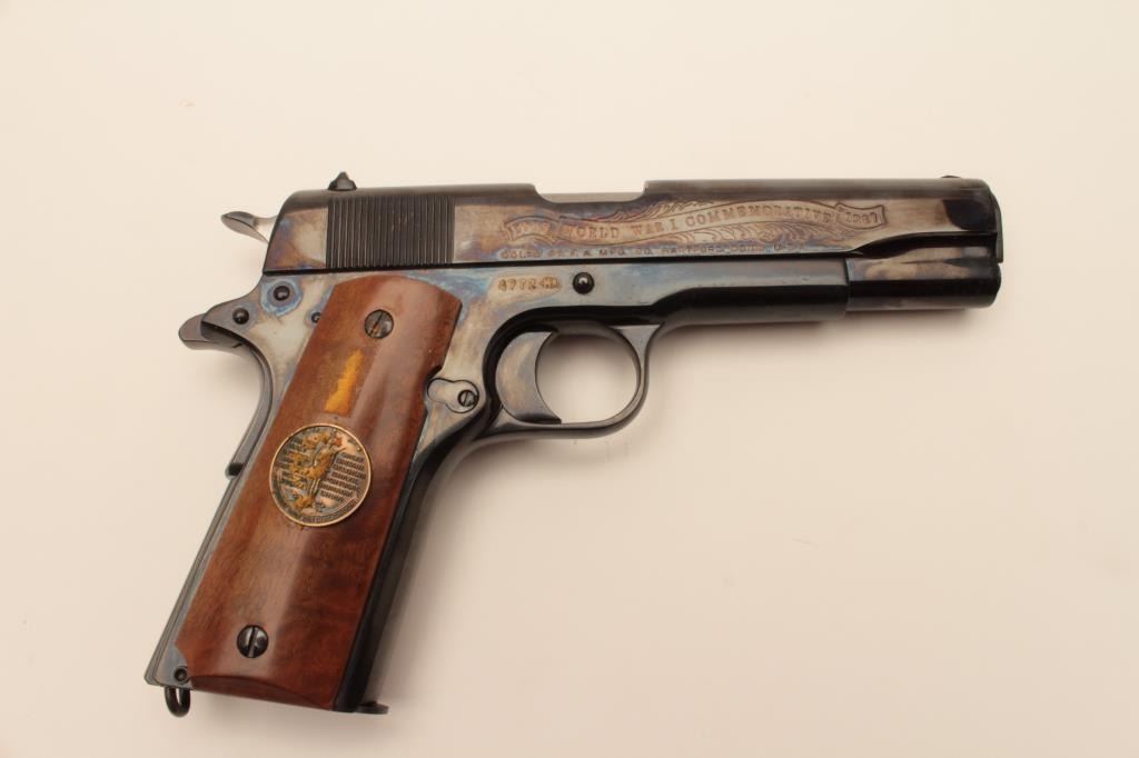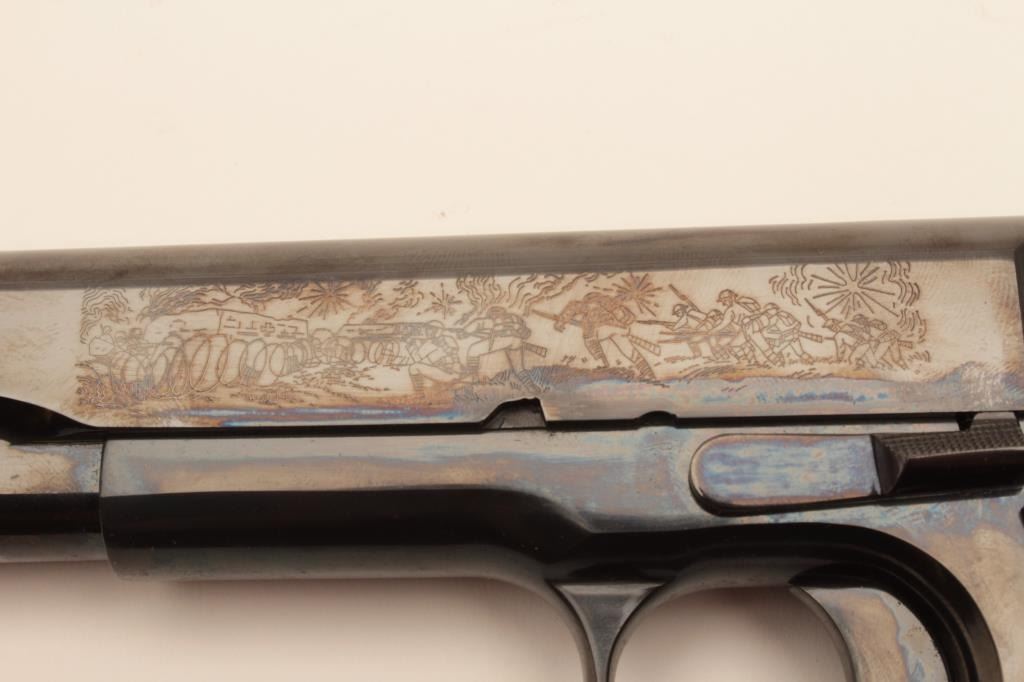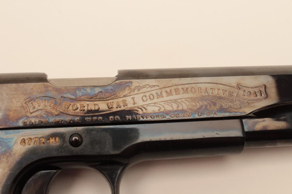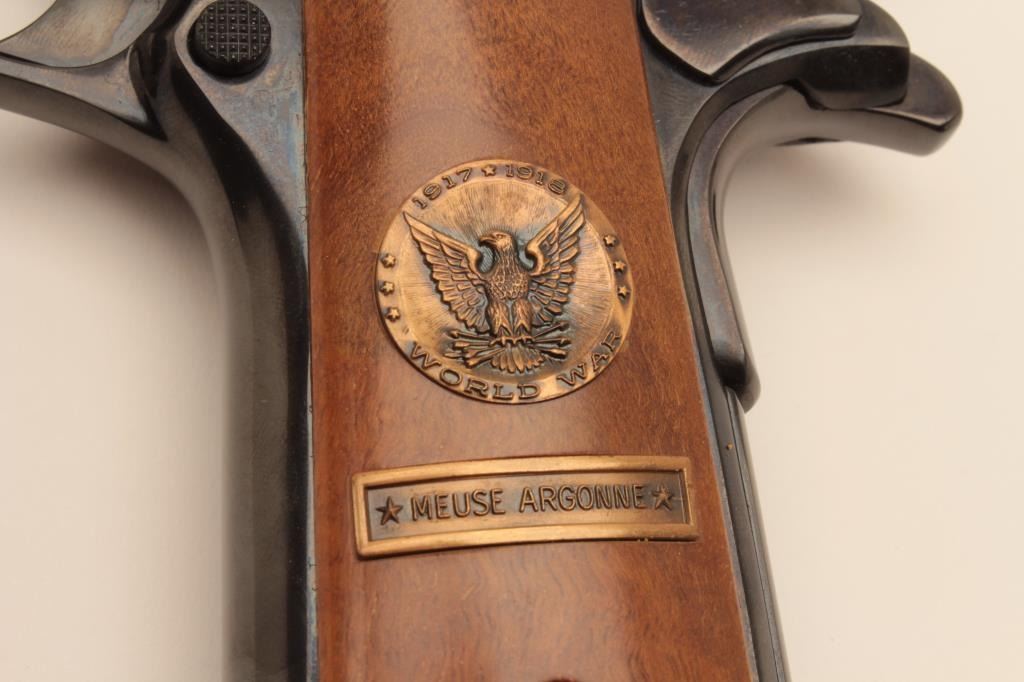 Colt WWI Commemorative Model 1911 .45 auto with ornamentation relating to Meuse Argonne offensive. Fine to excellent condition. Normal spot at contact point between pistol and brass brackets in case. Marks fromstorage on case. No evidence of firing or use. 98%-99% overall. S/N 4772MA. (C&R/PPT) Est.: $700-$1400
