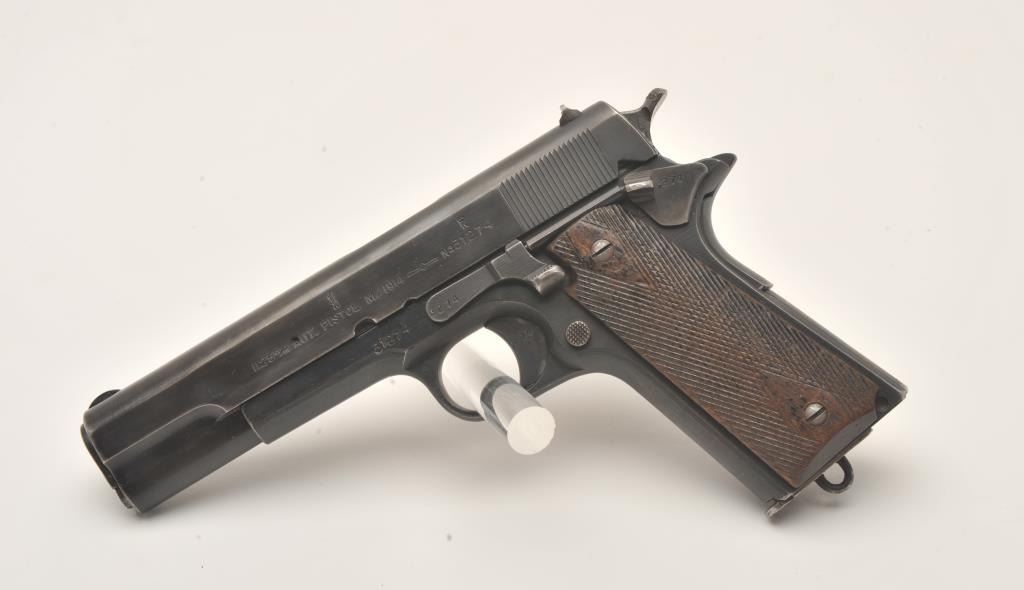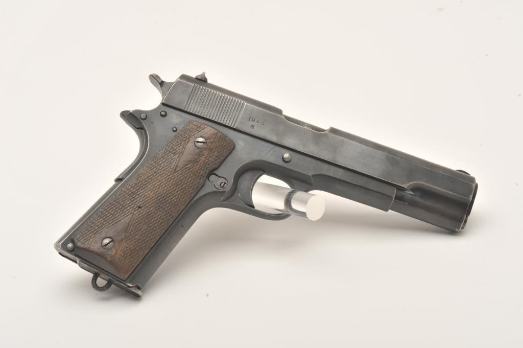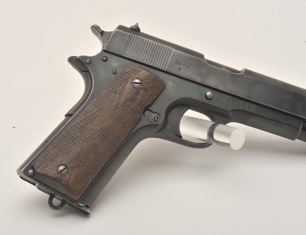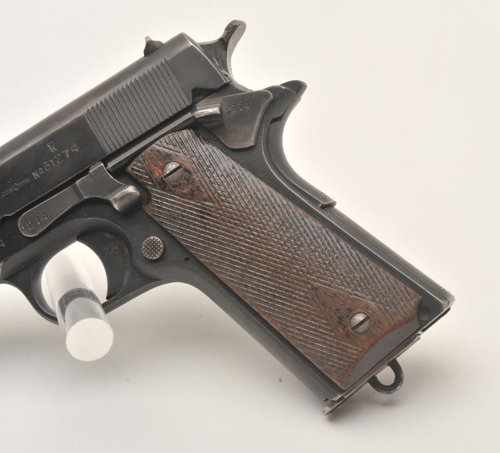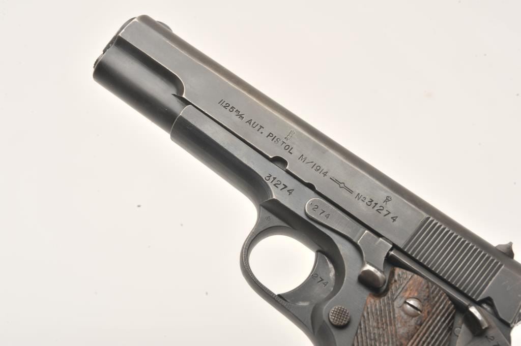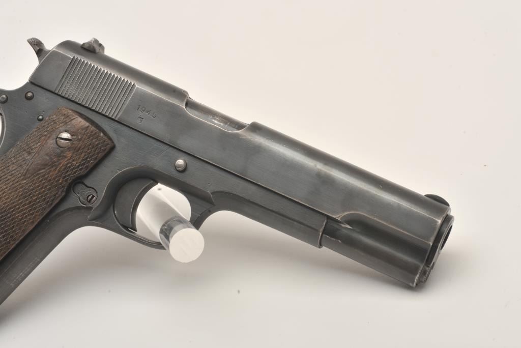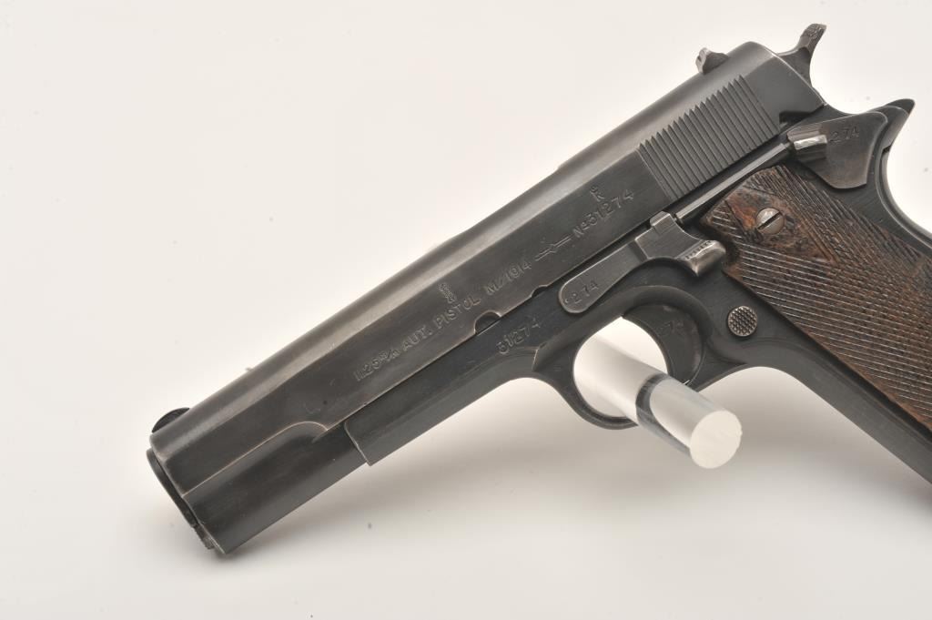 Norwegian Kongsberg Vapenfabrikk Model 1914 Norwegian Colt 1911 style semi-automatic pistol (ca. 1945), .45 caliber, 5” barrel, blued finish, checkered wood grips, lanyard ring magazine, no import marks, S/N 31274,matching visible numbers, overall good to very good condition with a good + bore, crisp action, sharp markings and overall good grips. Includes notes from consignor that mention, among other information, that 32,874 Norwegian Model 1914’s were produced with this one having the date 1945 stamped on the right side of the slide; no German waffen marks on this pistol. (C&R). Est.: $500-$1,000.