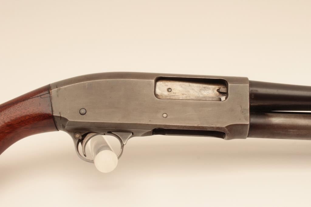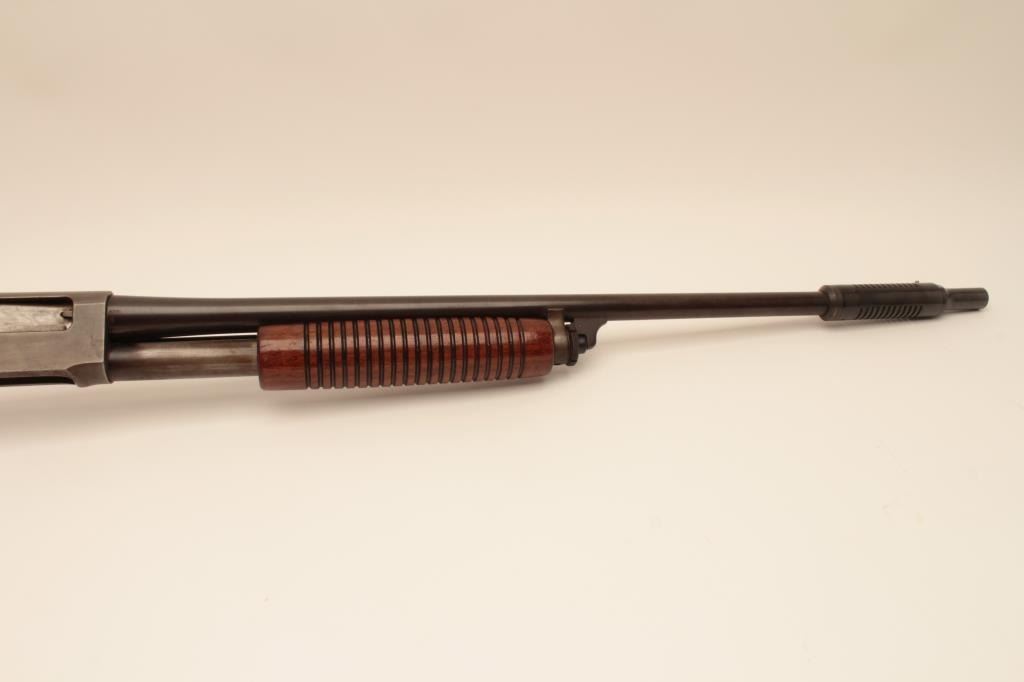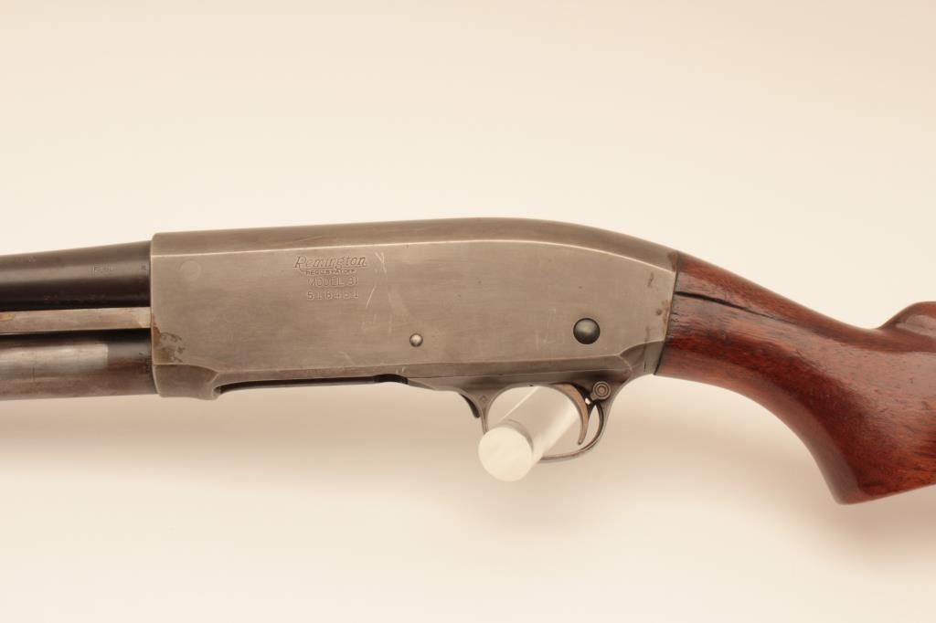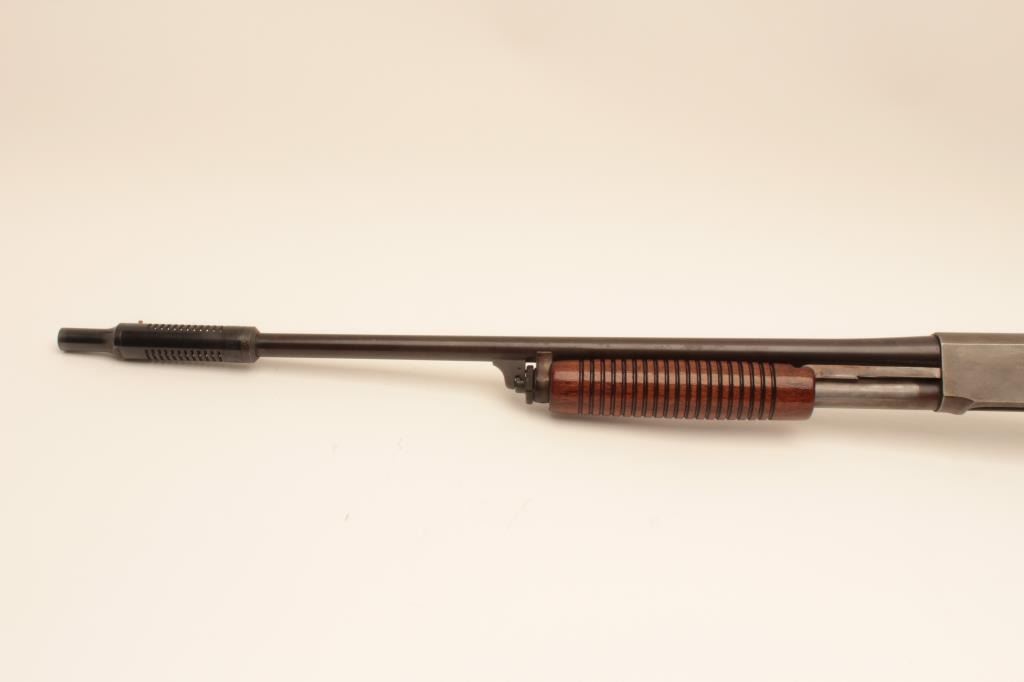 Remington 31 pump shotgun, #518451, 20 Ga, 26" barrel with Cutts compensator, smooth walnut stock with rubber recoil pad added. Shotgun is in good condition overall, as cut down for Cutts compensator, wood has beenre-varnished, stock has an old, approximate 2" crack in the wrist on the left side, and 3" crack on the right side. Finish on receiver has thinned to approximately 20%, barrel has turned brown and retainsapproximately 60-70% original finish. Cutts has Modified choke in it. Trigger does not reset and will need fixing. (C&R) Est. $150-300