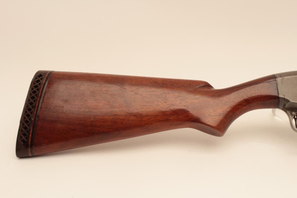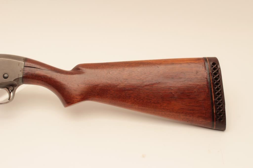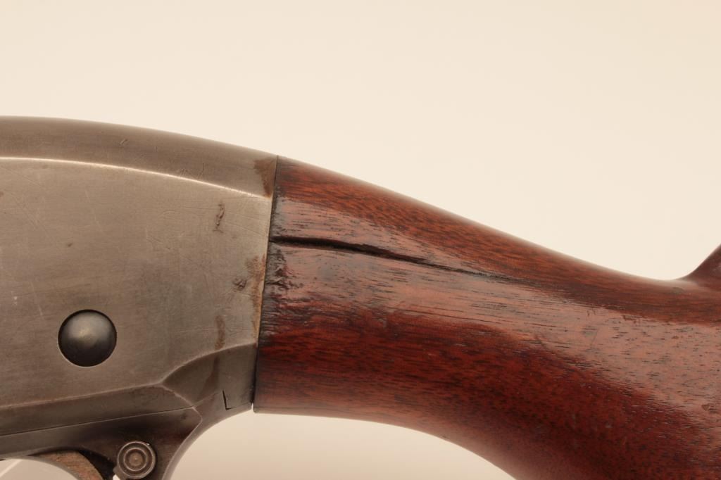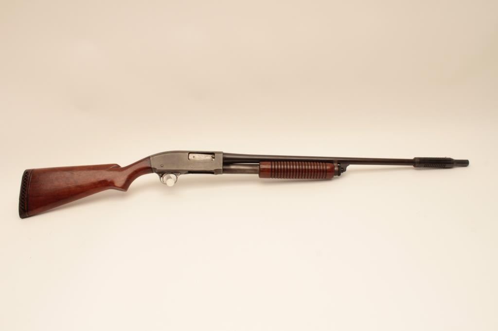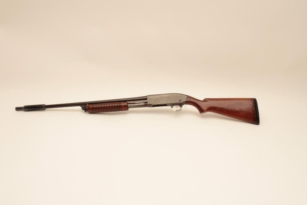Remington 31 pump shotgun, #518451, 20 Ga, 26" barrel with Cutts compensator, smooth walnut stock with rubber recoil pad added. Shotgun is in good condition overall, as cut down for Cutts compensator, wood has beenre-varnished, stock has an old, approximate 2" crack in the wrist on the left side, and 3" crack on the right side. Finish on receiver has thinned to approximately 20%, barrel has turned brown and retainsapproximately 60-70% original finish. Cutts has Modified choke in it. Trigger does not reset and will need fixing. (C&R) Est. $150-300