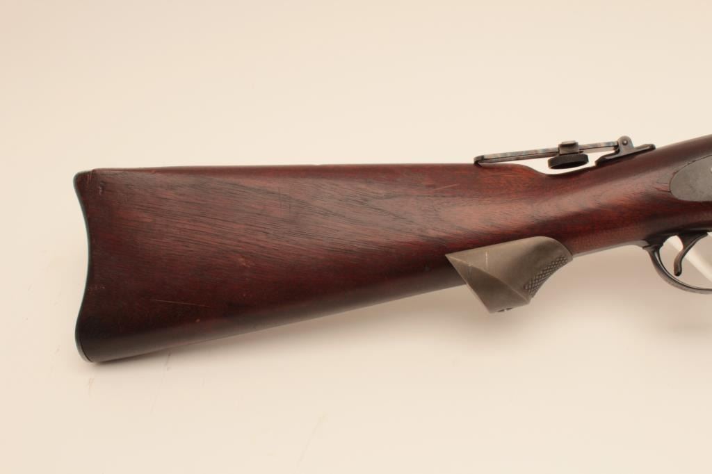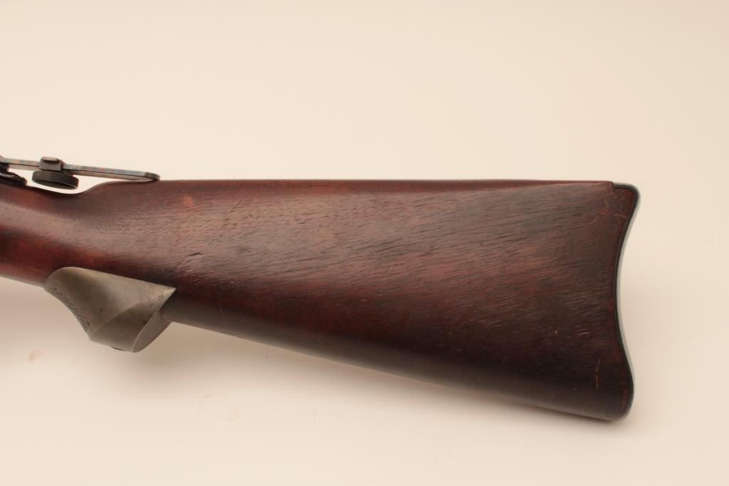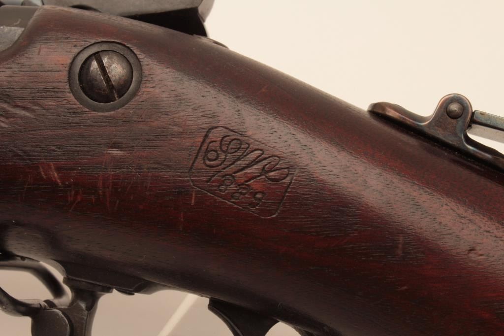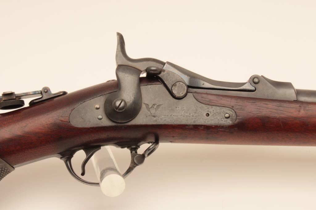 Springfield Trapdoor rifle, #491714, .45-70 cal., 32 1/2" barrel, officers style peep sight with globe front sight, officers style pistol grip cap. Rifle is in very good condition, as refinished, original rear sight removed, 1889 cartouche on left side of stock . 'MN0690600H262' scratched into trigger guard. Bore is bright, action is good, stock is very good. (Antique) Est. $500-1000