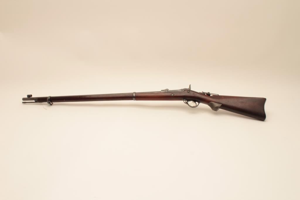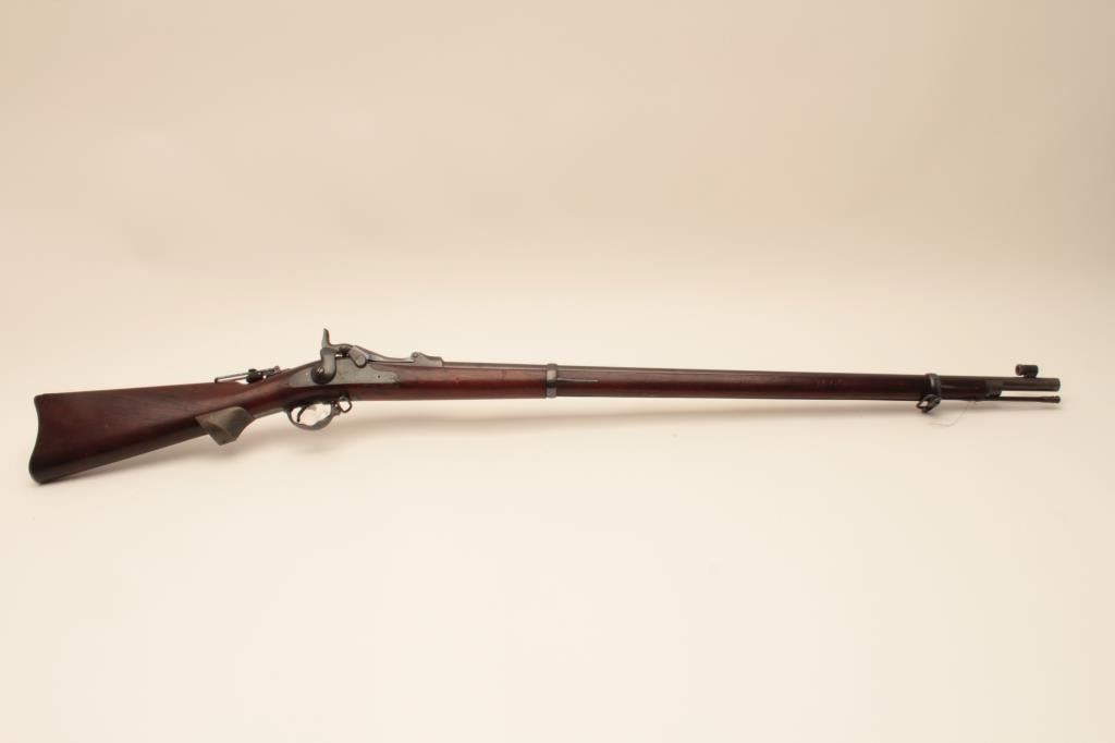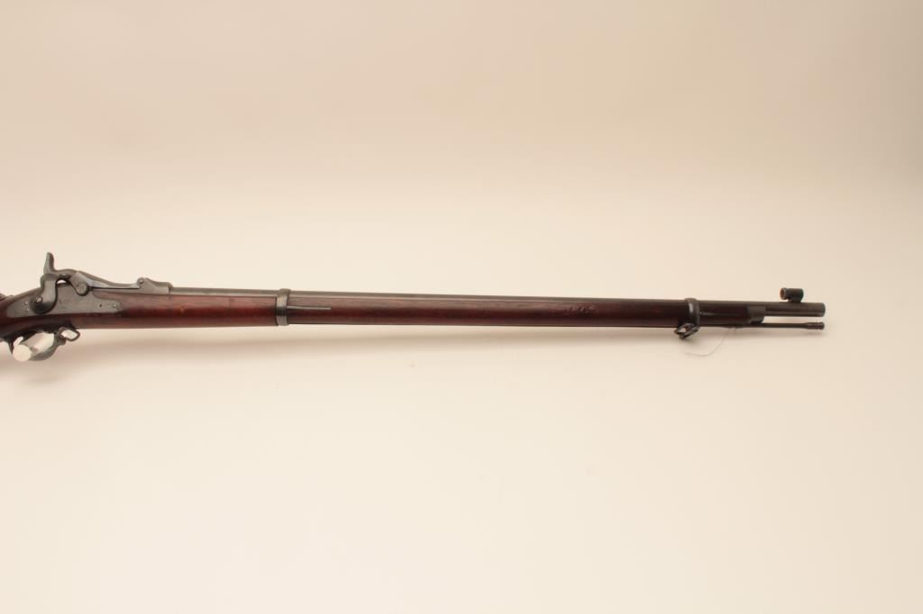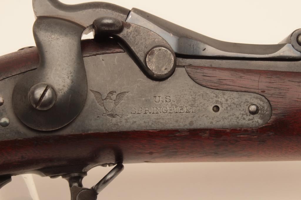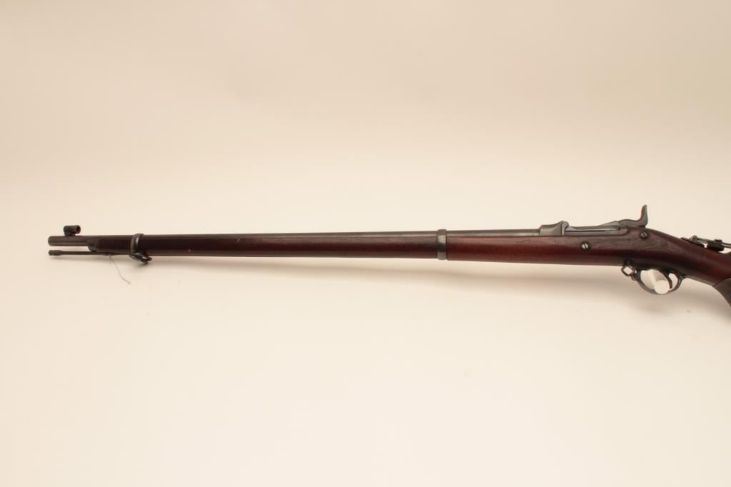 Springfield Trapdoor rifle, #491714, .45-70 cal., 32 1/2" barrel, officers style peep sight with globe front sight, officers style pistol grip cap. Rifle is in very good condition, as refinished, original rear sight removed, 1889 cartouche on left side of stock . 'MN0690600H262' scratched into trigger guard. Bore is bright, action is good, stock is very good. (Antique) Est. $500-1000