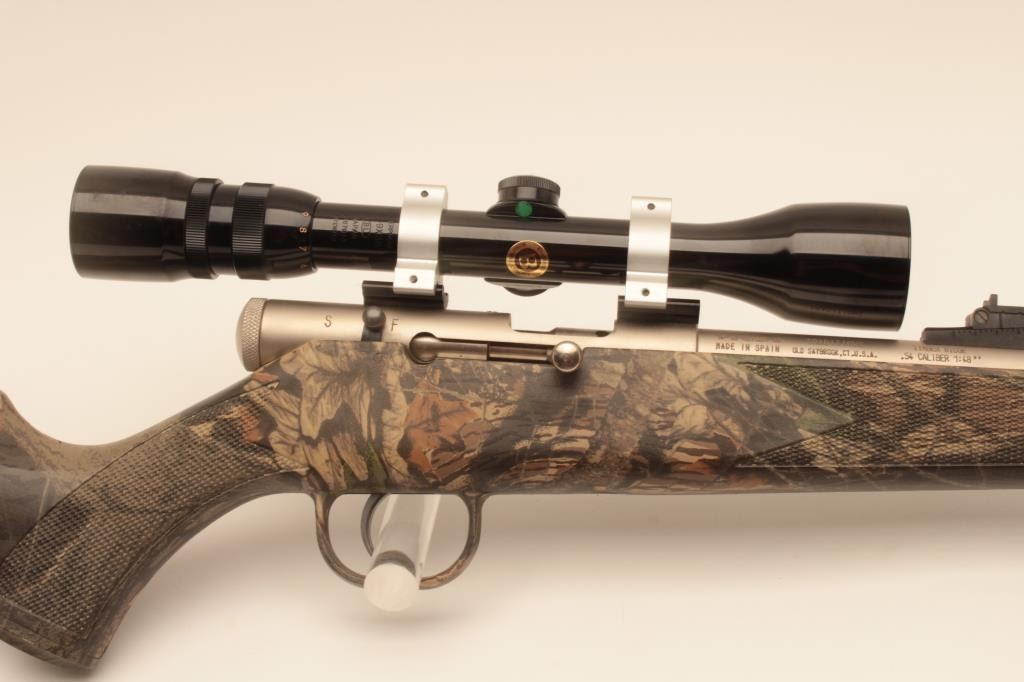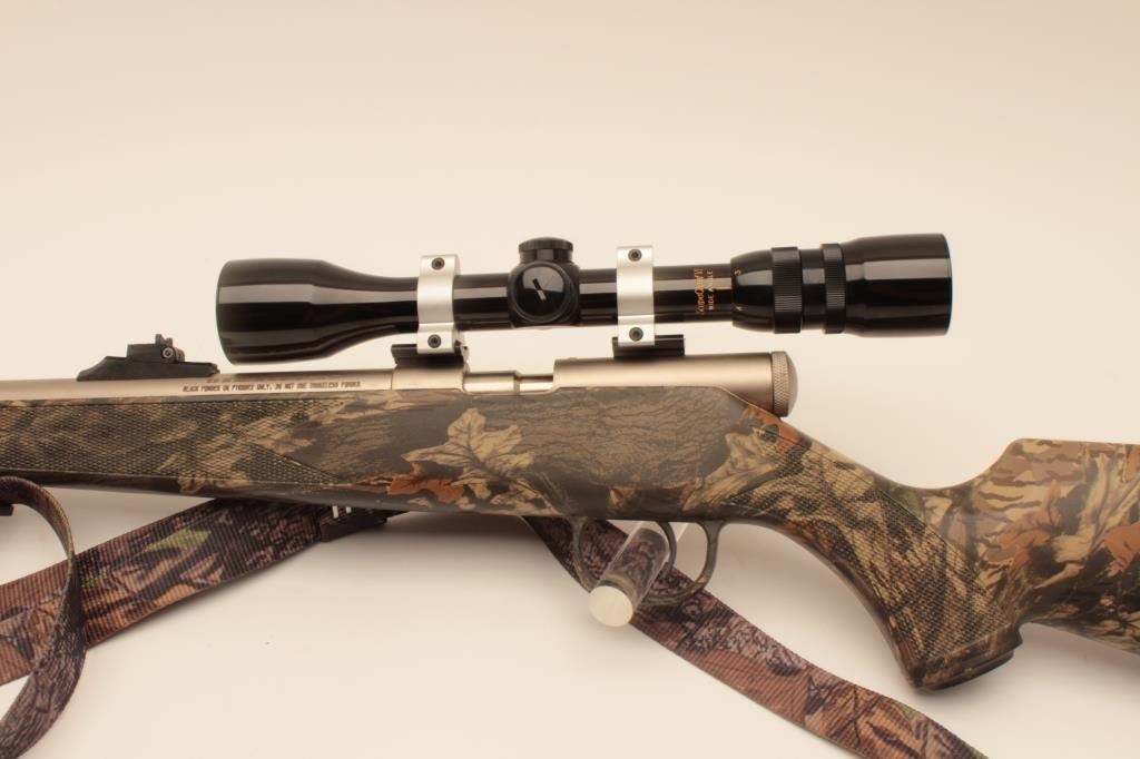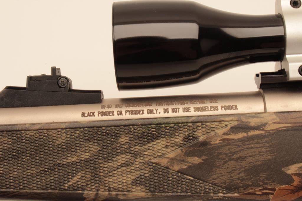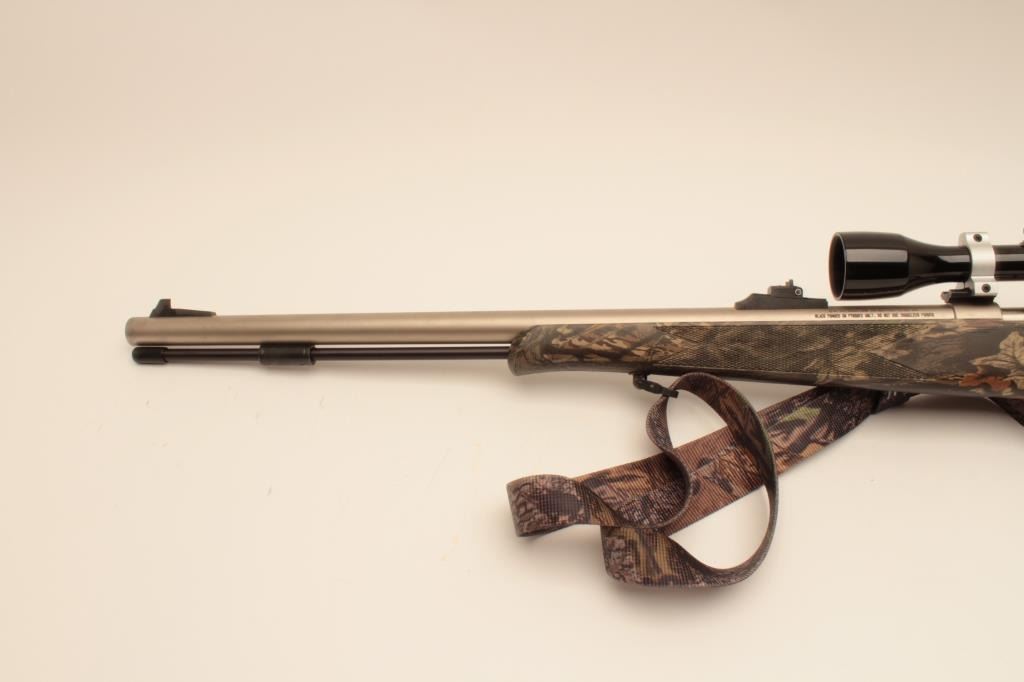 Traditions Timber Ridge in line black powder rifle, #14-13-027035-00, .54 cal black powder cal, stainless with camouflage synthetic stock and nylon sling. Rifle is in fine condition overall, good action, mounted witha Bushnell Scope Chief IV 3-9. (Modern) Est. $100-200