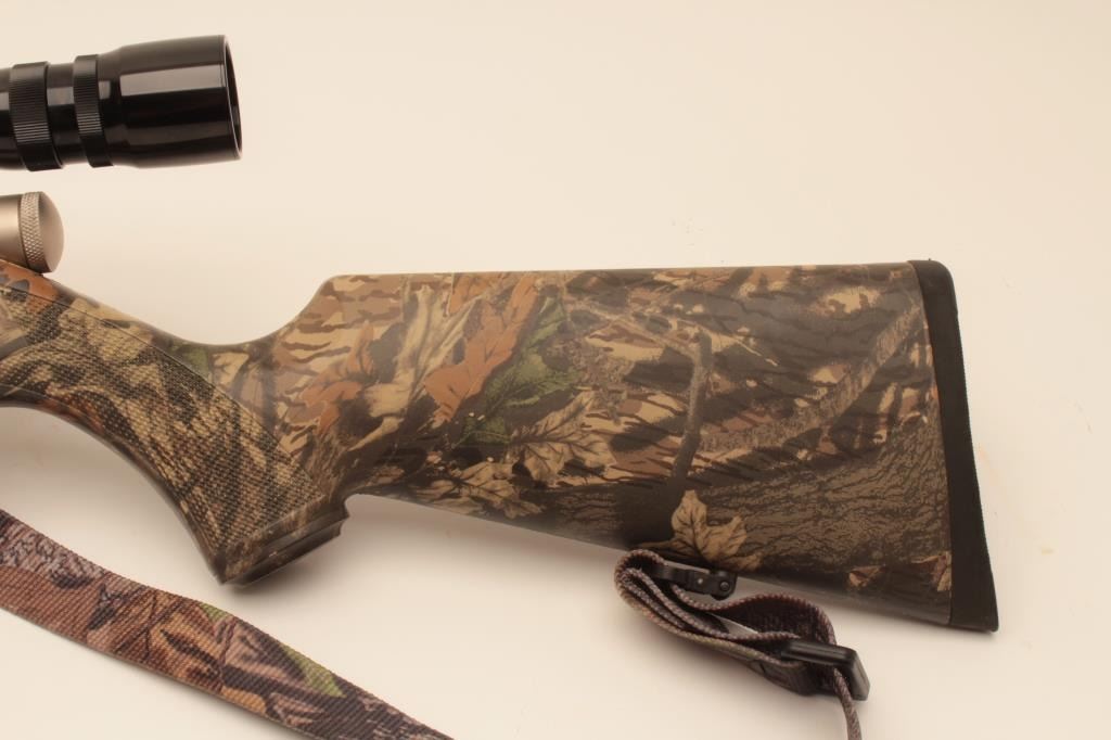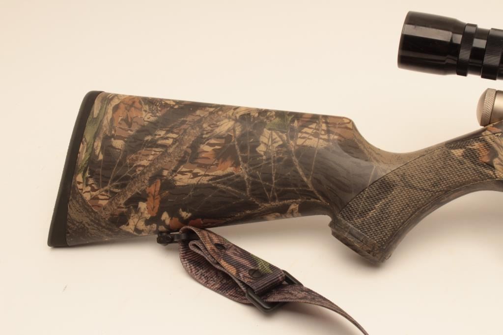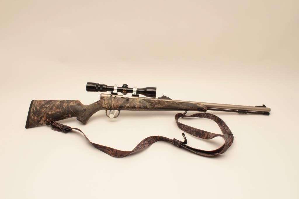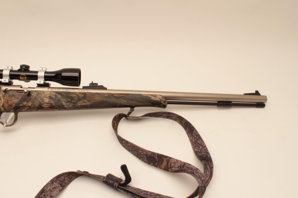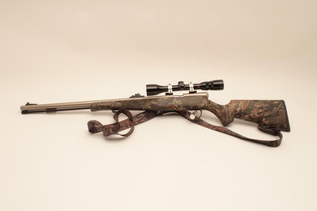 Traditions Timber Ridge in line black powder rifle, #14-13-027035-00, .54 cal black powder cal, stainless with camouflage synthetic stock and nylon sling. Rifle is in fine condition overall, good action, mounted witha Bushnell Scope Chief IV 3-9. (Modern) Est. $100-200