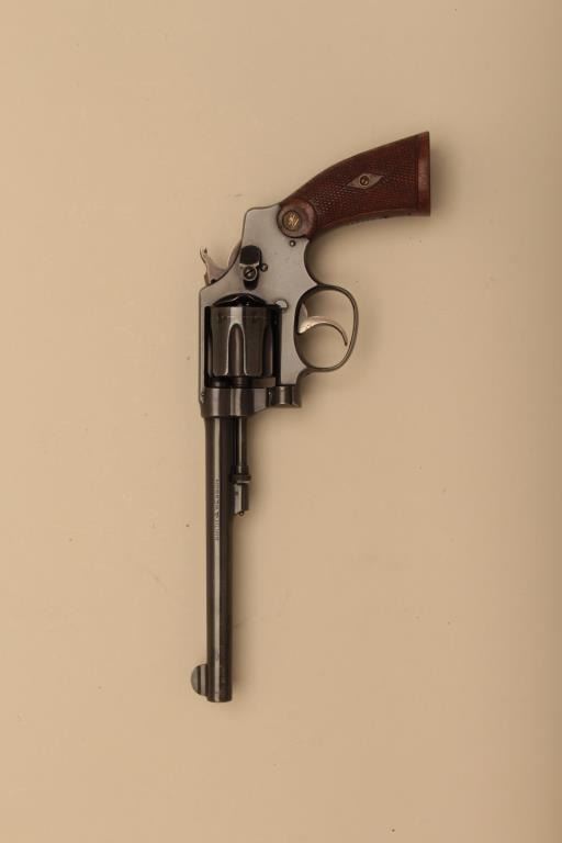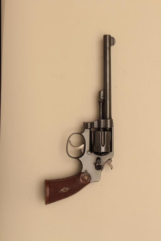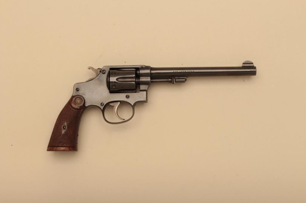 Smith & Wesson 32 hand ejector DA revolver, .32 Long caliber, desirable 6” barrel, blued finish, checkered wood gold medallion grips, S/N 307692; overall near new condition with slight muzzle wear. (C&R). Est.: $350-$700.
