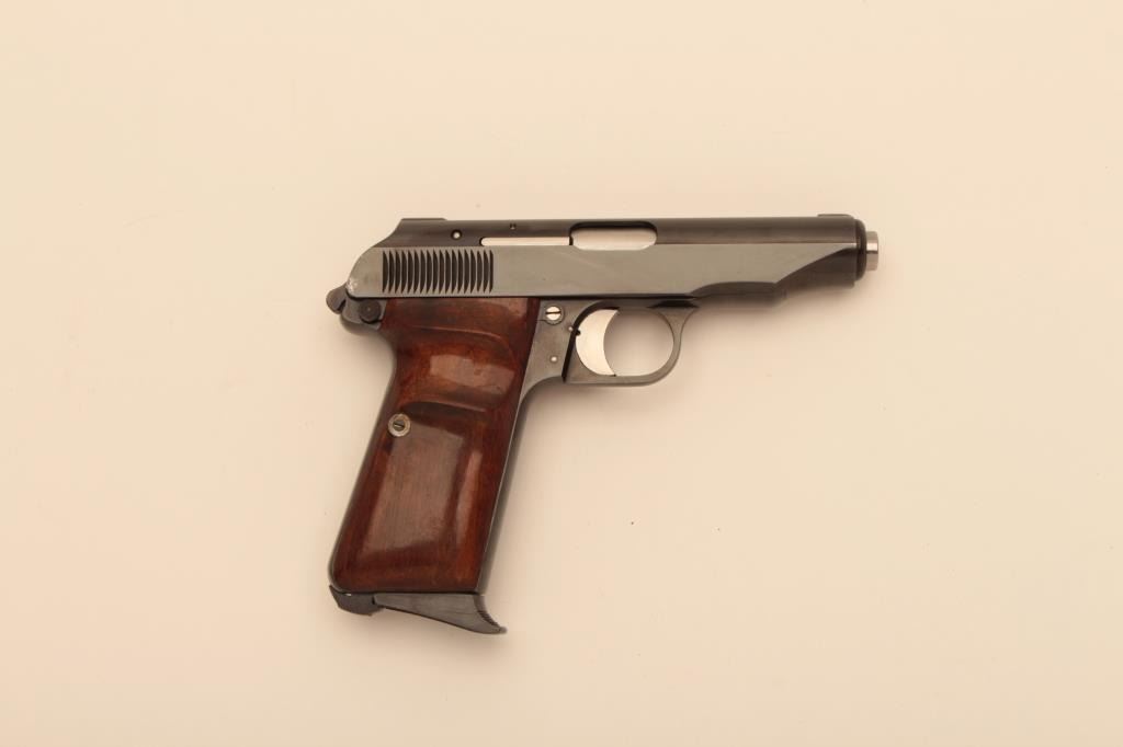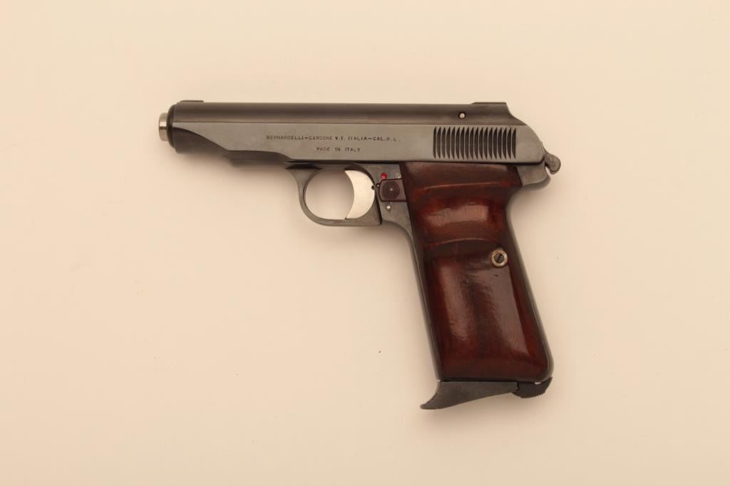 Bernardelli Model UB Pistol Automatica, #23, 9mm, blued finish, exposed hammer, plain wood grips with thumb rest. Pistol is in fine plus condition, retaining approximately 95-98% original finish, grips are fine,showing just slight handling marks. Bore is very good, action is crisp. Very rare, exposed hammer version of the UB pistol. (C&R/PPT) Est. $1000-2000