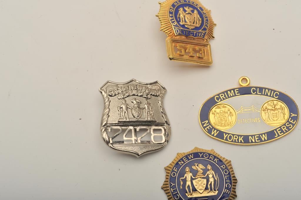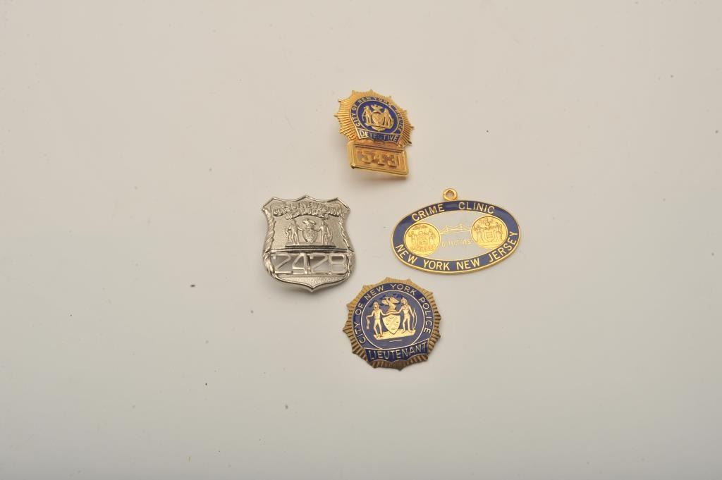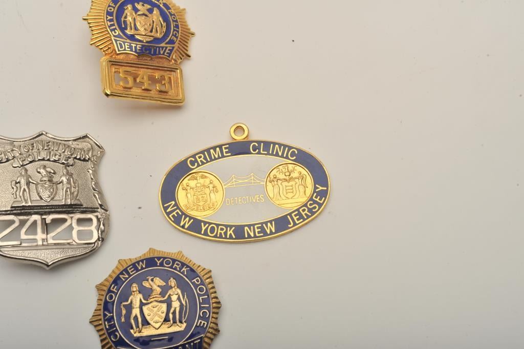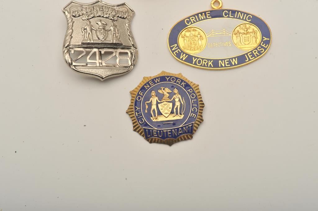 Lot of 4 badges including a City of New York Police Lieutenant pin shield badge, a City of New York Police pin shield badge #2428, a New York/New Jersey Crime Clinic medallion and a City of New York Police Detective capbadge #543. Est.: $200-$400.