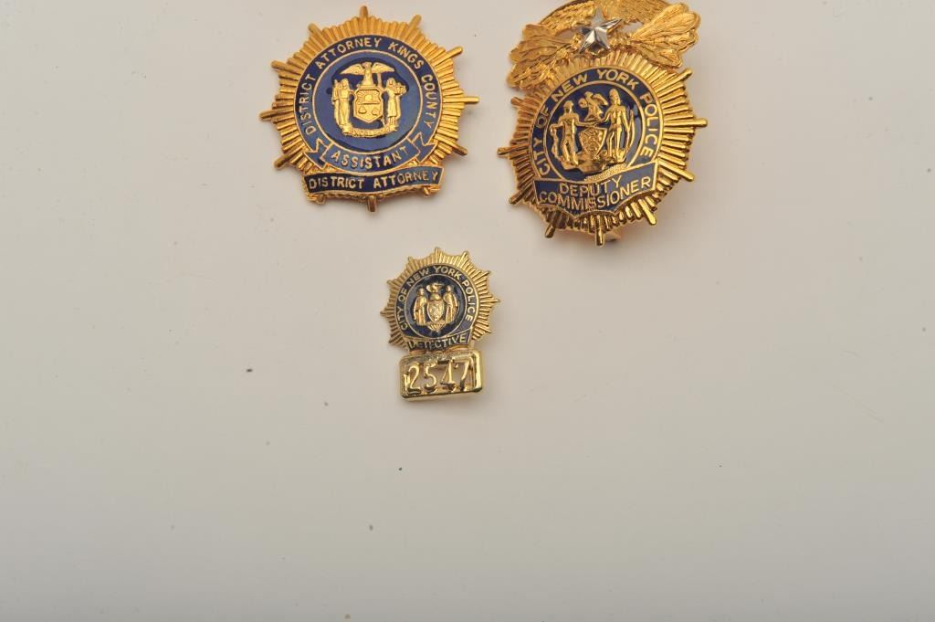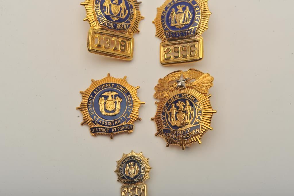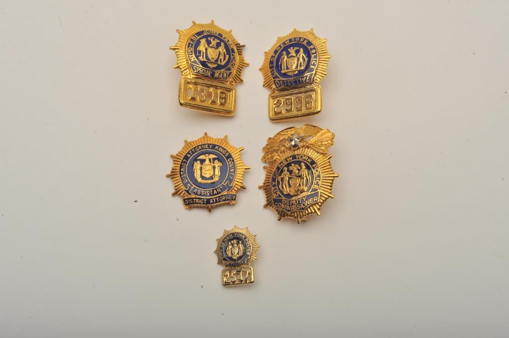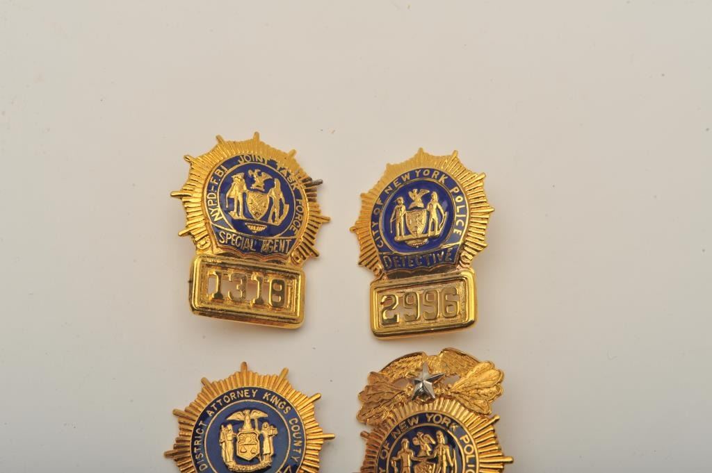 Lot badges including a District Attorney Kings County (New York) Assistant DA pin shield badge, a small City of New York Police Detective lapel pin badge #2547, a City of New York Police Detective cap badge #2996, aCity of New York Police Deputy Commissioner cap badge and an NYPD-FBI Joint Task Force Special Agent cap badge #1318. Est.: $200-$400.