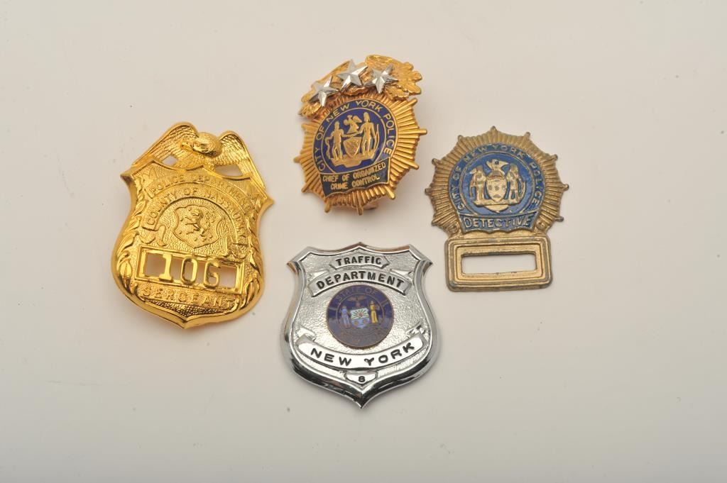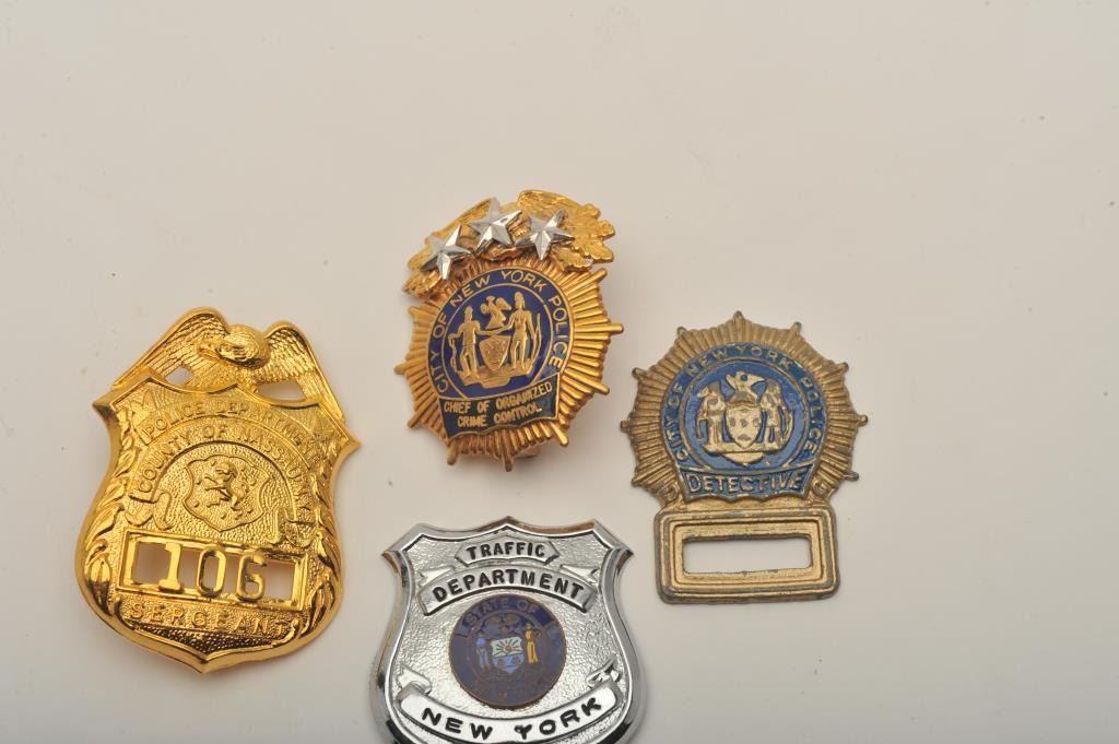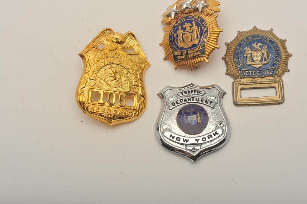 Lot of 4 badges including a State of New York Traffic Dept. pin shield #8, a City of New York Detective flat badge missing number, a City of New York Police Chief of Organized Crime Control cap badge and a PoliceDepartment County of Nassau N.Y. Sergeant cap badge #106. Est.: $200-$400.