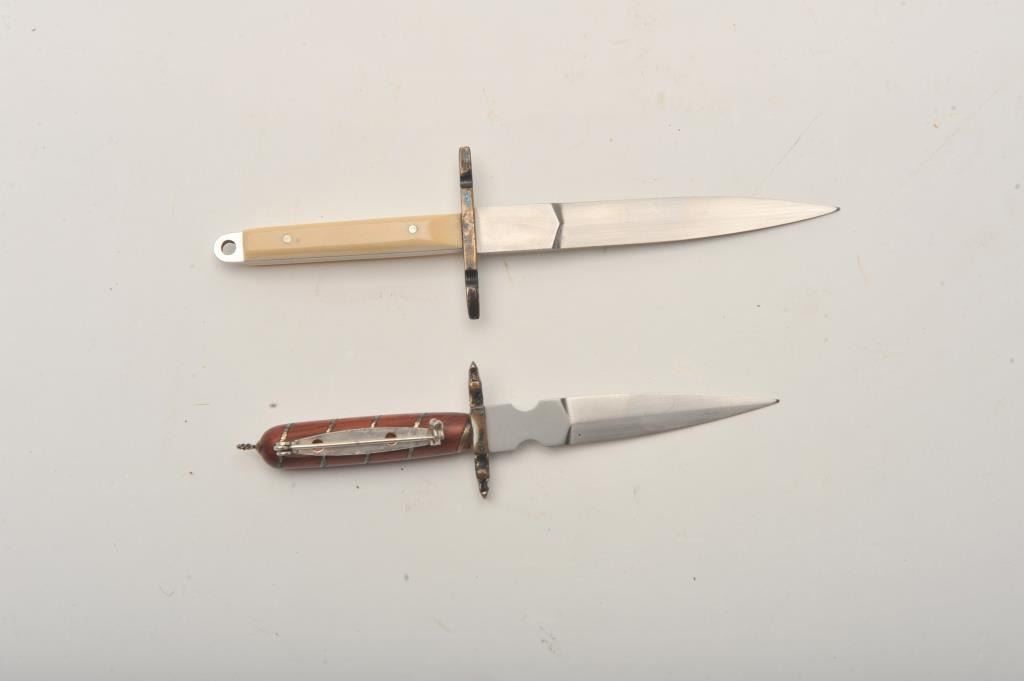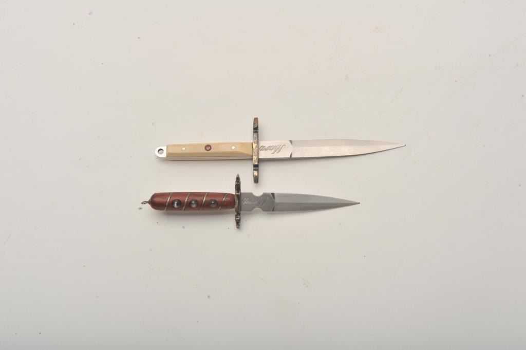 Lot of two miniature toothpick style knives by Peter Marzitelli. The knives are 4” and 5” long with the shorter knife having a clasp added to worn as a pin. Both knives are marked, “MARZ” at the ricasso. Est.:$100-$200.