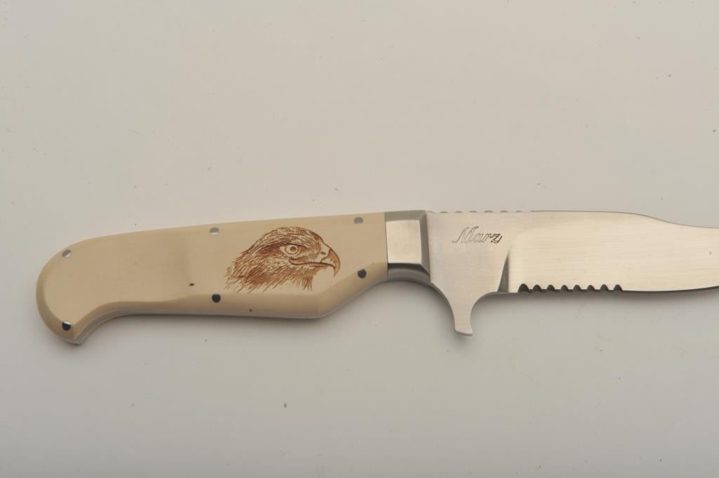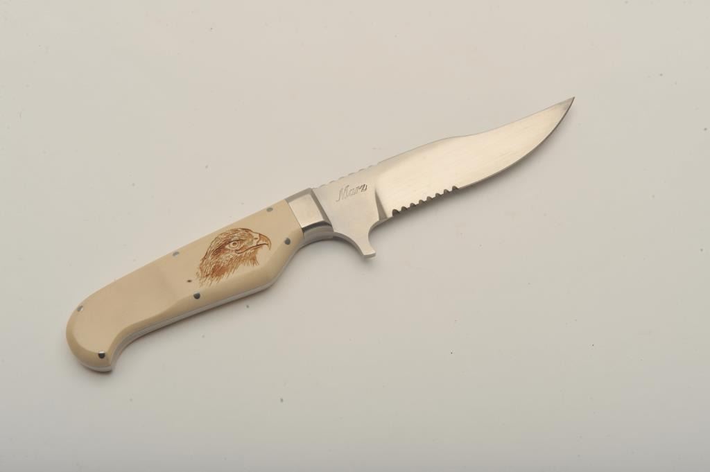 “The HOK” limited edition custom knife by Peter Marzitelli made exclusively for the House of Knives. The knife has an overall length of 8 ¾” with a 4 ½” clip point blade of satin finished ATS-34 stainless steel.The handle material is contoured bone micarta with laser etched hawk motif with a stainless bolster and pins. The knife was part of an extremely limited edition of 50, in as new condition by the noted Canadianknife maker. Est.: $200-$400.