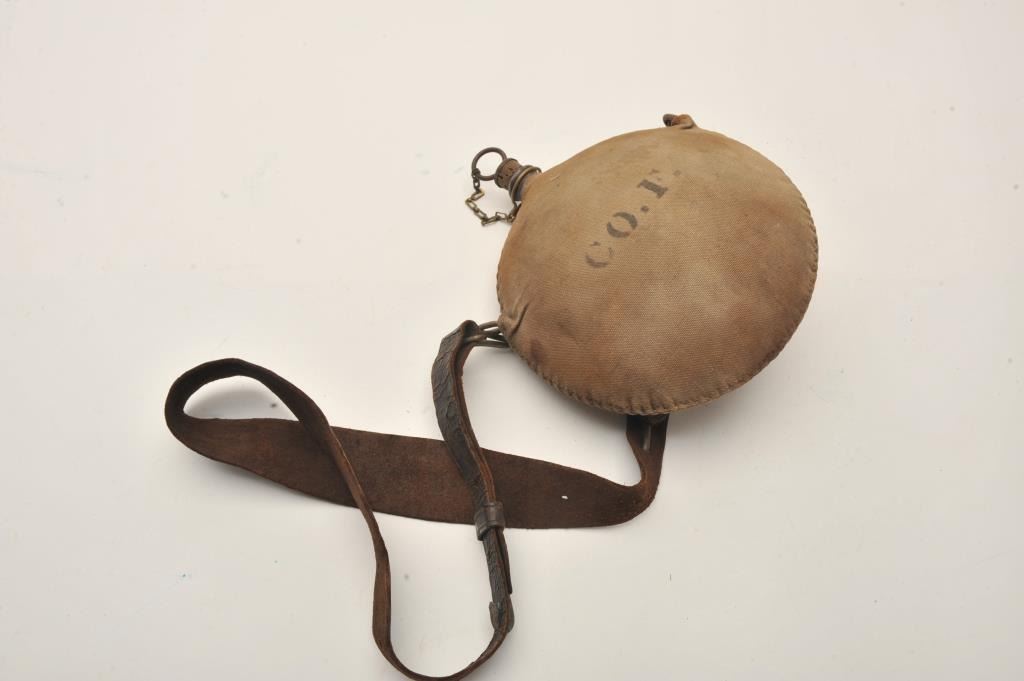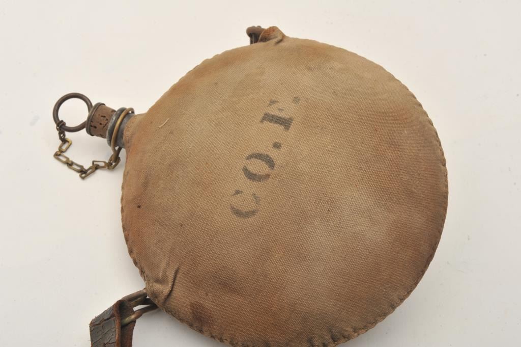Indian Wars era tin circular canteen with tan canvas cover showing a stenciled 8 I with crossed rifles/U.S./30 on one side and Co. F on the other side; approximately 8” in diameter with cork stopper, metal top andsecuring chain; accompanied by a leather shoulder strap. Est.: $150-$300.