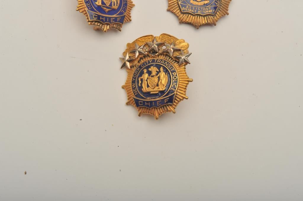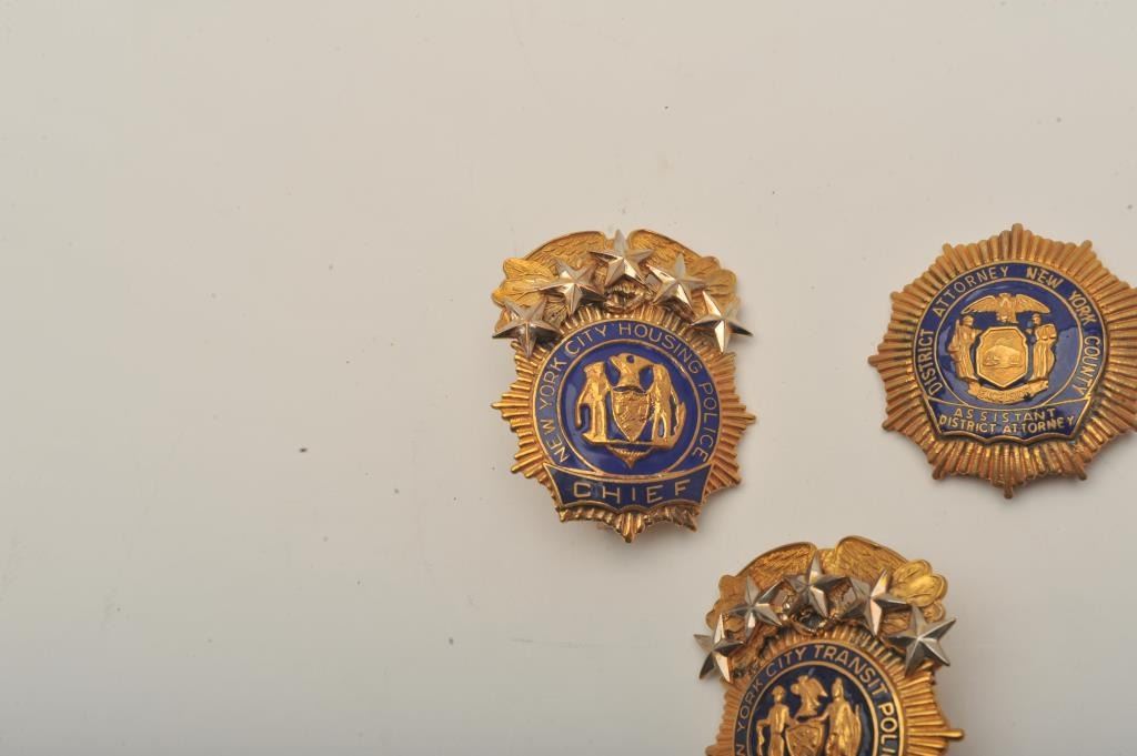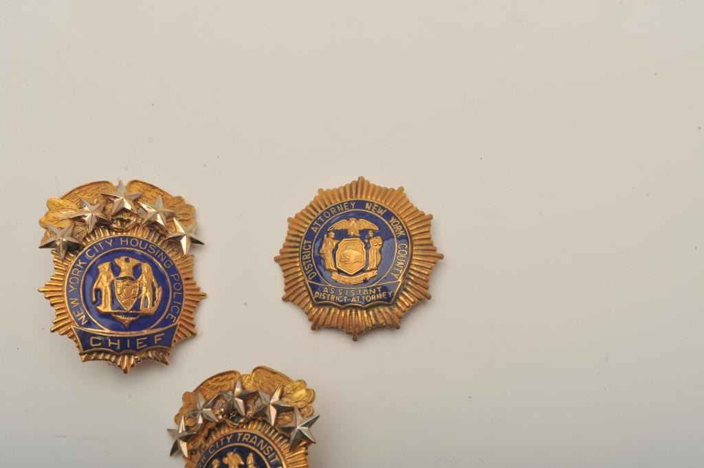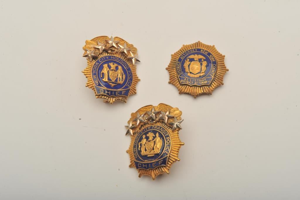 Lot of 3 badges including an Assistant District Attorney pin shield badge (New York County), a New York City Housing Police Chief’s cap badge and a New York City Transit Police Chief’s cap badge. Est.:$150-$300.