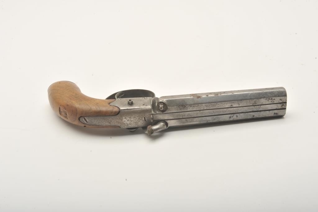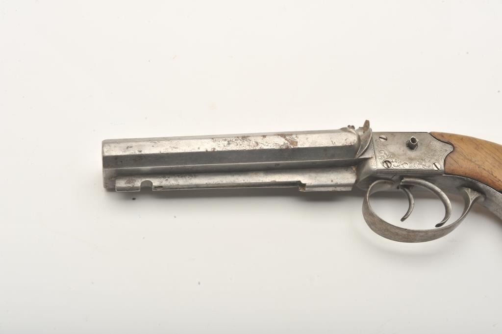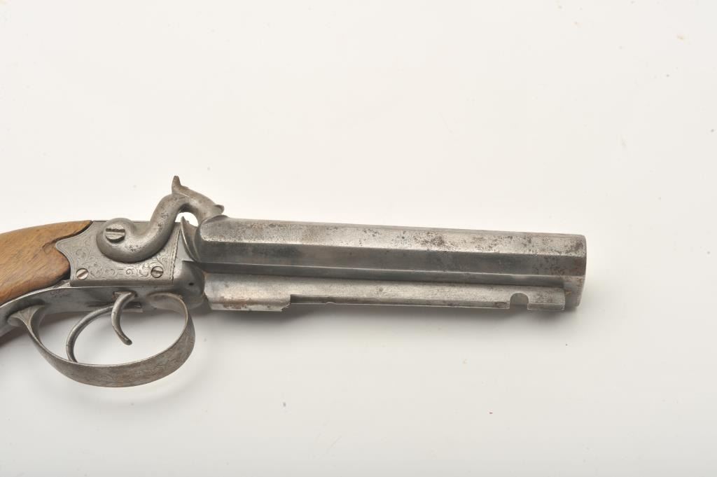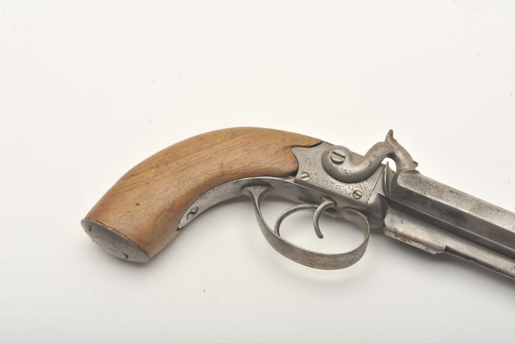 Double percussion SxS pistol by Sheath of London; no hammer on left side of frame, re-stocked wood grip; needs restoration. (Antique). Est.: $100-$200.