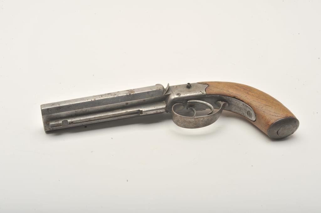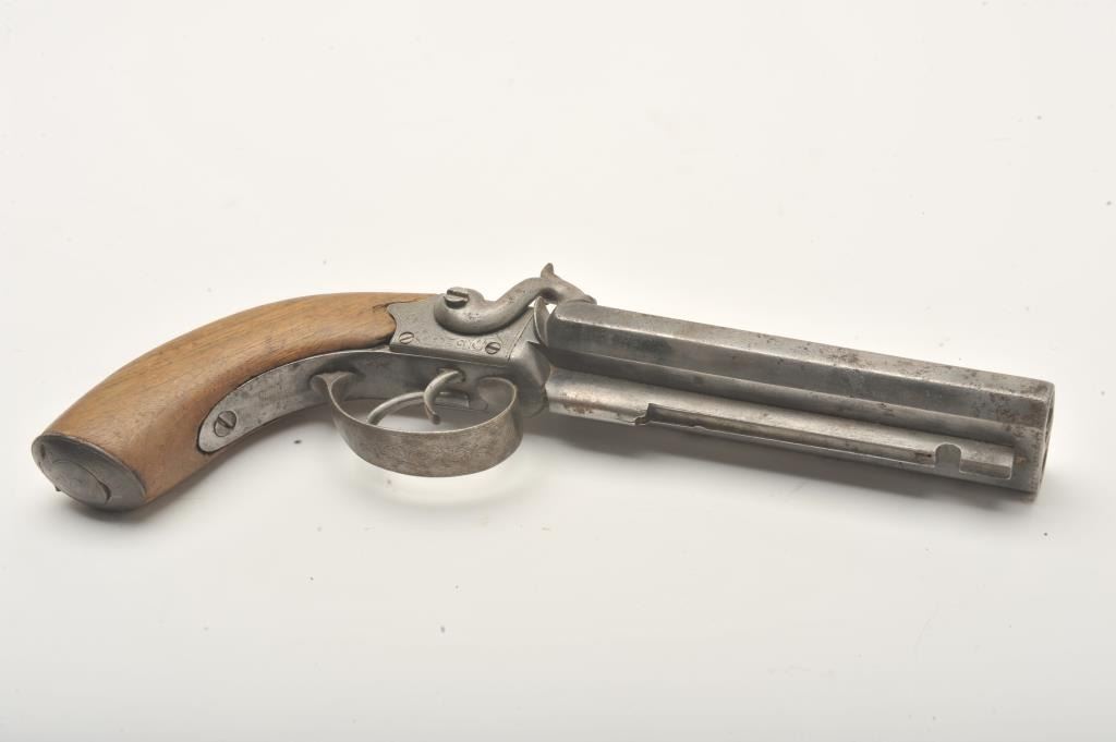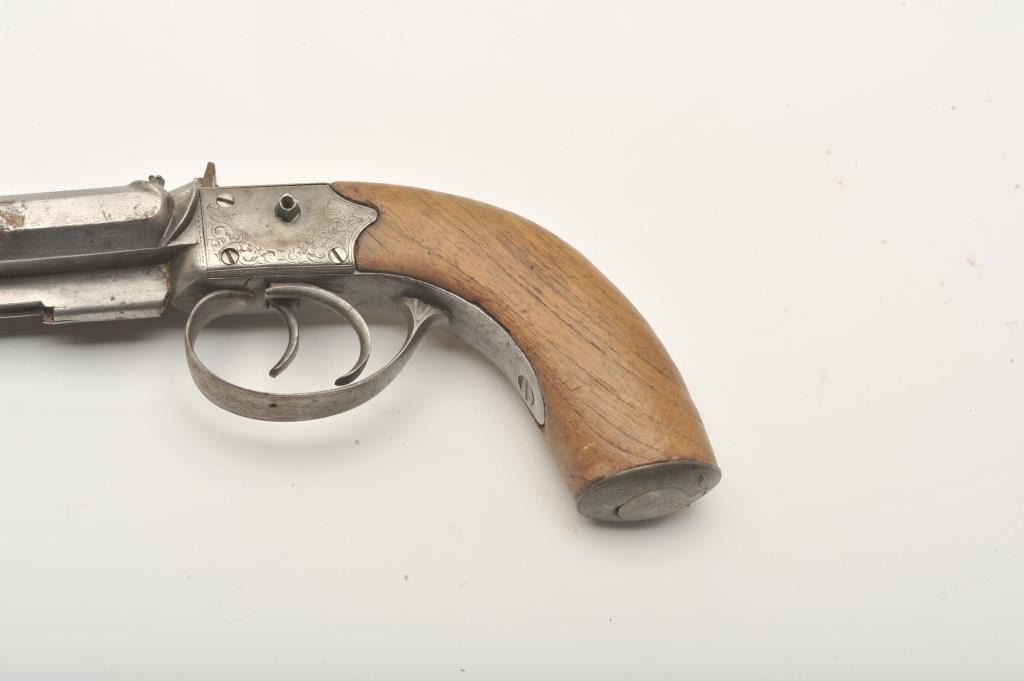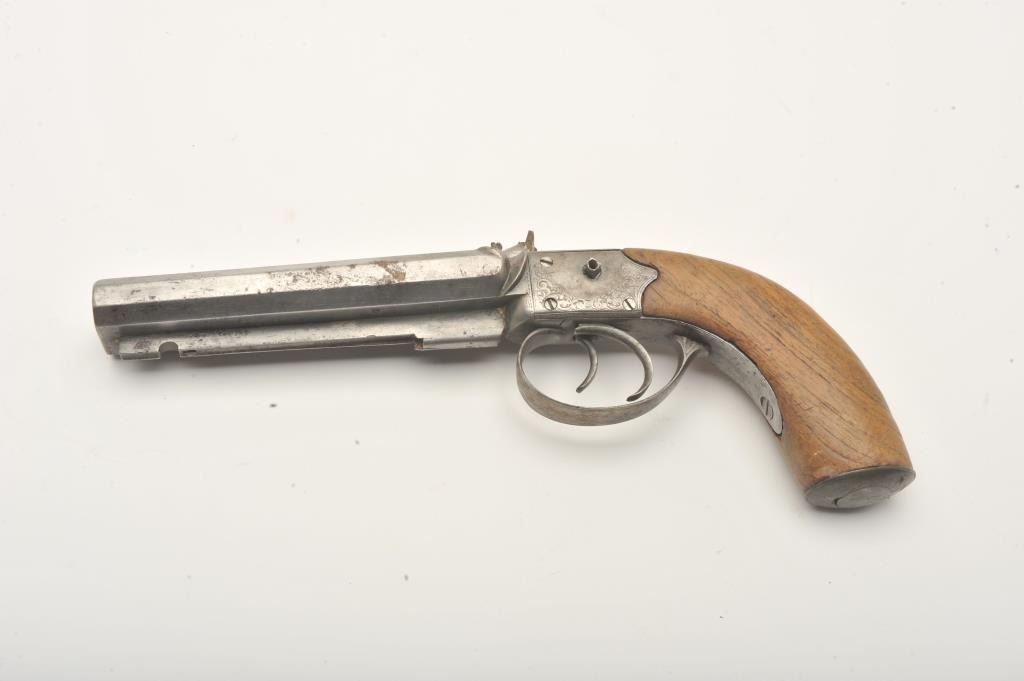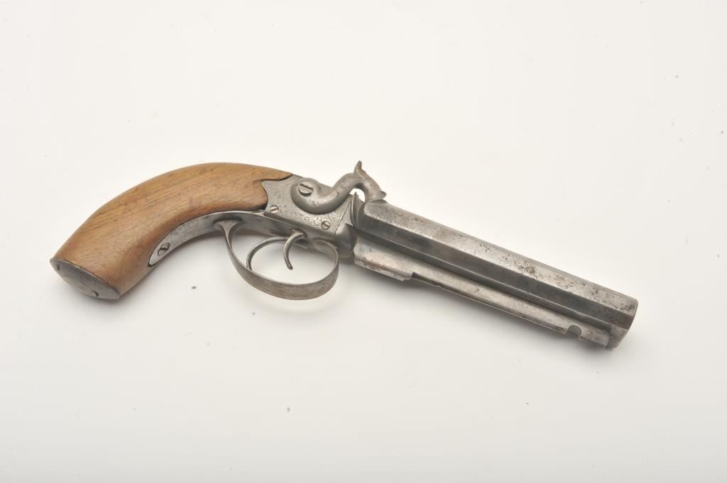 Double percussion SxS pistol by Sheath of London; no hammer on left side of frame, re-stocked wood grip; needs restoration. (Antique). Est.: $100-$200.