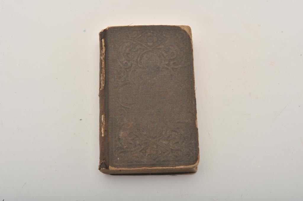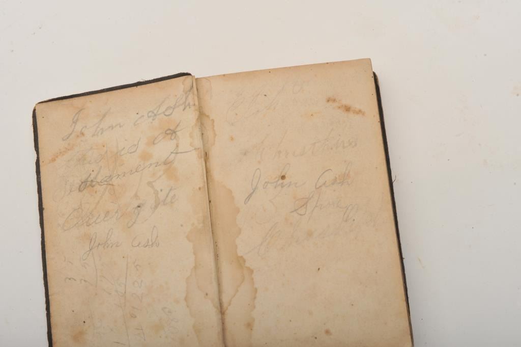 Pocket Bible dated 1859 with John Ash written in front along with other writings; per consignor, carried in the American Civil War. Est.: $100-$200.