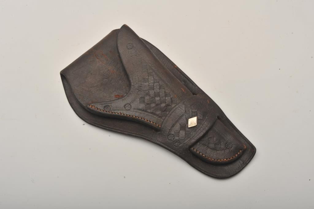 Single loop tooled leather holster with metal diamond set in loop; overall good condition showing even wear. Est.: $100-$200.