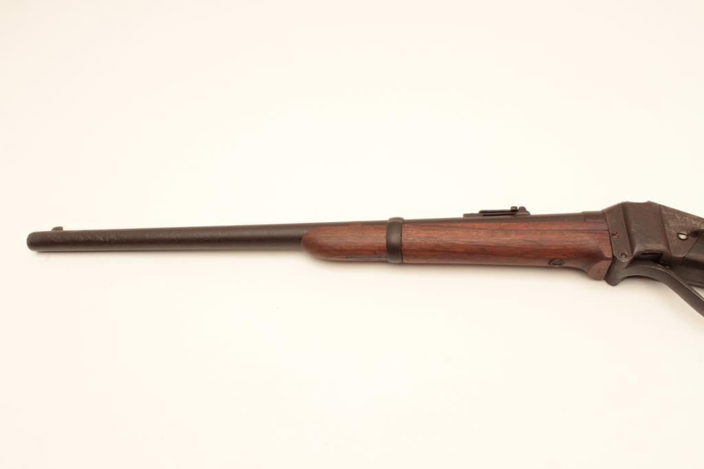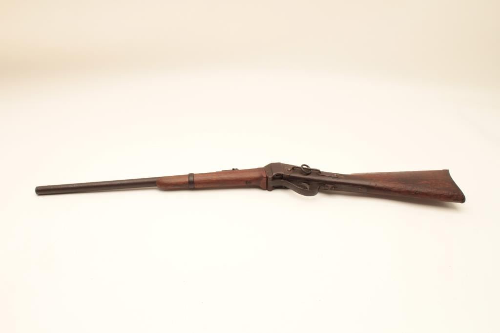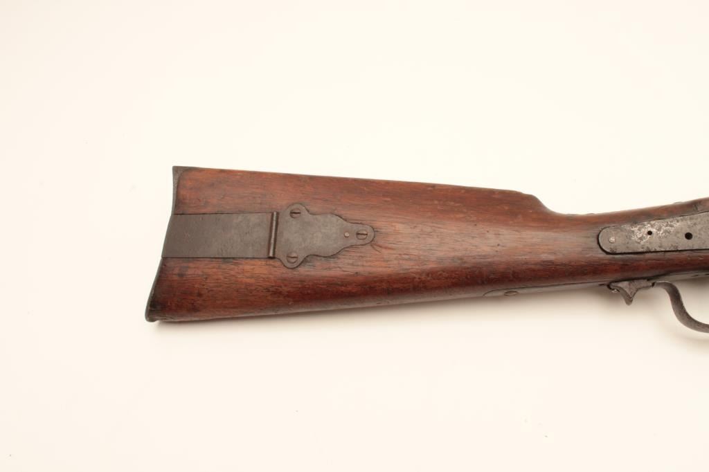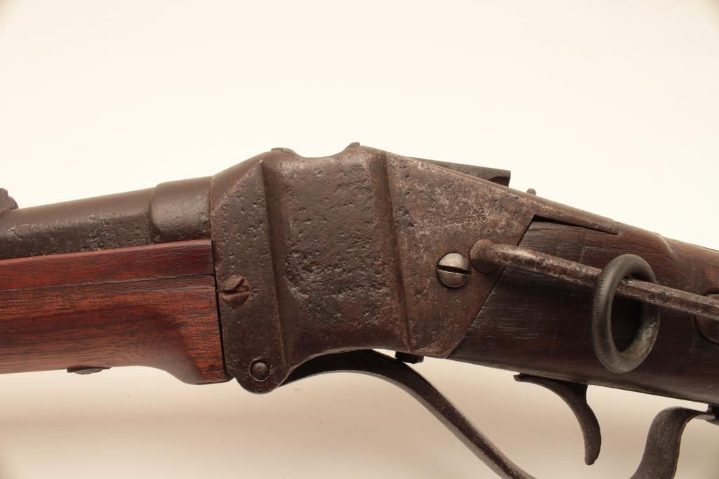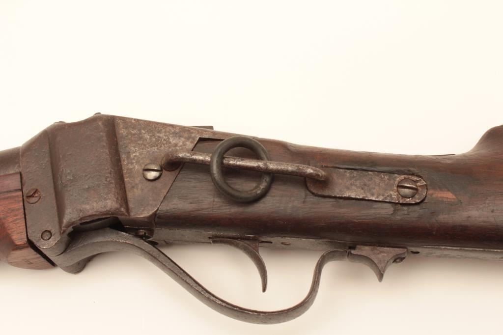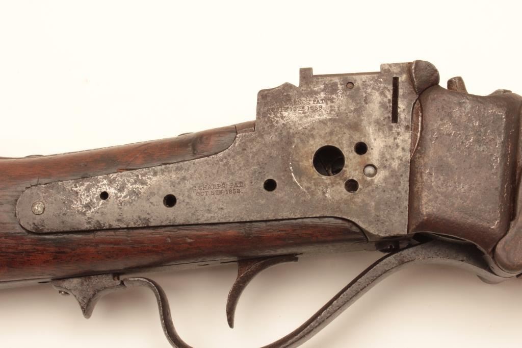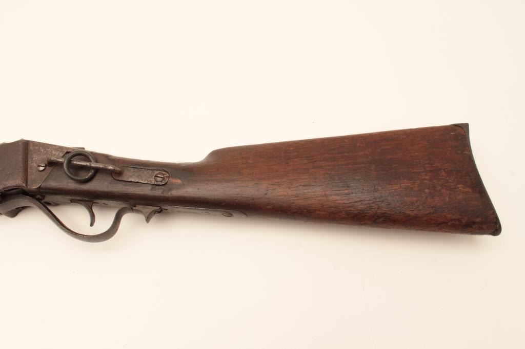 Sharps New Model 1859 saddle ring percussion carbine, approximately .56 caliber, Serial #48078. The carbine is in fair overall condition with a 22” barrel. The barrel is a dark brown patina with moderate surfaceerosion the entire length of the barrel. The receiver is also a brown patina with some light to moderate pitting on the left side. The action is missing the hammer assembly but retains the saddle ring and bar. The smooth wood stocks are in fair condition showing significant wear and use with mars, dents and compressions. The iron patch box is intact and the butt ends with a steel butt plate. The bore is rough, the action in need ofrepairs and the markings are legible. Est.: $300-$600. (Antique).
