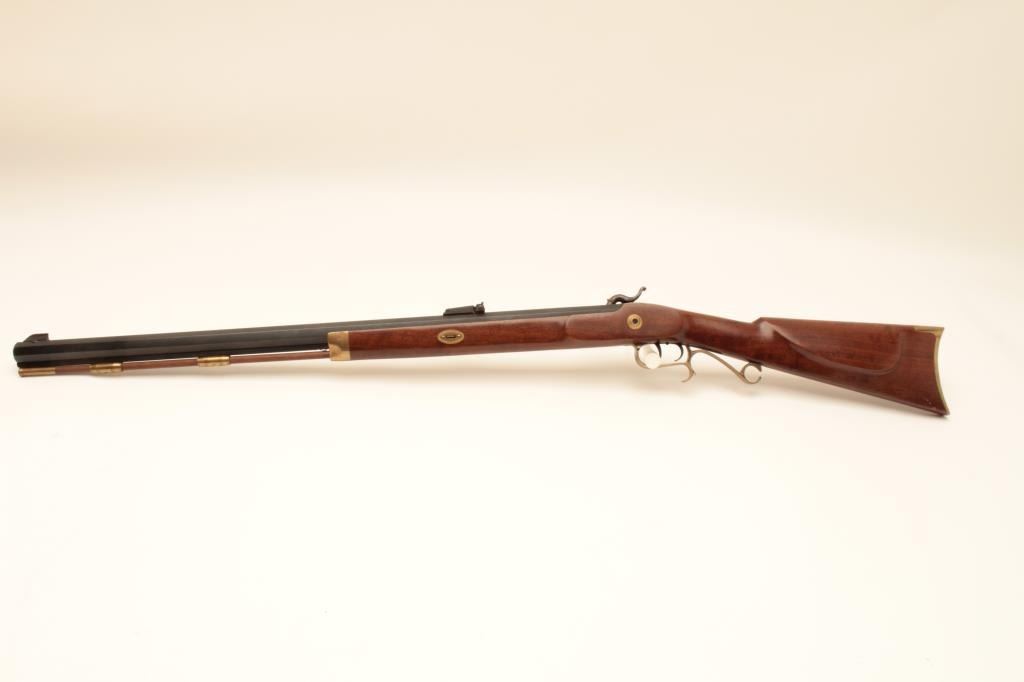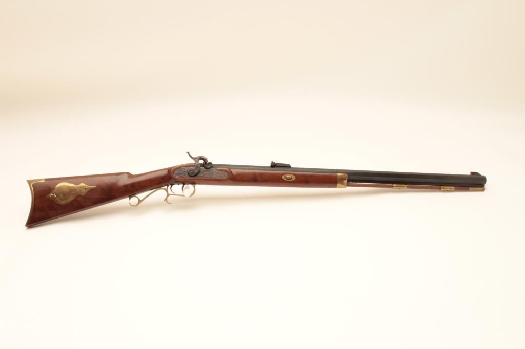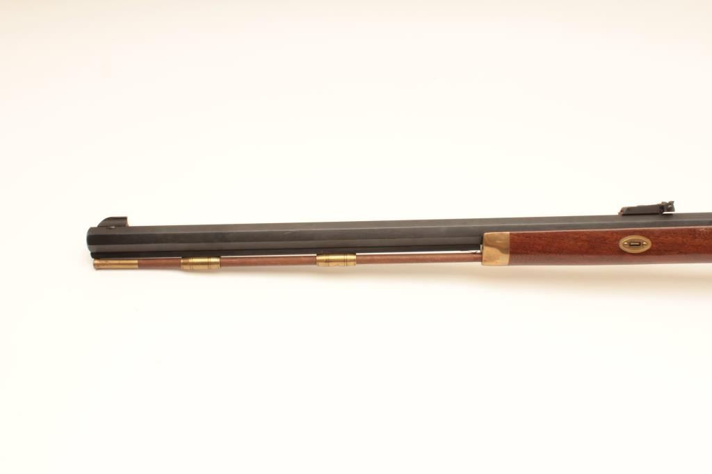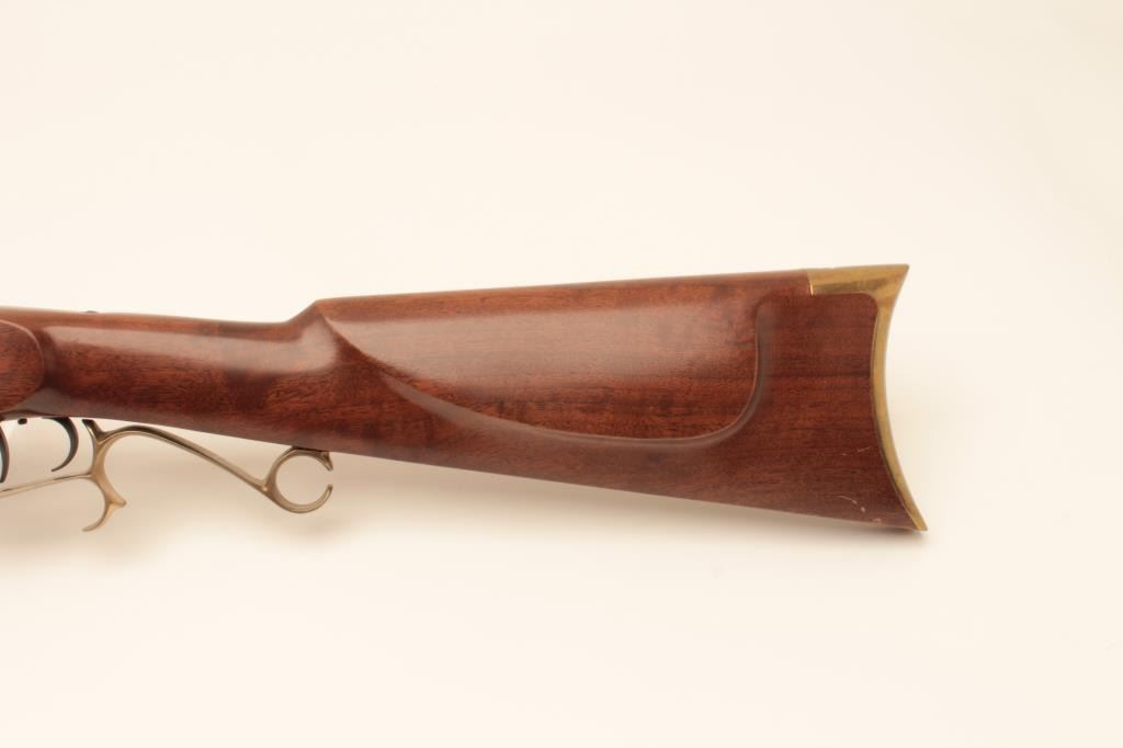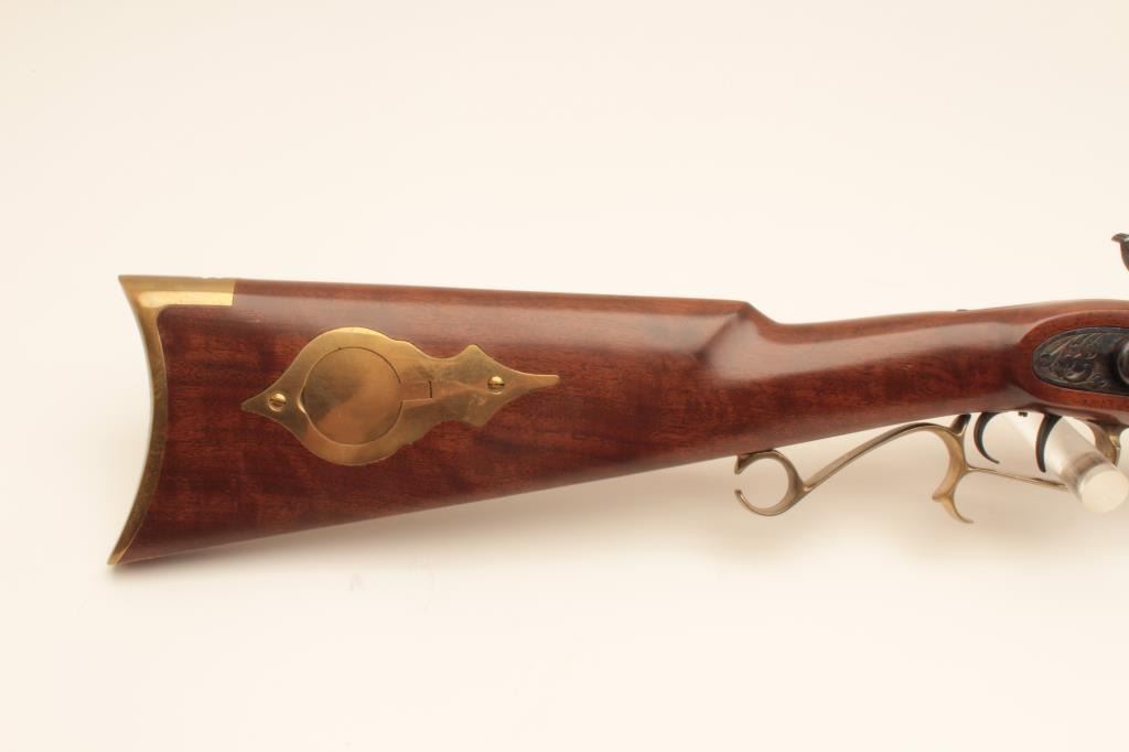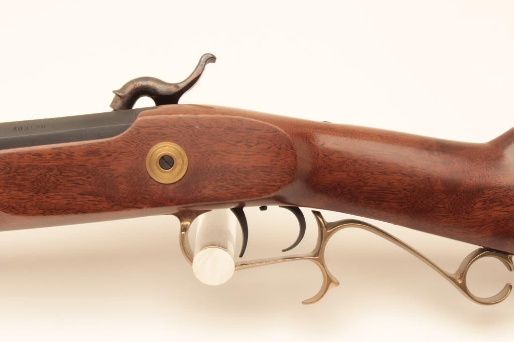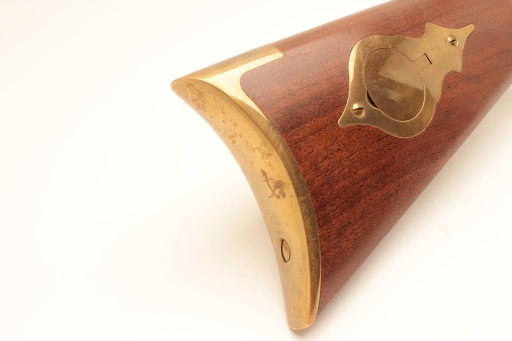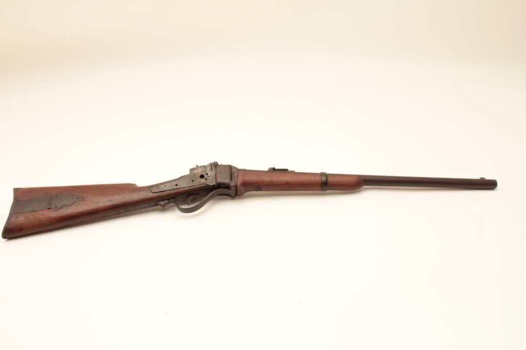 Sharps New Model 1859 saddle ring percussion carbine, approximately .56 caliber, Serial #48078. The carbine is in fair overall condition with a 22” barrel. The barrel is a dark brown patina with moderate surfaceerosion the entire length of the barrel. The receiver is also a brown patina with some light to moderate pitting on the left side. The action is missing the hammer assembly but retains the saddle ring and bar. The smooth wood stocks are in fair condition showing significant wear and use with mars, dents and compressions. The iron patch box is intact and the butt ends with a steel butt plate. The bore is rough, the action in need ofrepairs and the markings are legible. Est.: $300-$600. (Antique).