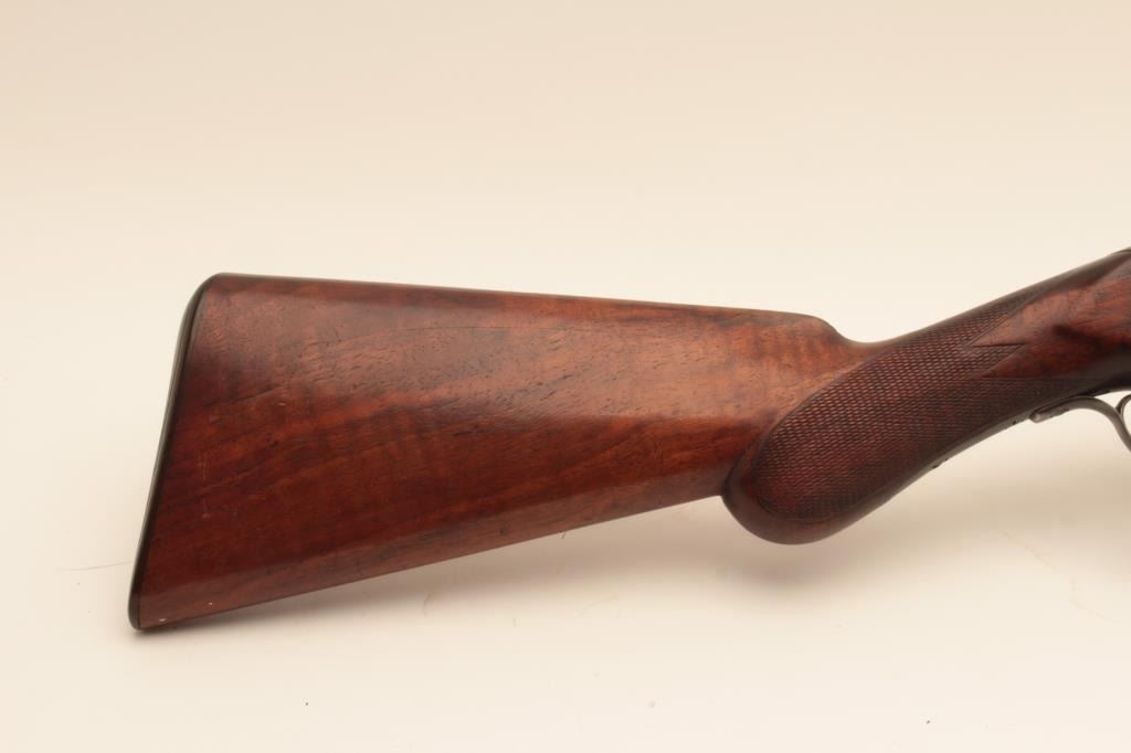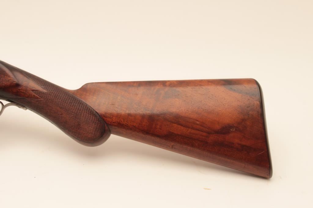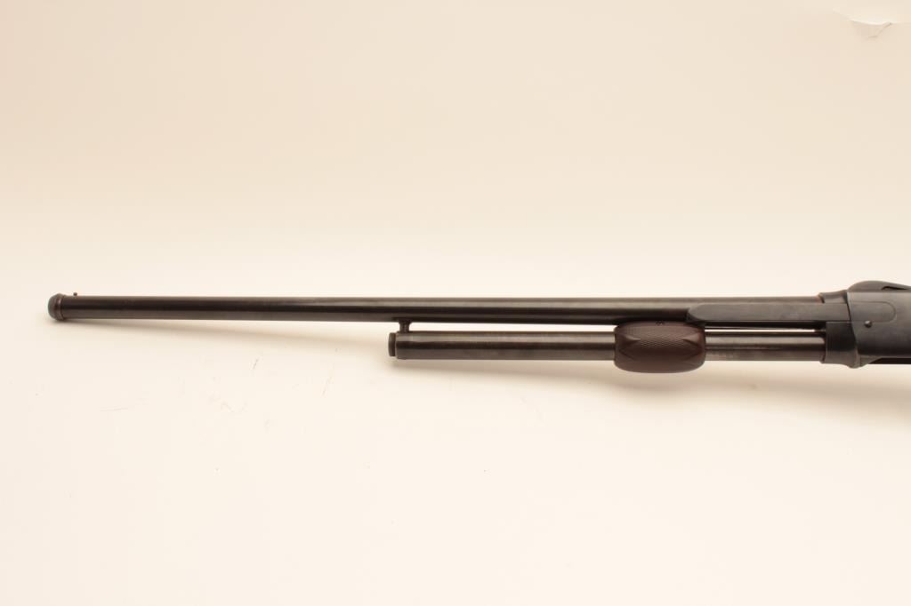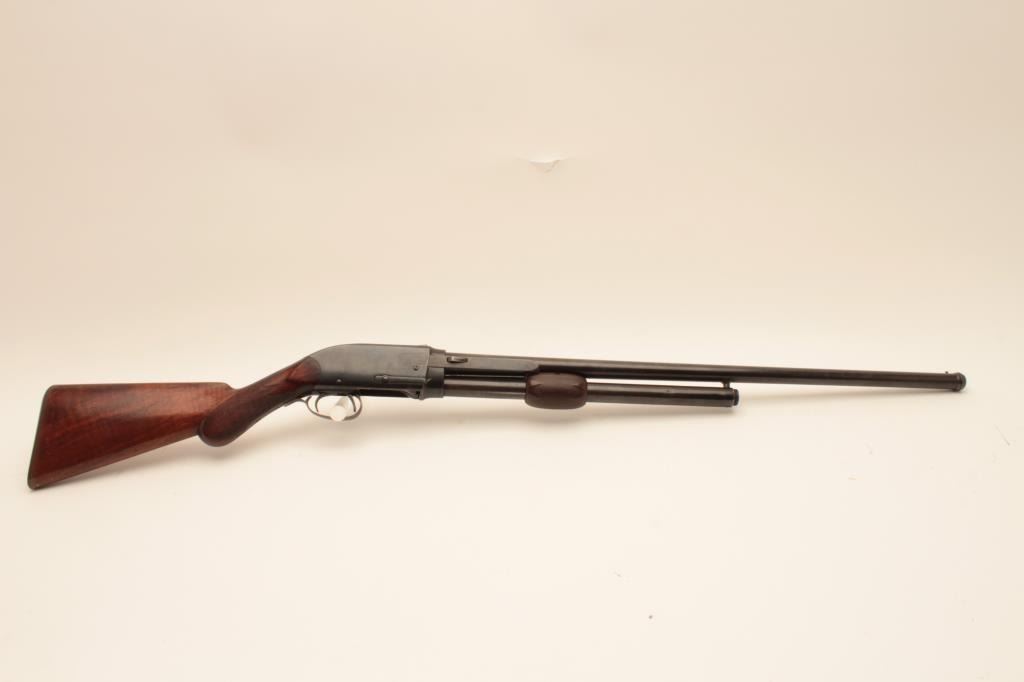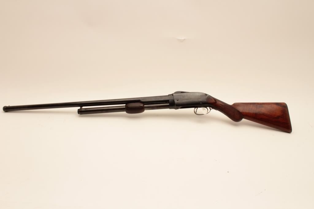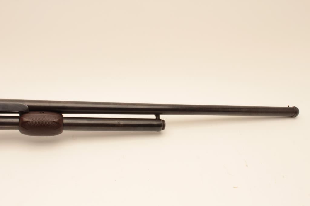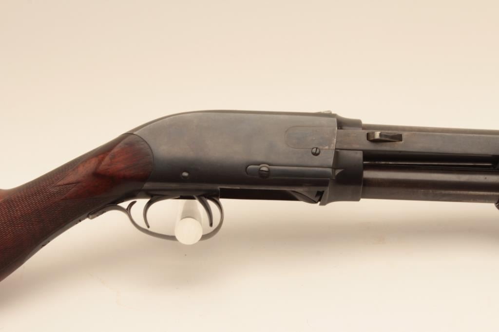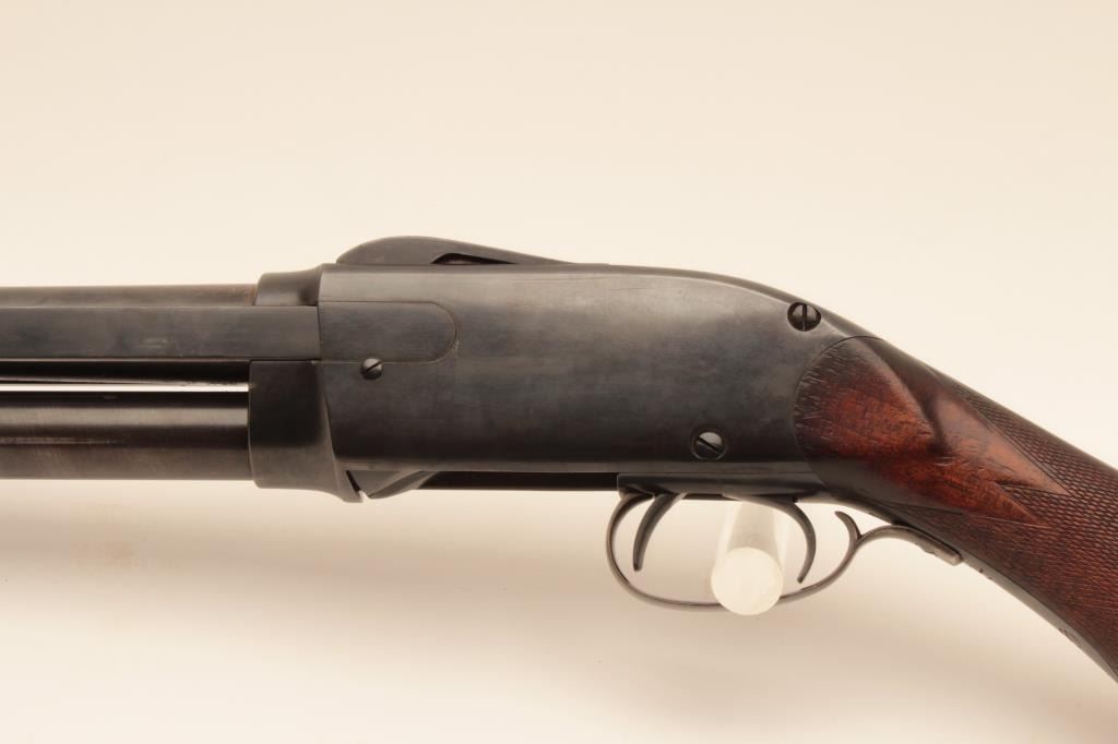 Spencer Arms Co. 12GA pump action shotgun with 26” modified choked barrel showing “roper” style ring at the muzzle, S/N 647. 90%-95% original blue finish with very good hard rubber fore end. Nicely checkered select wood stock in very good condition. Original length with original butt plate. Excellent mechanically with bright bore. A very nice example seldom seen this pristine. Est.: $350-$700
