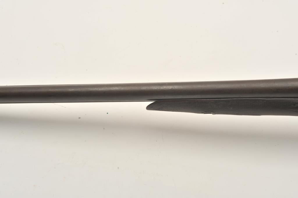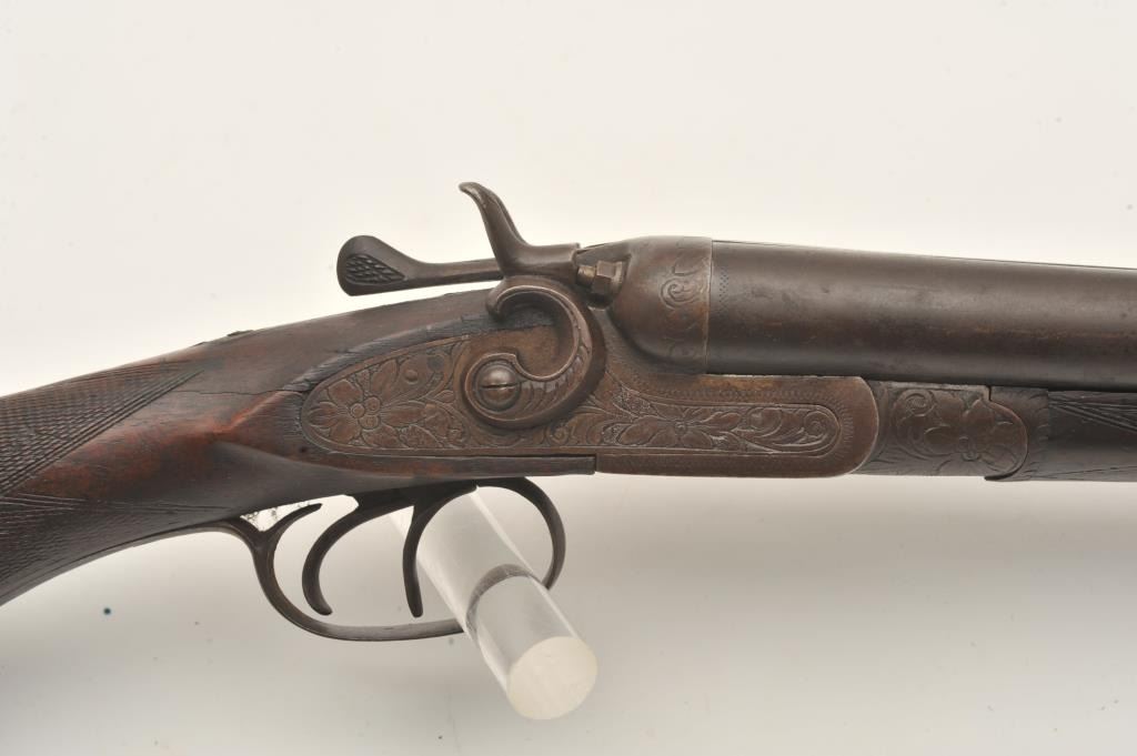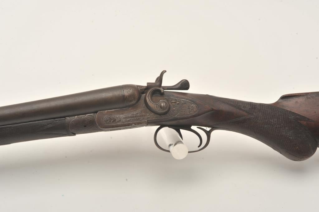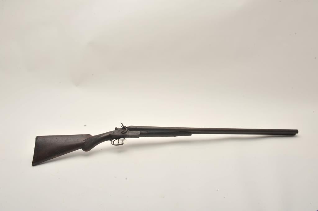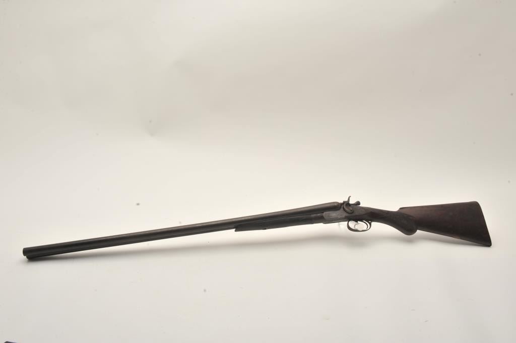 Stanley Arms Co. SxS exposed hammers shotgun, 12 gauge, 32” damascus barrels, checkered wood stocks, double triggers, S/N 5278, overall good un-cleaned condition with dark patina to metal surfaces, engraved receiver,overall good bores, crisp actions, fair to good wood with scattered old mars and dings from carry and storage; small old crack at top of wrist. (Antique). Est.: $150-$250.