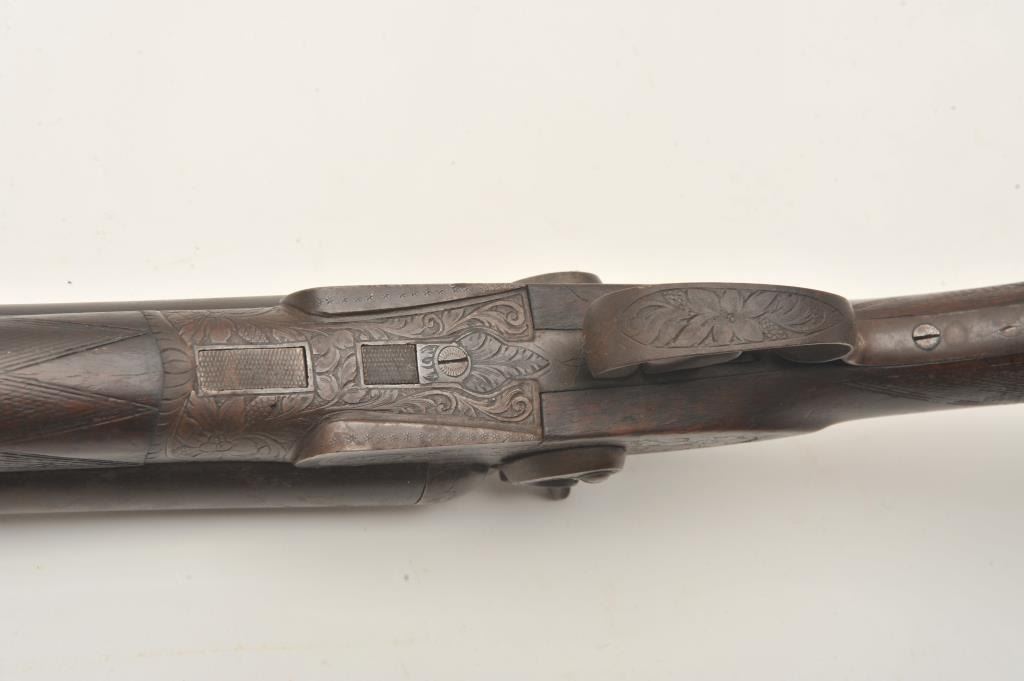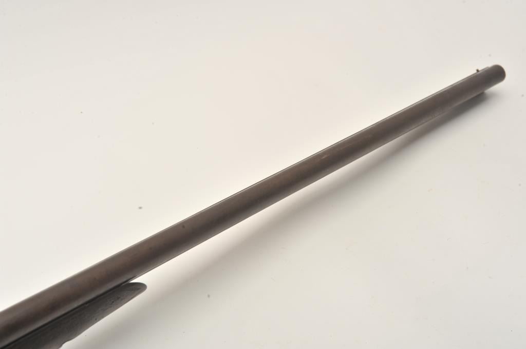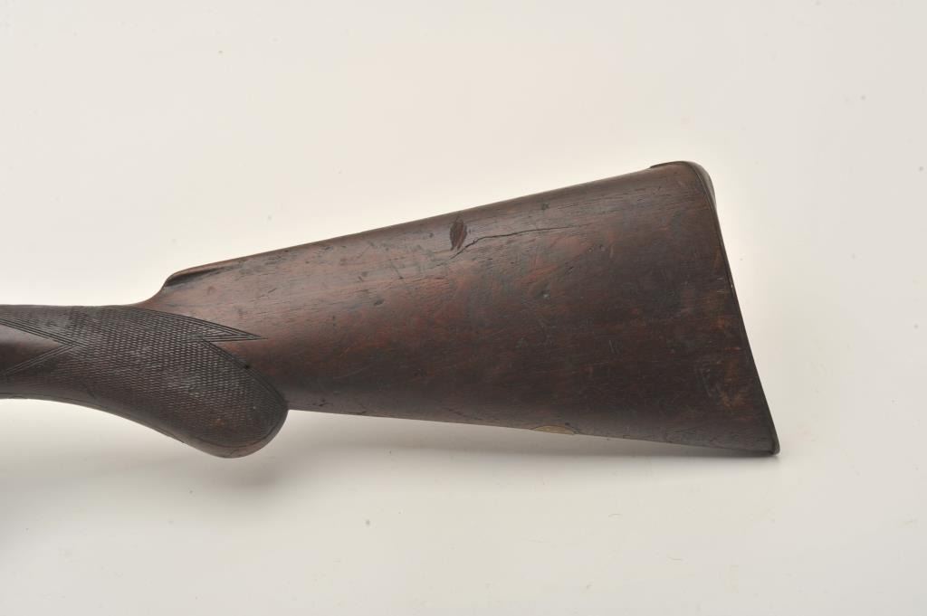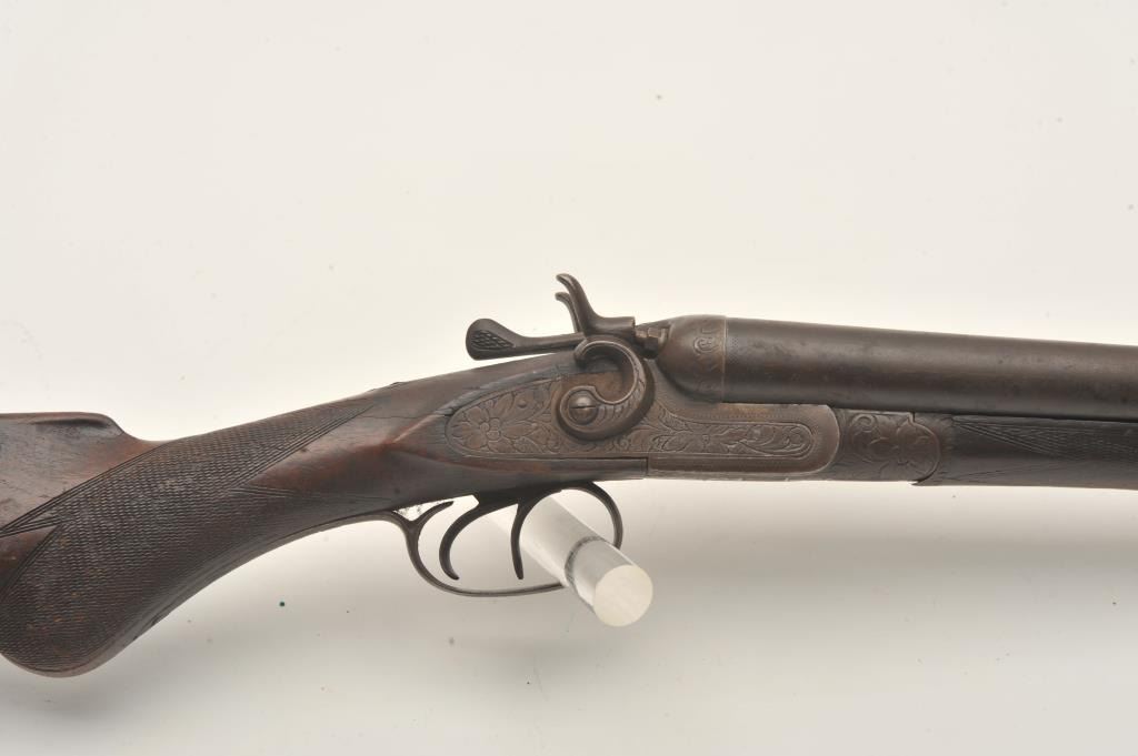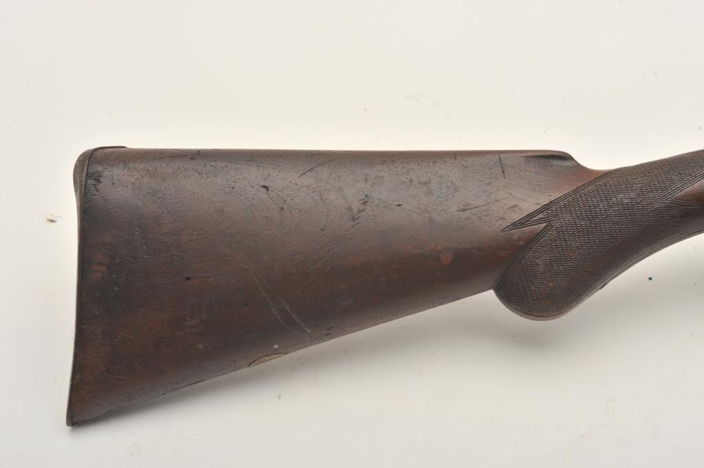 Stanley Arms Co. SxS exposed hammers shotgun, 12 gauge, 32” damascus barrels, checkered wood stocks, double triggers, S/N 5278, overall good un-cleaned condition with dark patina to metal surfaces, engraved receiver,overall good bores, crisp actions, fair to good wood with scattered old mars and dings from carry and storage; small old crack at top of wrist. (Antique). Est.: $150-$250.