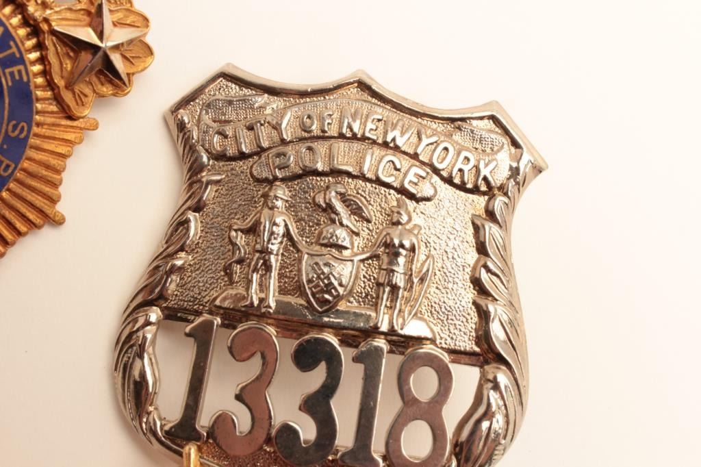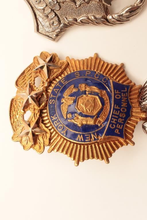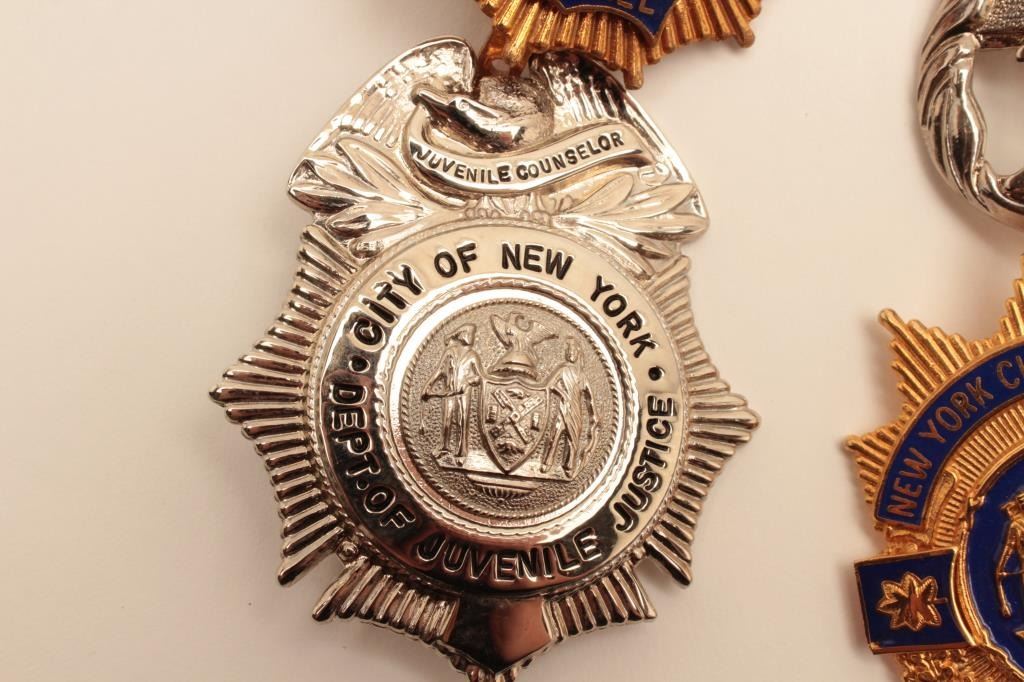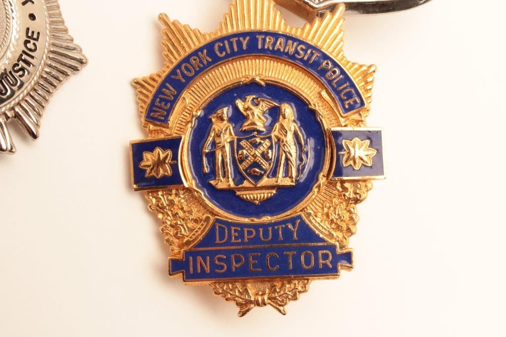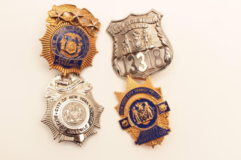 Lot of 4 badges including a New York State S.P.C.C. Chief of Personnel cap badge, a New York City Transportation Police Deputy Inspector cap badge, a City of New York Police #13318 cap badge and a City of NewYork Dept. of Juvenile Justice Juvenile Counselor pin shield badge (hallmark Blackinton). Est.: $200-$400.