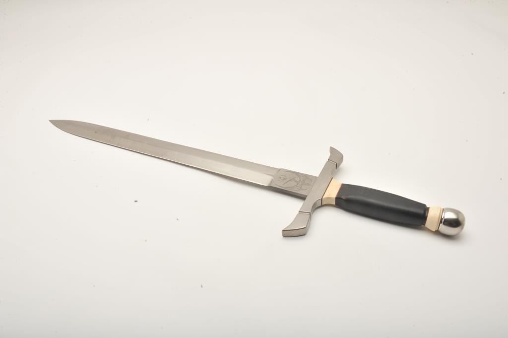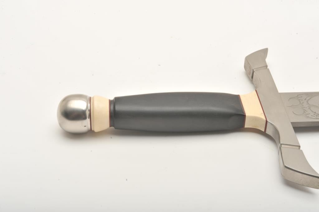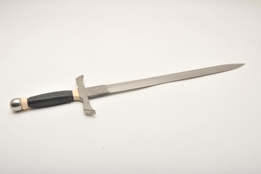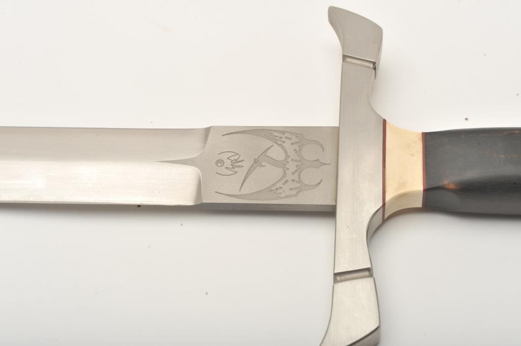 Custom short sword by Peter Marzitelli. The sword is 27” in overall length with a 20” blade. The sword is as new without a scabbard. The sword features a 7” guard in matte stainless with the Marzitelli emblem of a pterodactyl on the ricasso. The smooth ebony handle has ivory micarta inserts and ends with a round stainless pommel. The blade is in very good condition showing no sharpening. Est.: $300-$600.