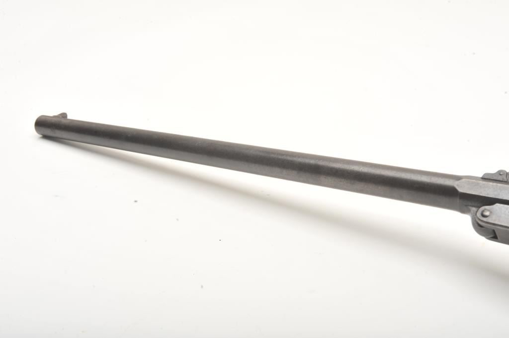 Maynard Model 1863 Saddle Ring percussion carbine, .50 caliber, Serial #711. The carbine is in good overall condition with a 20” round barrel. The barrel has gone to a plum brown patina with light to moderatesurface erosion and pin prick pitting in areas. The receiver has gone to a mottled grey patina with the saddle ring intact. The smooth wood stock is in fair condition showing heavy use with mars and dents, lossof wood at the tang and the smooth steel butt plate a bit proud at the toe. The stock has a nice cartouche behind the tang on the left side. The bore in fair, the action functions and the markings are sharp on thisCivil War era carbine. Est.: $600-$1,200. (Antique).