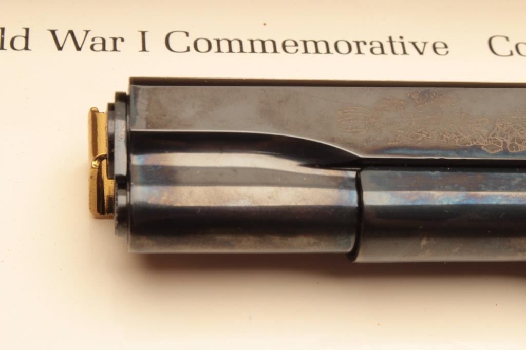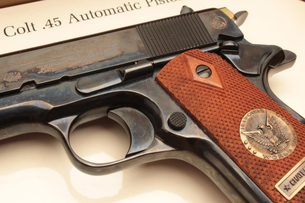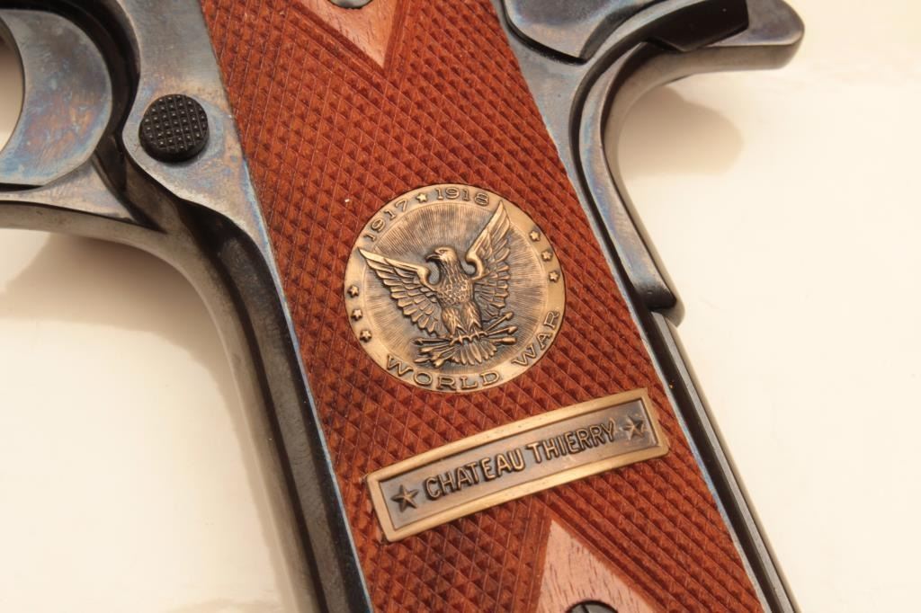 Colt 1911 WWI .45 Auto Commemorating “The Battle of Chateau Tierry”, S/N 4772CT. Fine to excellent condition with 98%-99% plus original finish. Slight firing and use. Case shows minor storage and aging. (C&R/PPT)Est.: $700-$1400