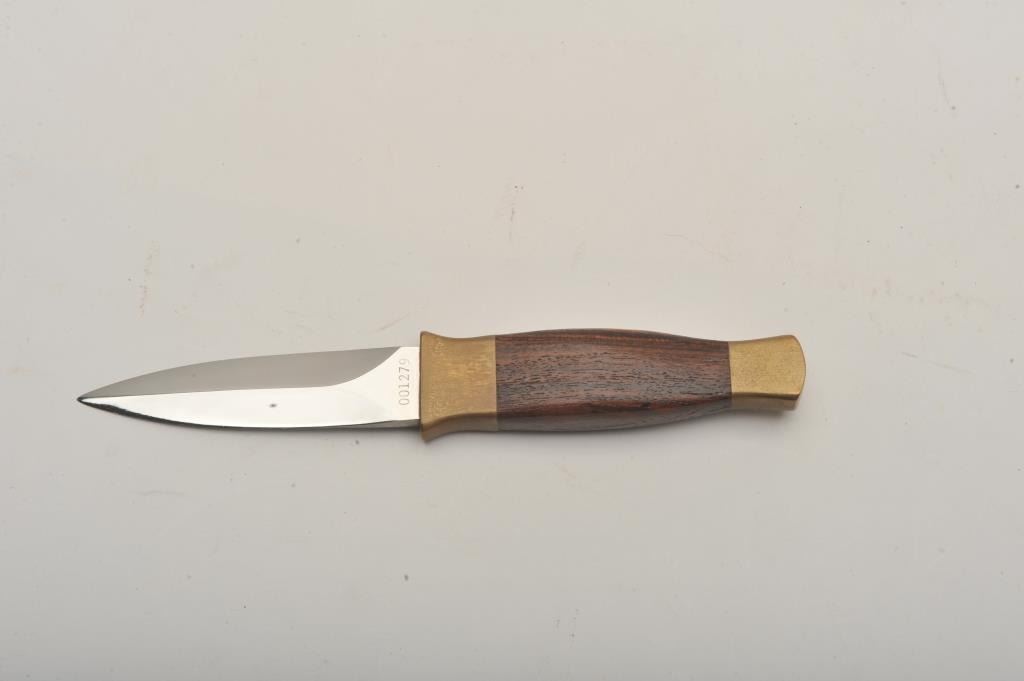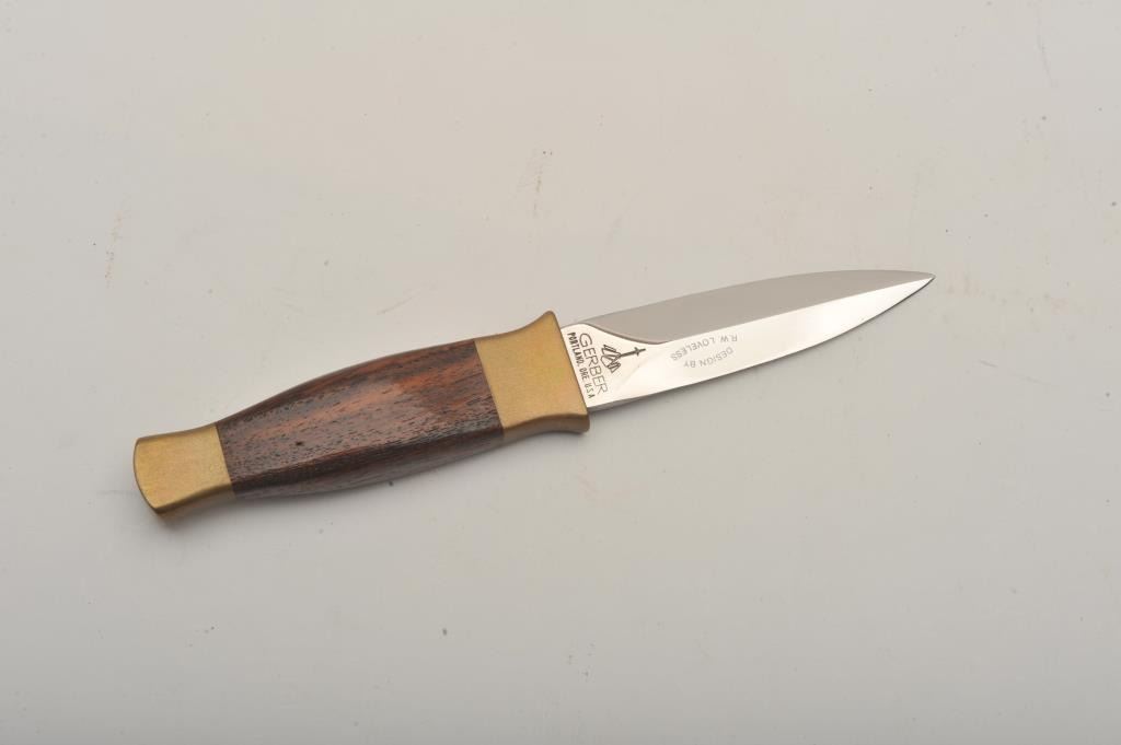Gerber fixed blade knife designed by R. W. Loveless. The knife is approximately 7” in length with a 3 ½” blade marked, “DESIGN BY R.W. LOVELESS”. The bolster and pommel are both matte brass with scales of smooth wood. A most attractive knife designed by one of the best. Est.: $100-$200.